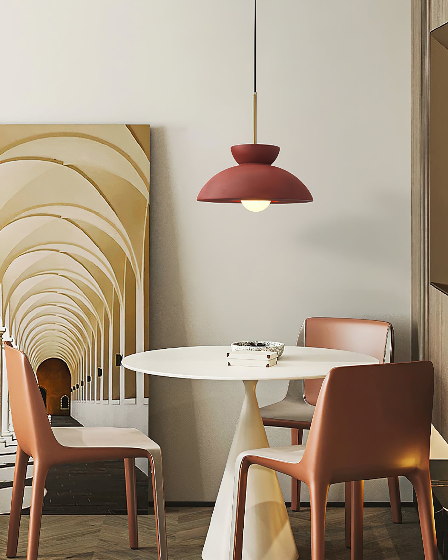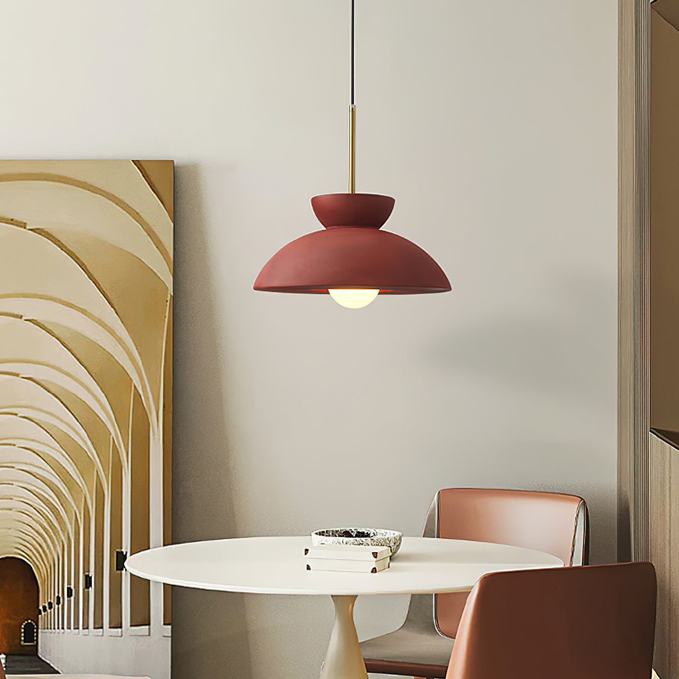 Bring a touch of elegance to your dining room with the Augustus Pendant Lamp from Mooijane. Made from high-quality resin, its unique inverted shape adds a playful element to your interior design while providing reliable lighting. With its fresh color, it is sure to elevate any room and give it a special touch.