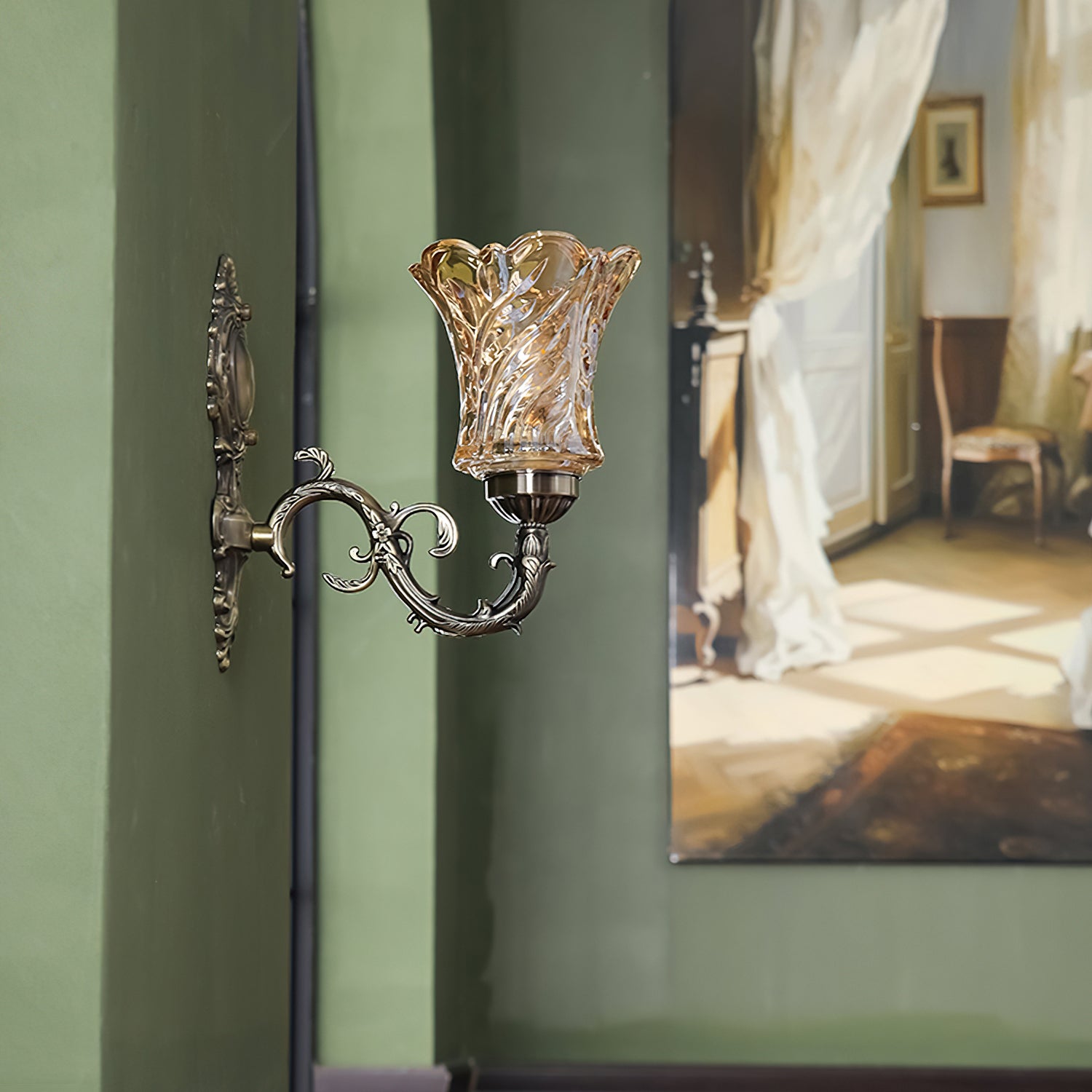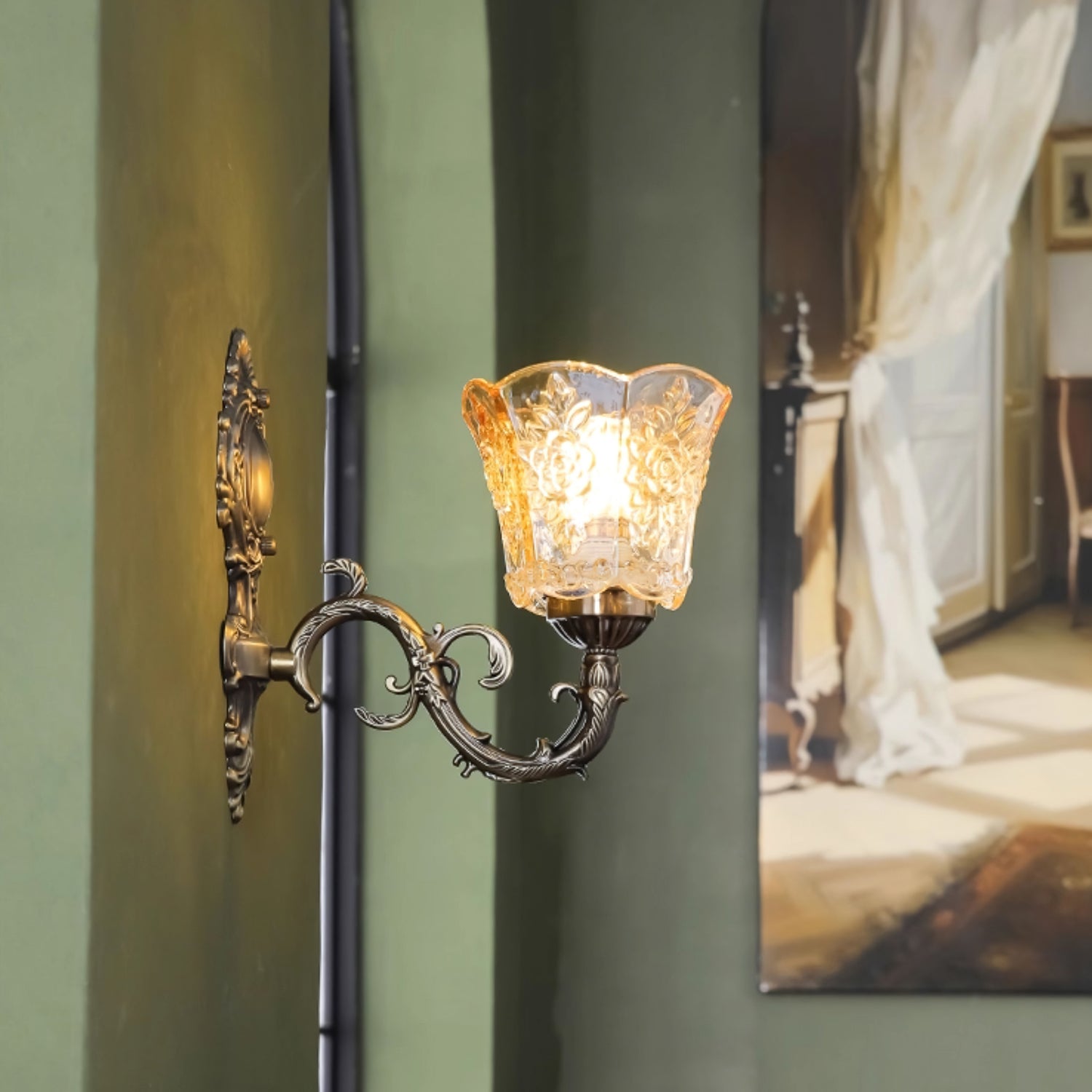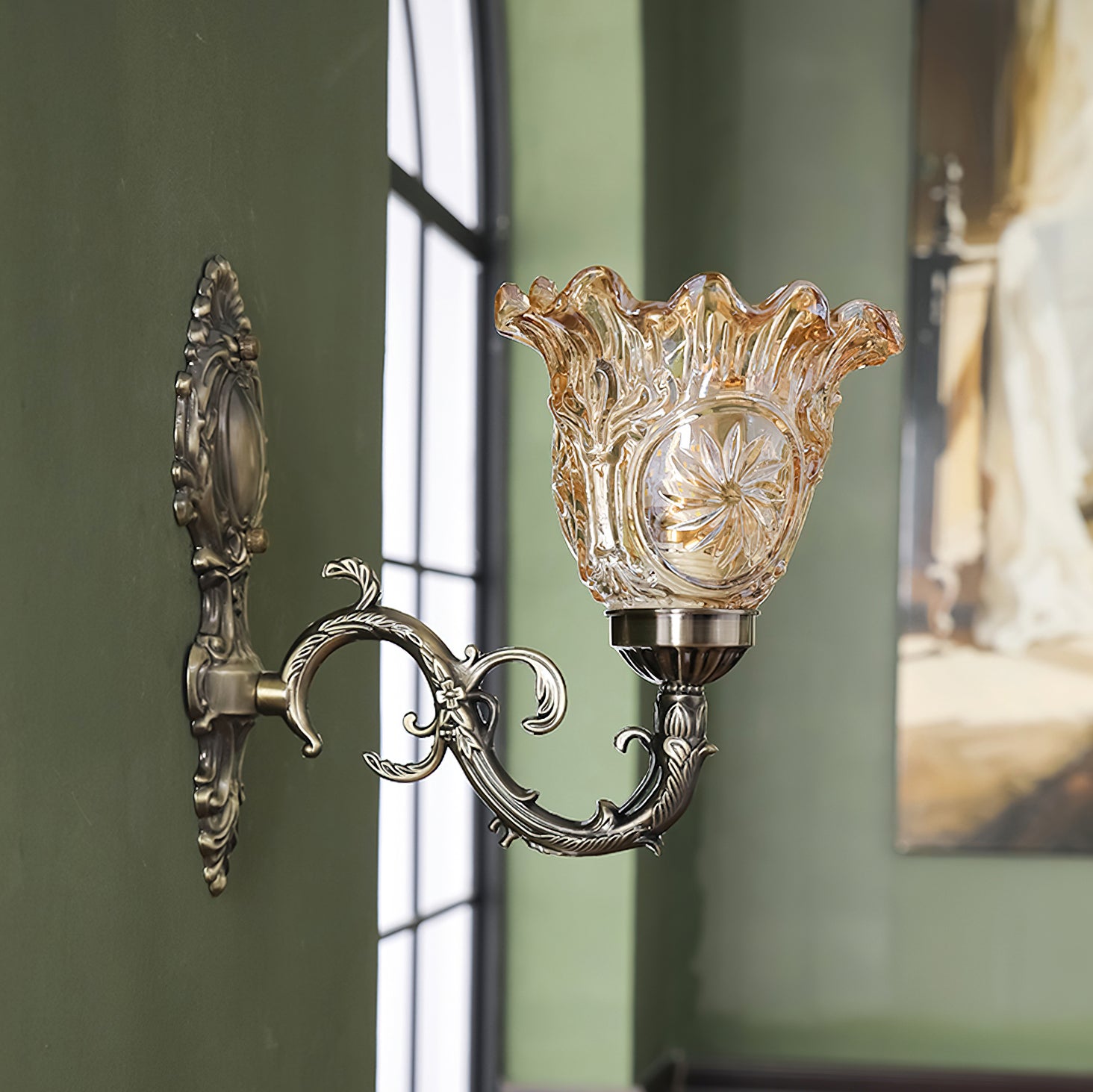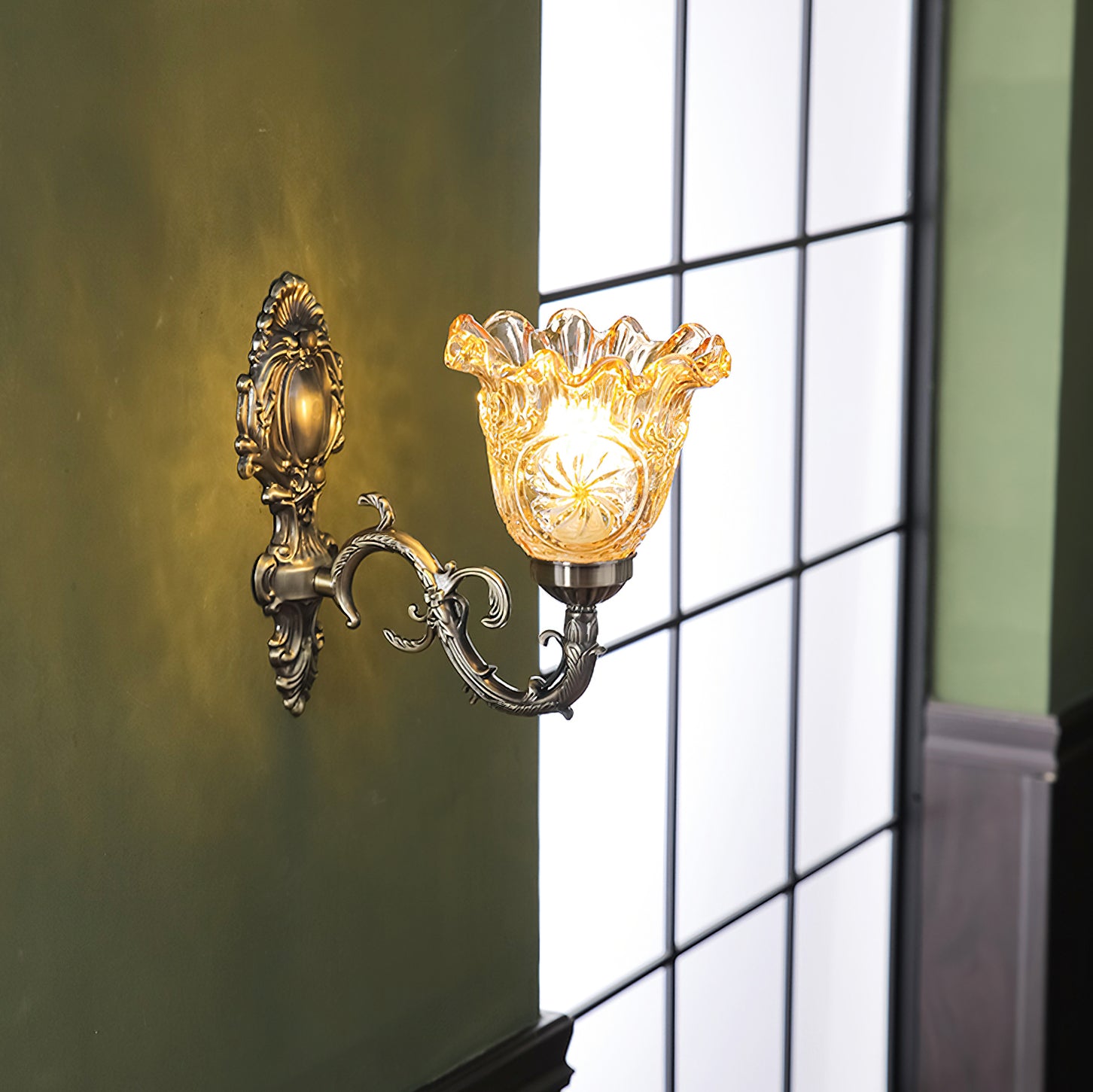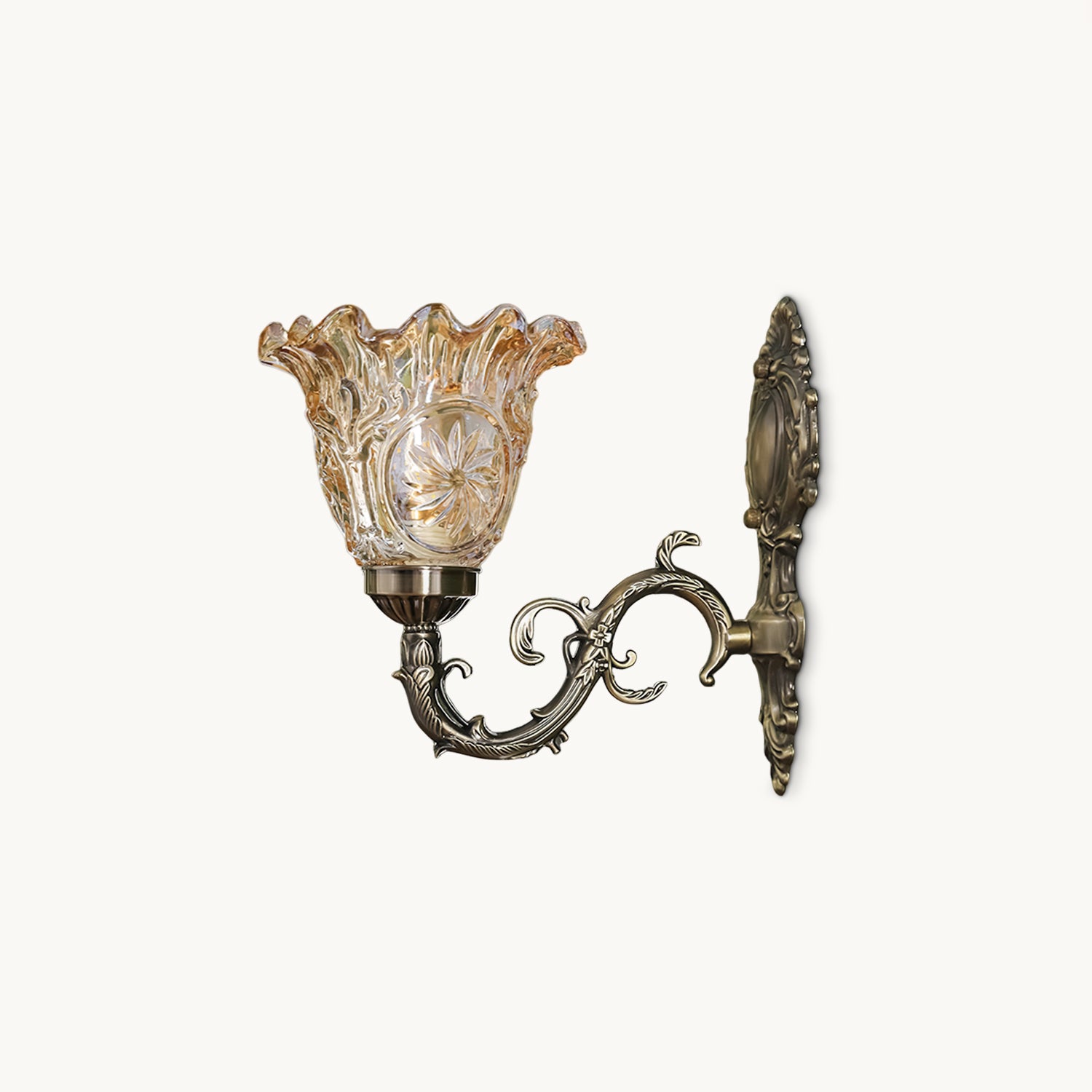 The Aveline wall lamp by Mooijane embodies vintage elegance with its refined blend of metal and glass. Its gracefully curved arms and petal-shaped glass shade create a soft, shimmering glow. This timeless lamp, with its sophisticated allure, will brighten any interior.
