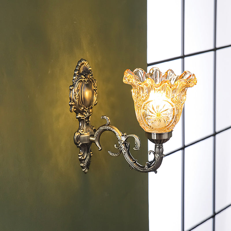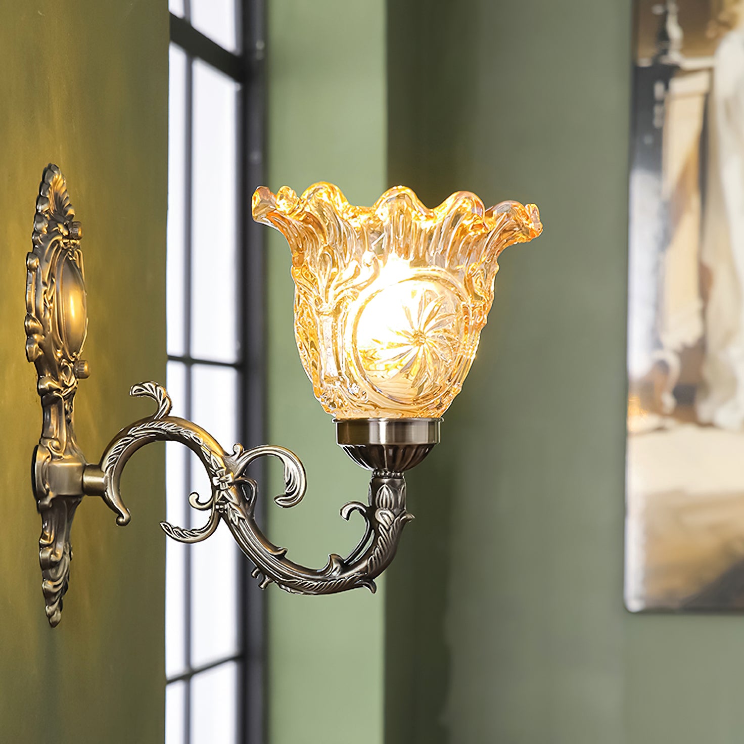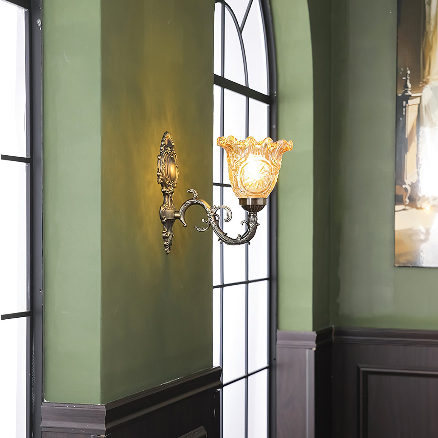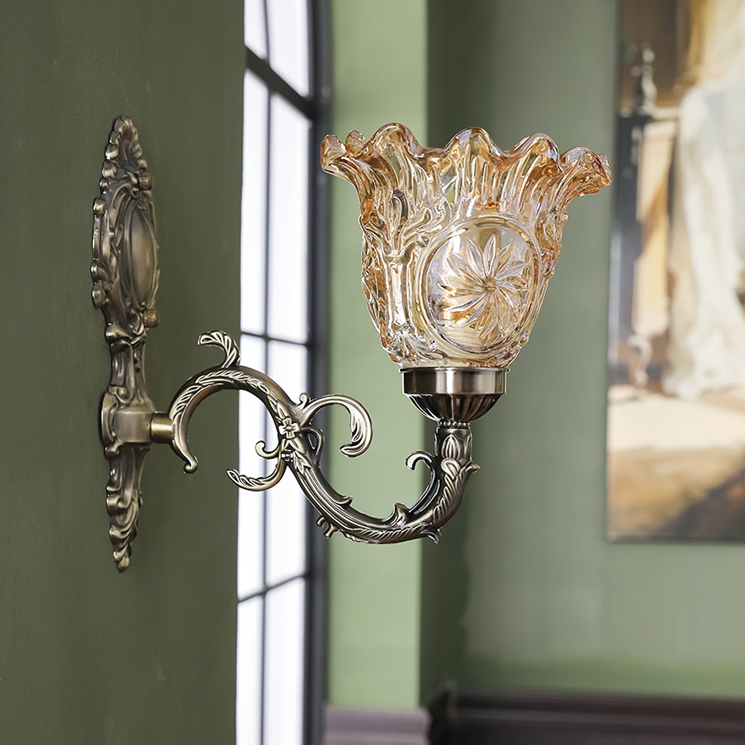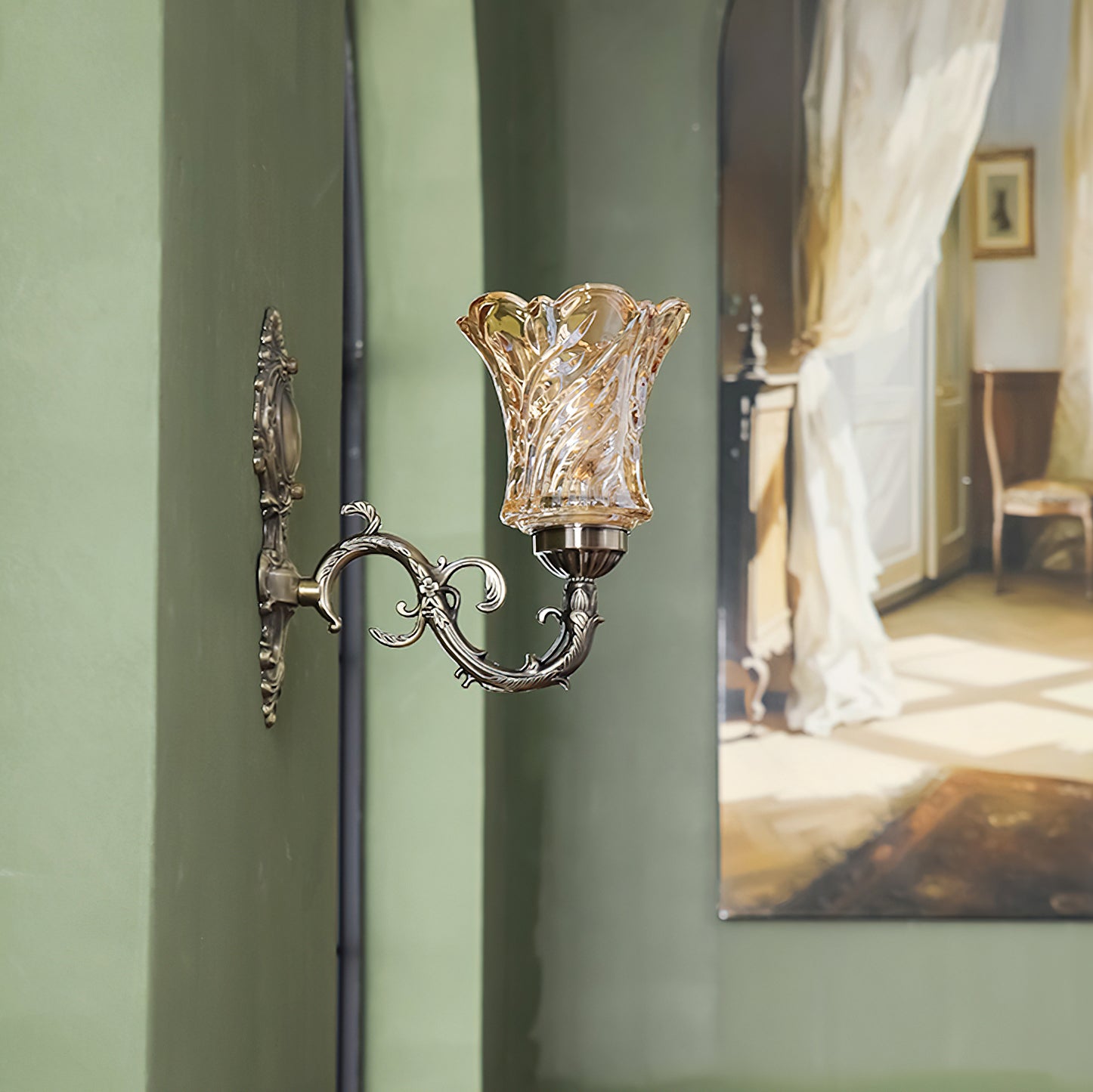 The Aveline wall lamp by Mooijane embodies vintage elegance with its refined blend of metal and glass. Its gracefully curved arms and petal-shaped glass shade create a soft, shimmering glow. This timeless lamp, with its sophisticated allure, will brighten any interior.