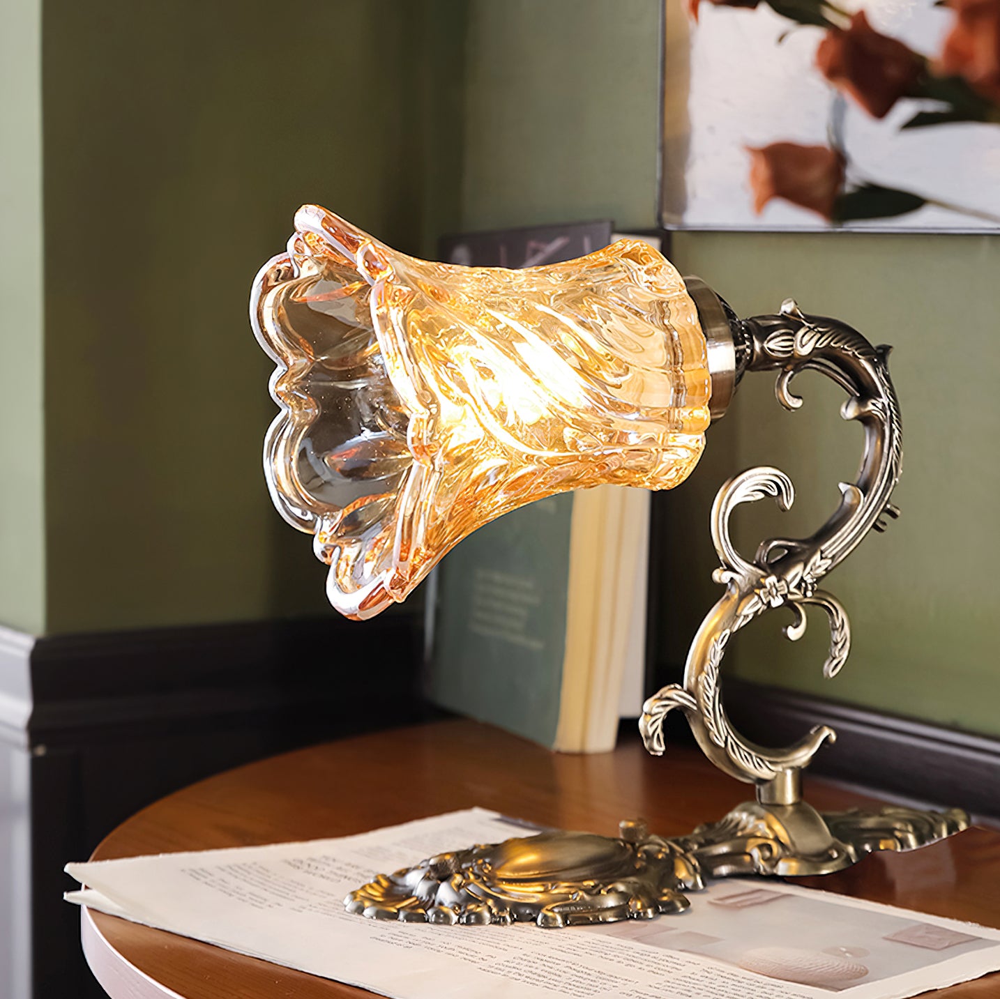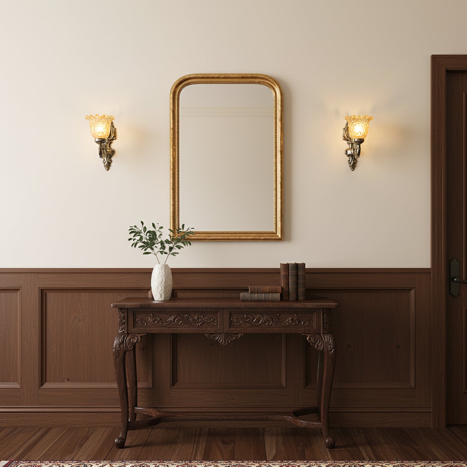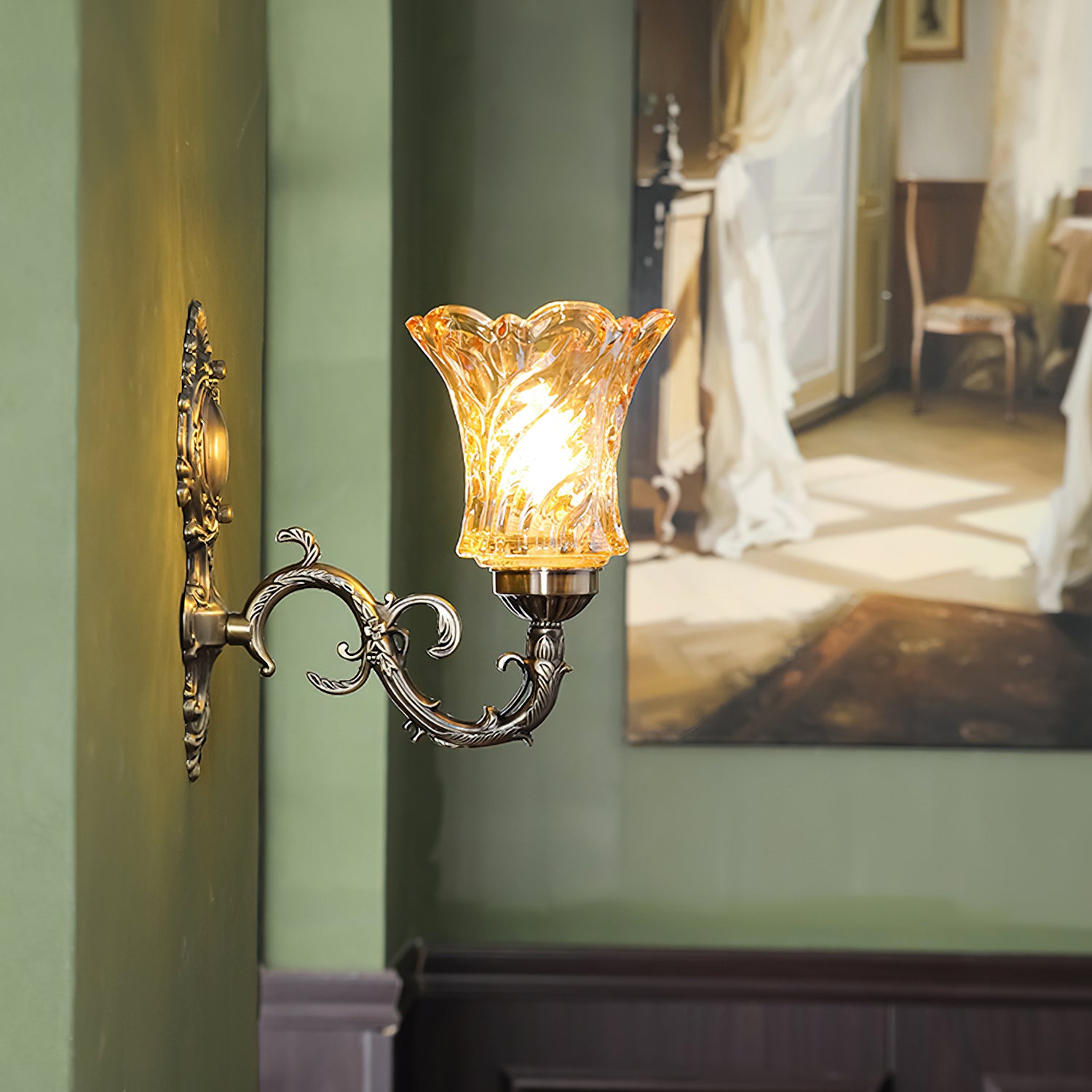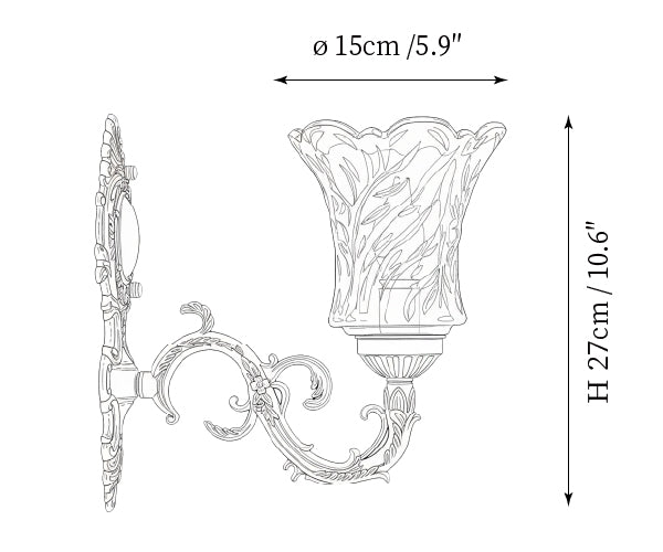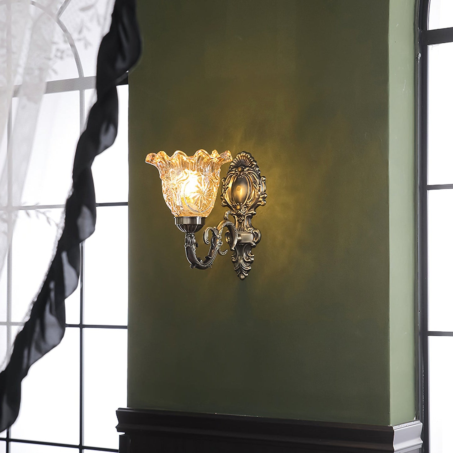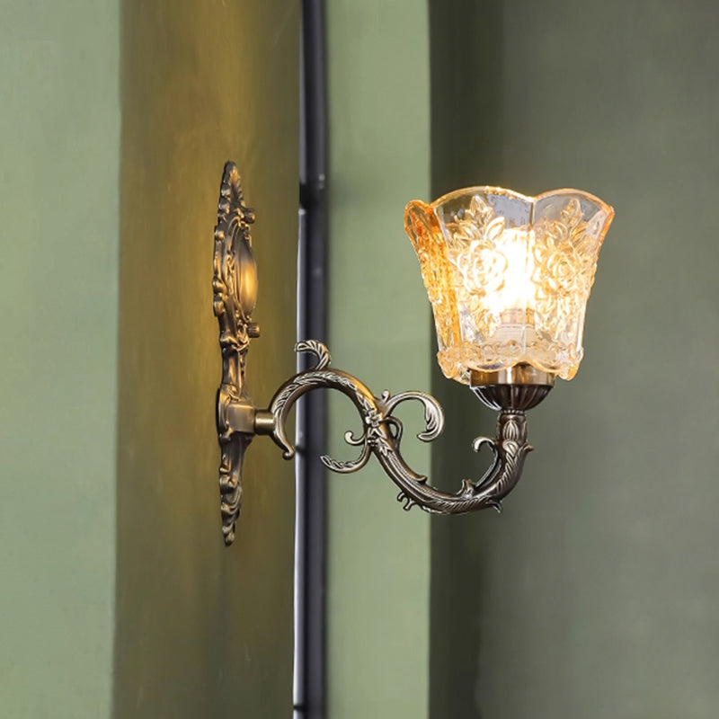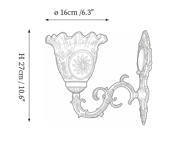 The Aveline wall lamp by Mooijane embodies vintage elegance with its refined blend of metal and glass. Its gracefully curved arms and petal-shaped glass shade create a soft, shimmering glow. This timeless lamp, with its sophisticated allure, will brighten any interior.