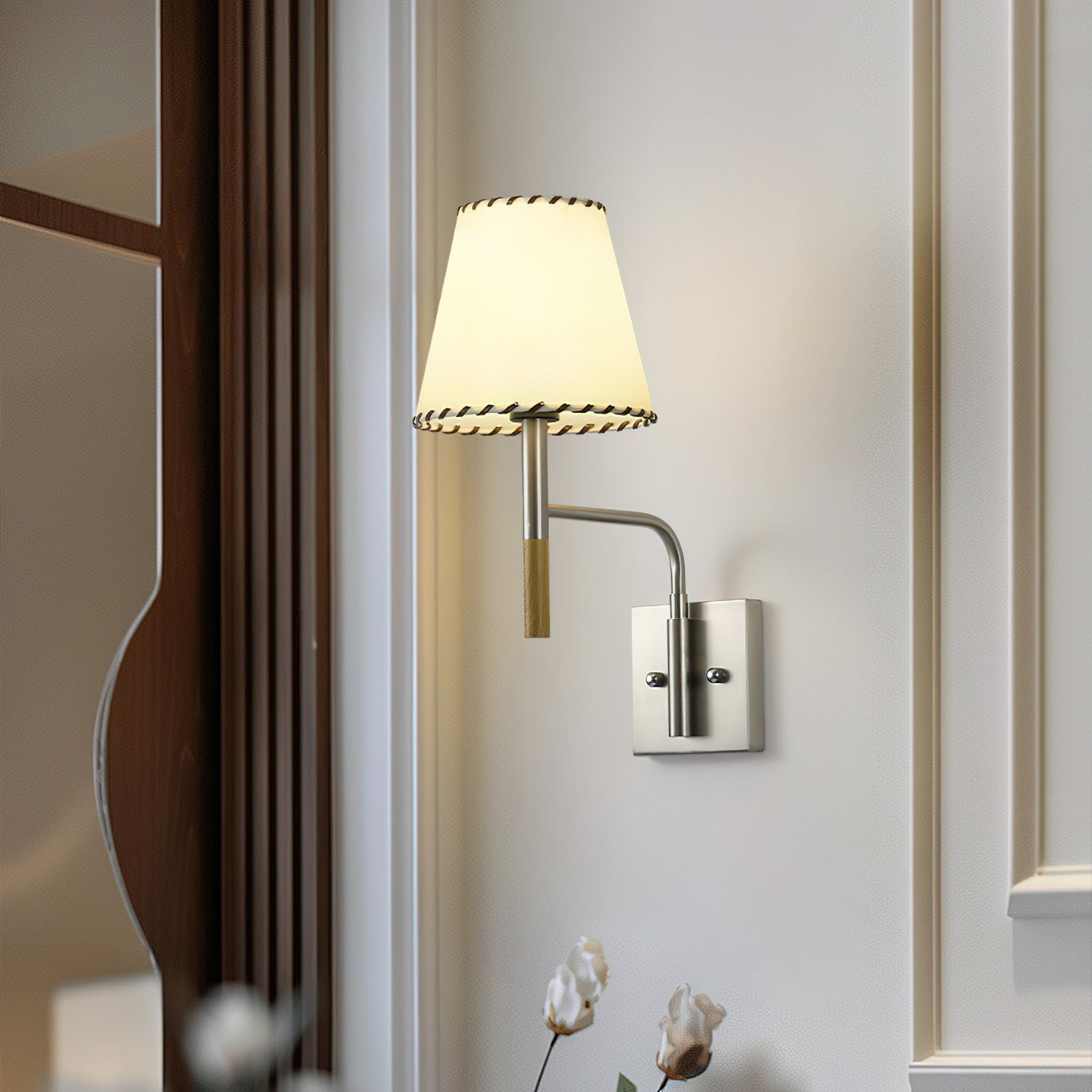 The Ayannia Wall Lamp from Mooijane brings elegance and versatility to your space. Featuring a swivel design, it offers a sleek, austere silhouette with a wood and metal stem and a conical shade. The polished wall mount adds a refined finishing touch, making it perfect for bedside lighting or a cozy reading nook.