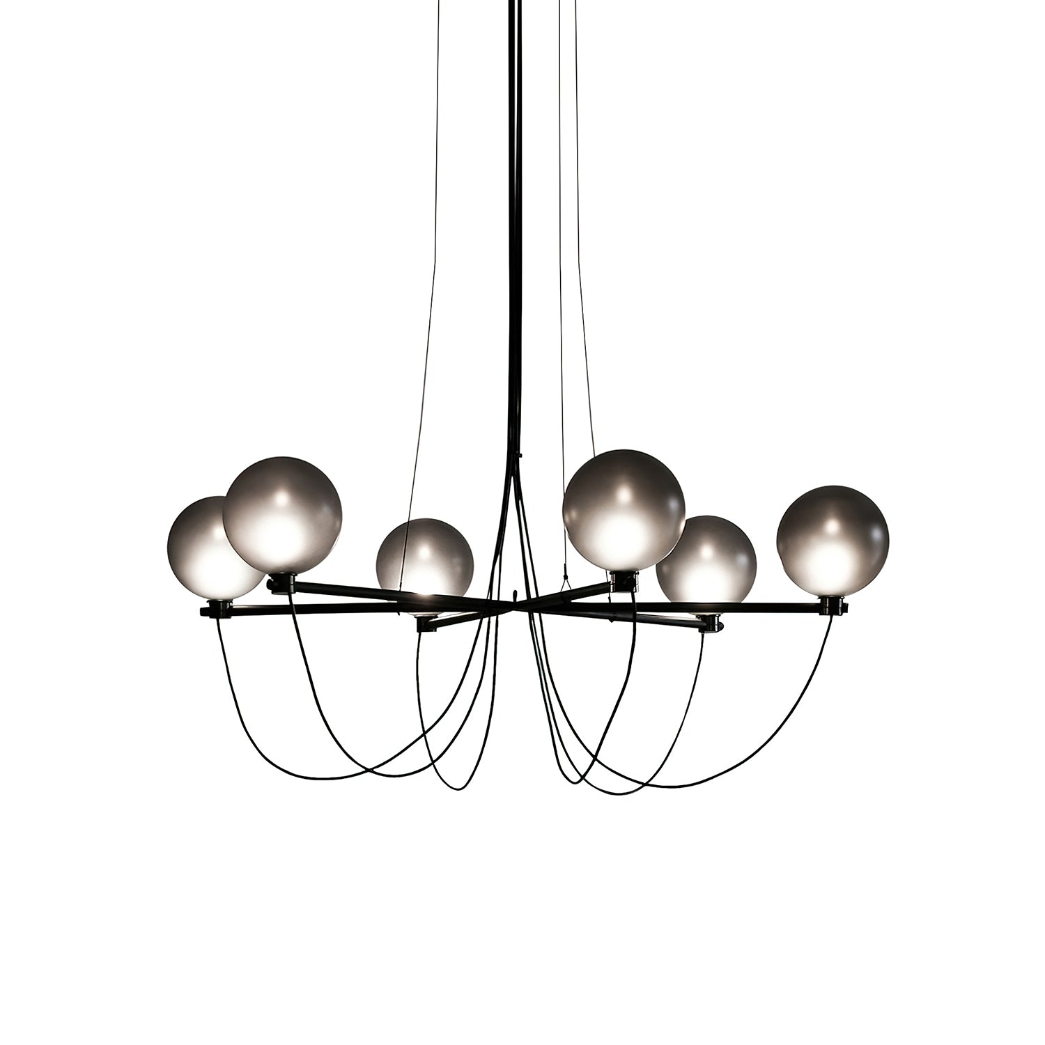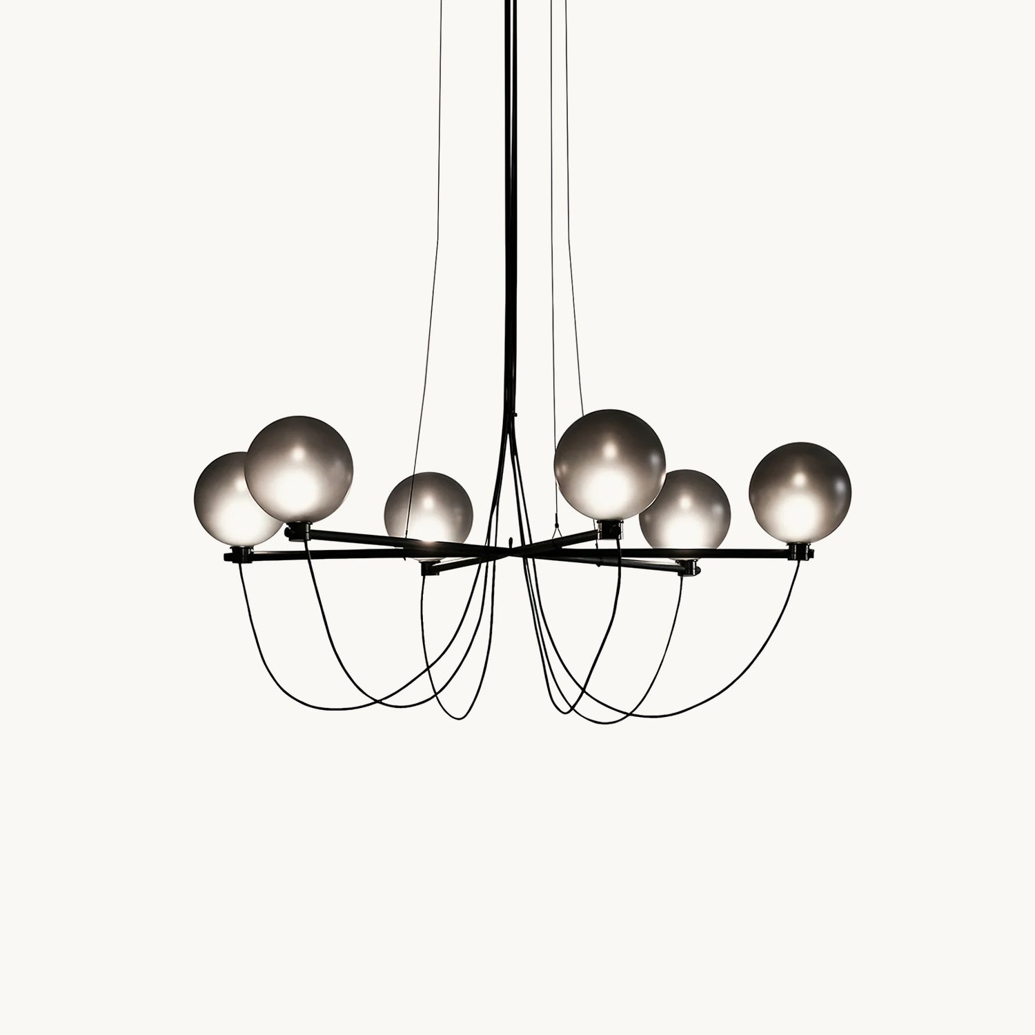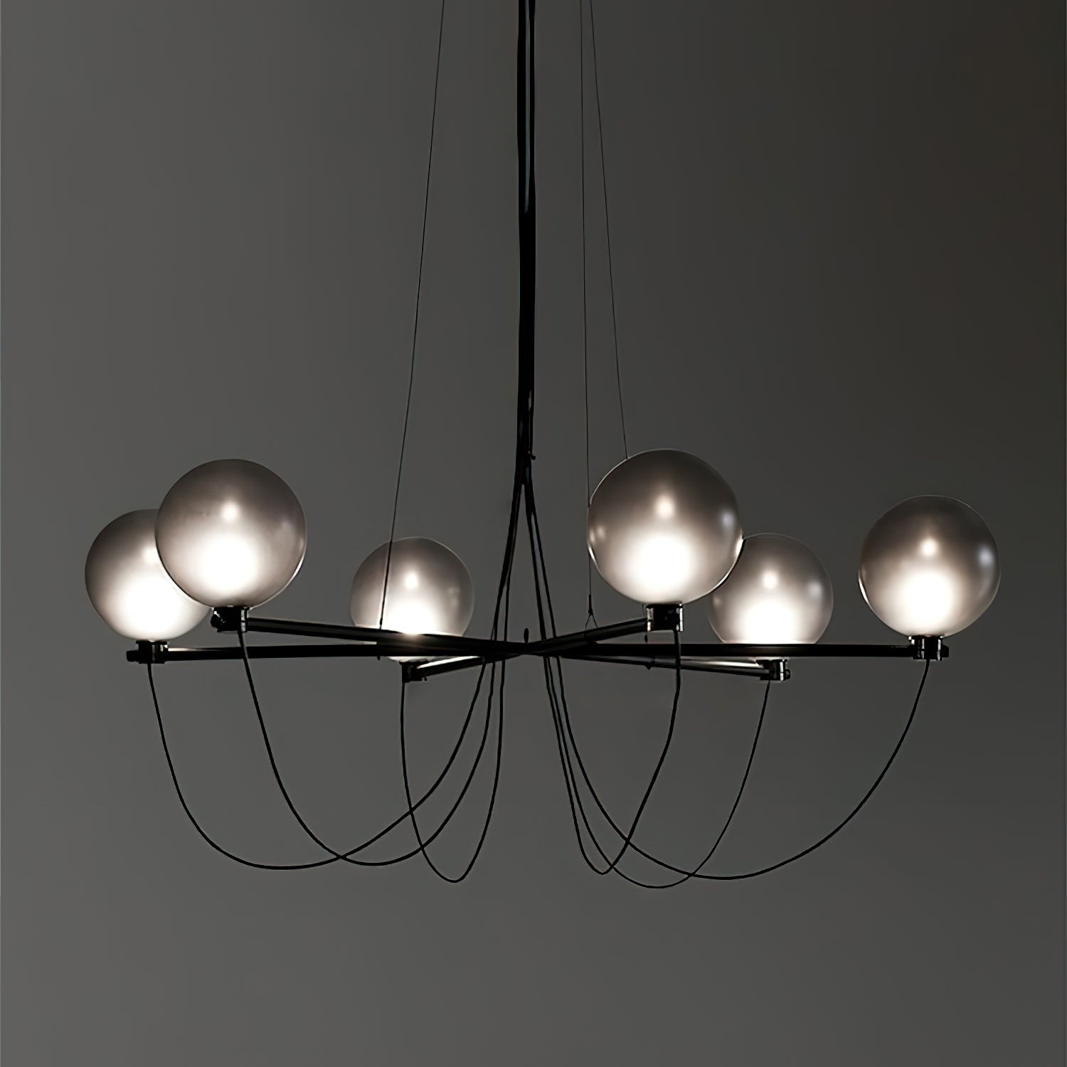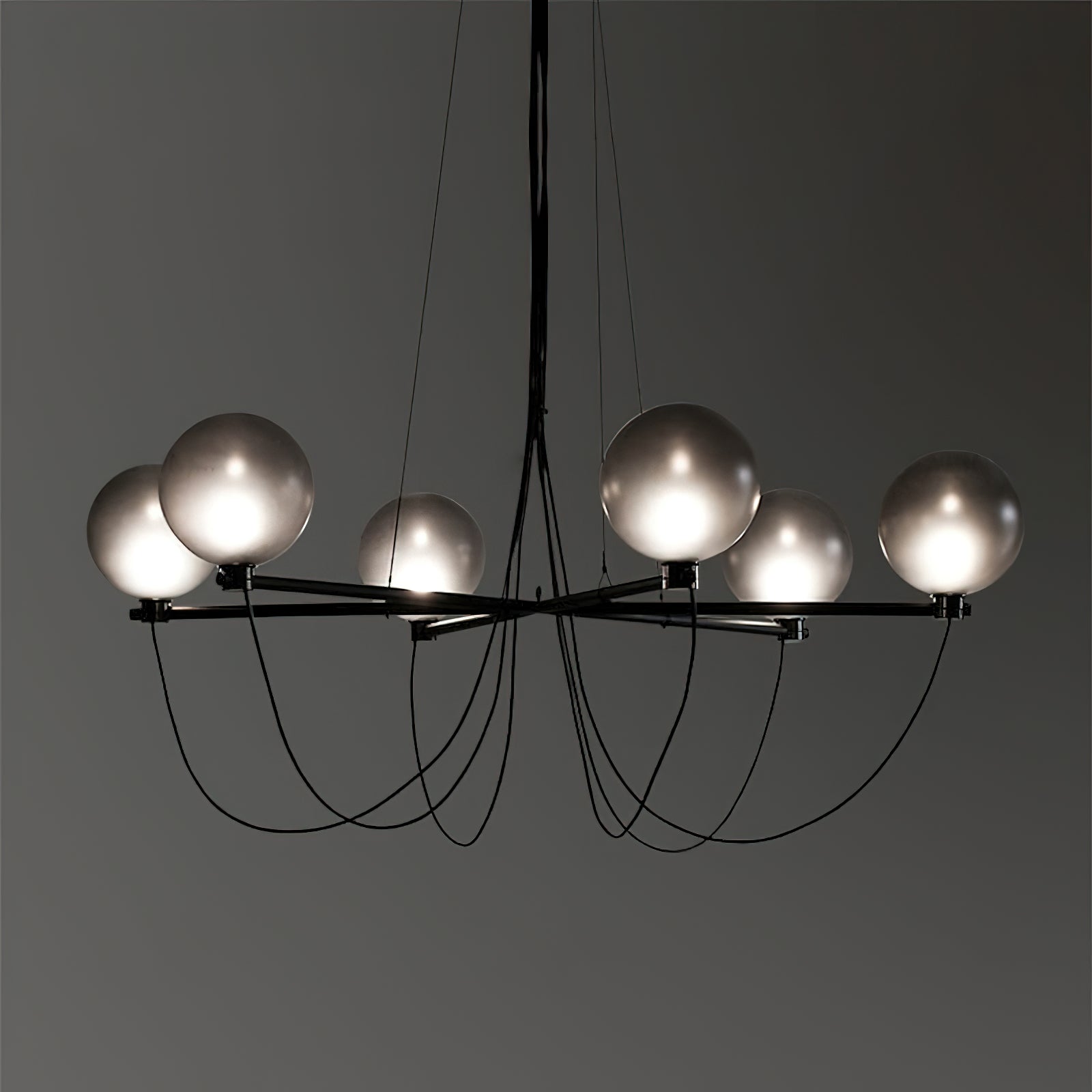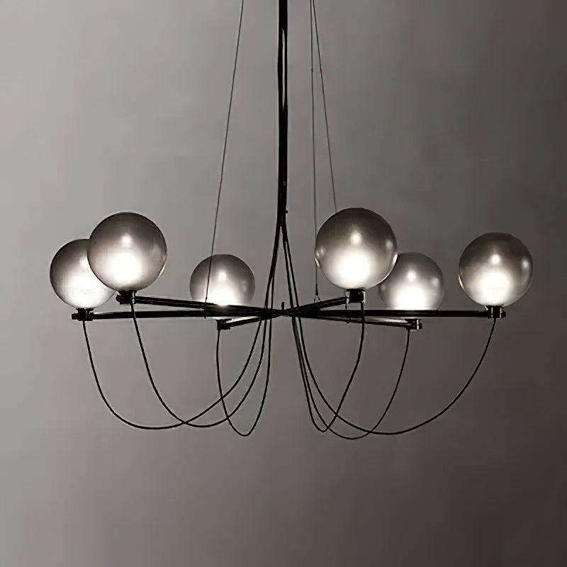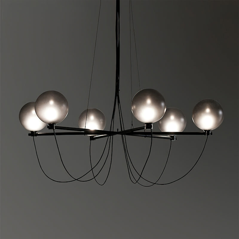 The Bagnoregio Chandelier is inspired by the Bauhaus movement, where form and function are intertwined. The black-coated steel frame and blown Gradient Gray glass globe exude elegance. This chandelier is perfect for any space, adding a touch of sophistication to both residential and commercial settings.
