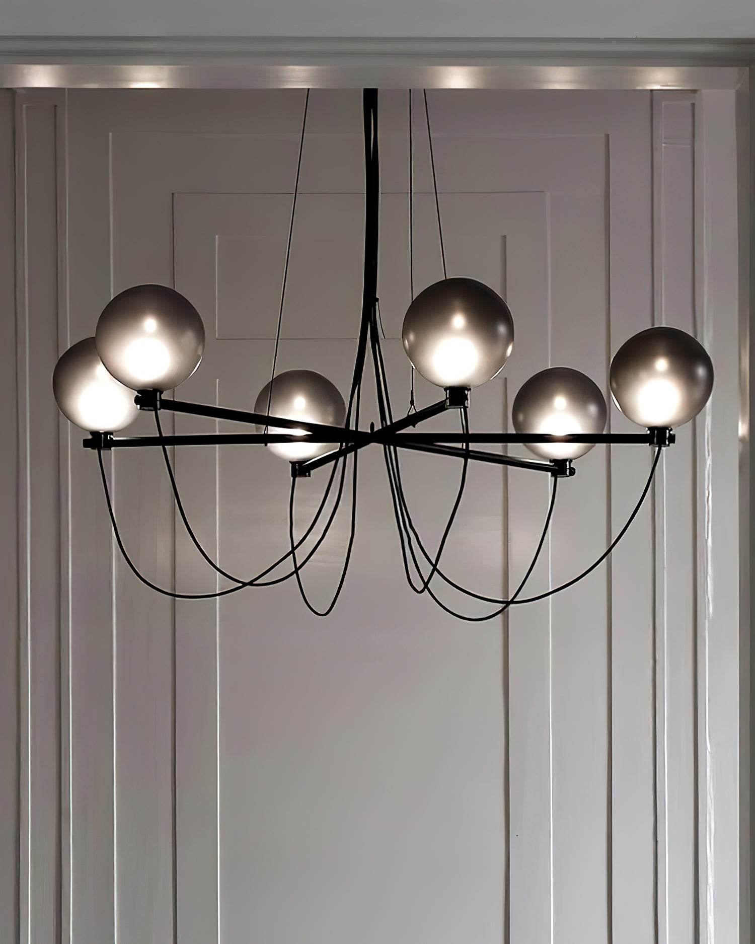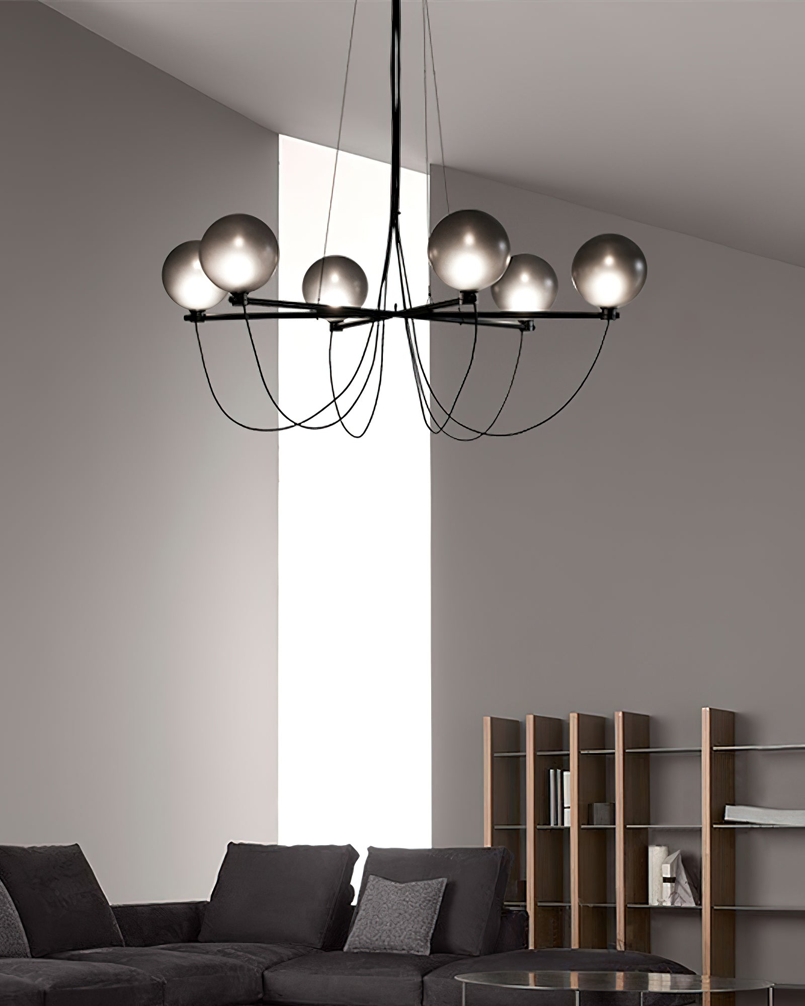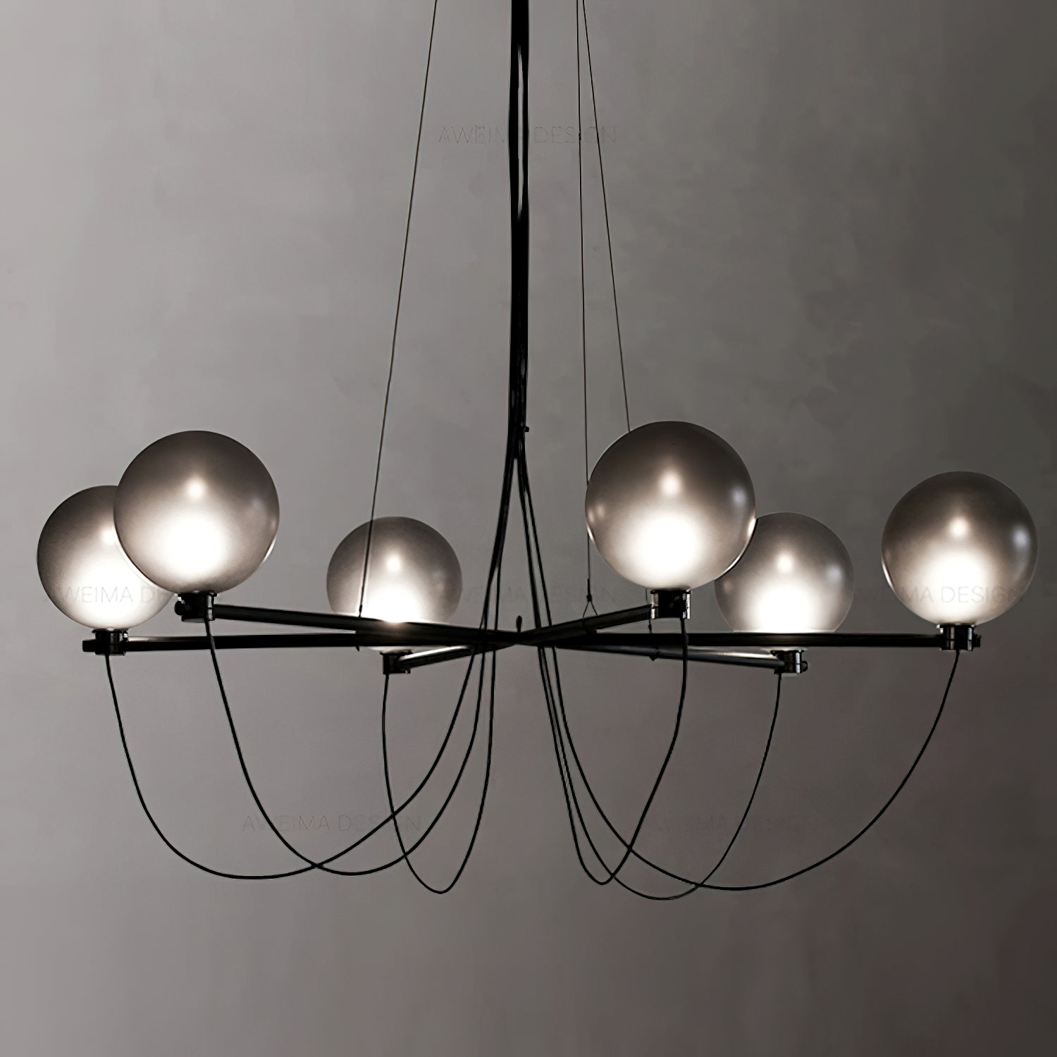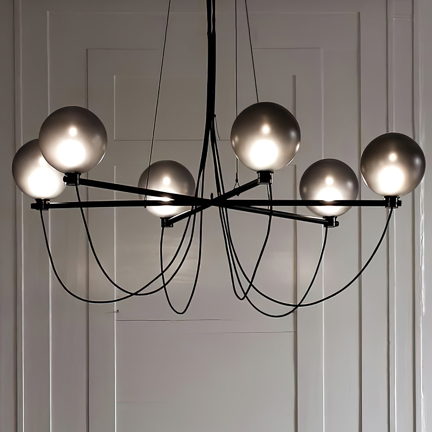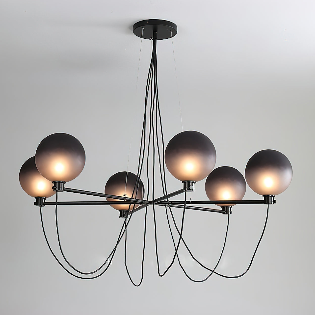 The Bagnoregio Chandelier is inspired by the Bauhaus movement, where form and function are intertwined. The black-coated steel frame and blown Gradient Gray glass globe exude elegance. This chandelier is perfect for any space, adding a touch of sophistication to both residential and commercial settings.