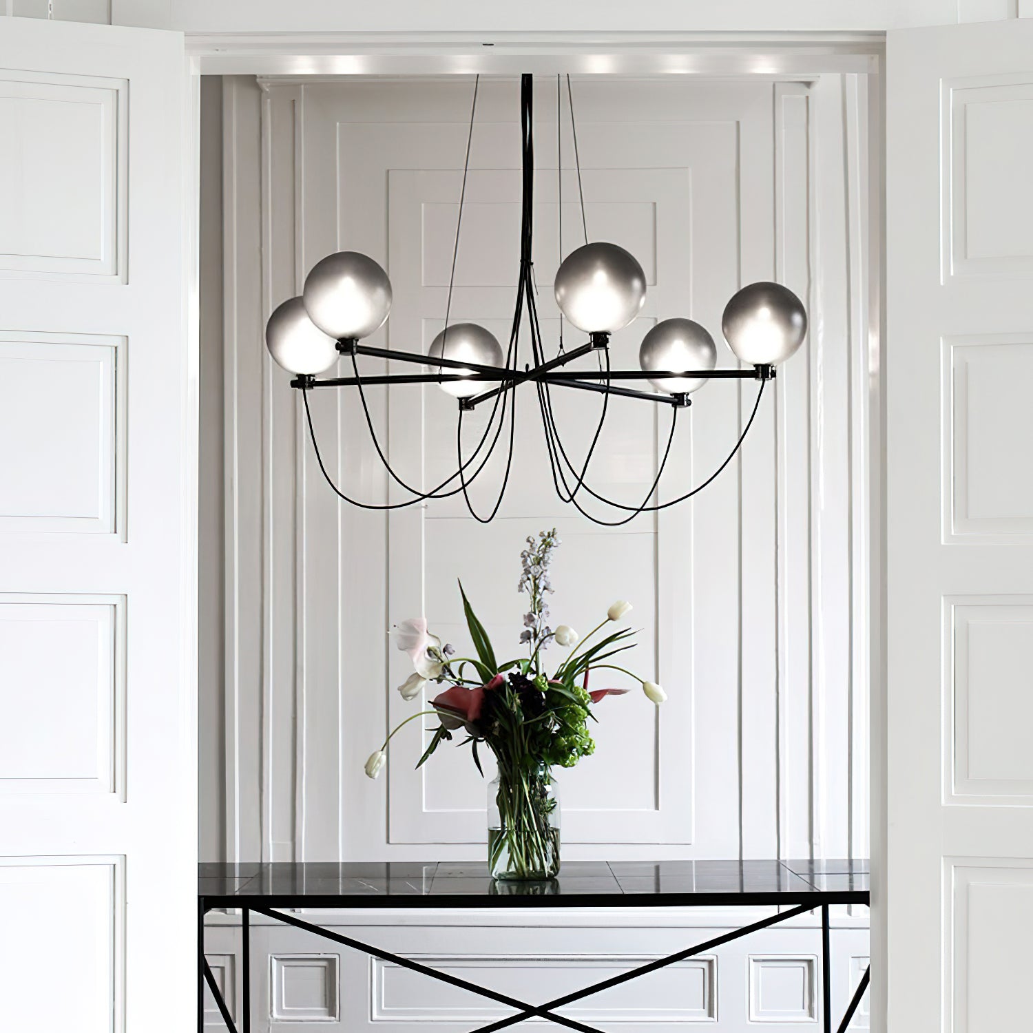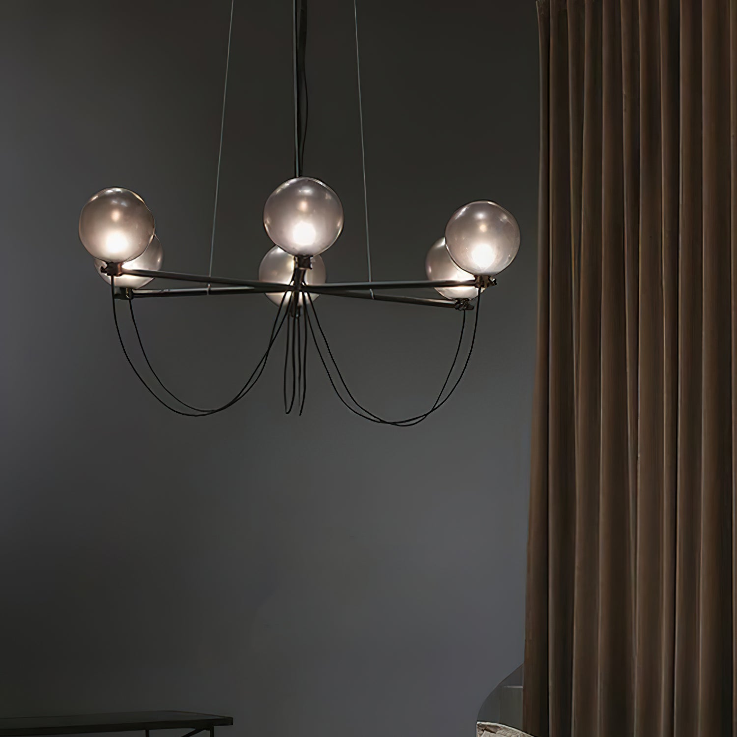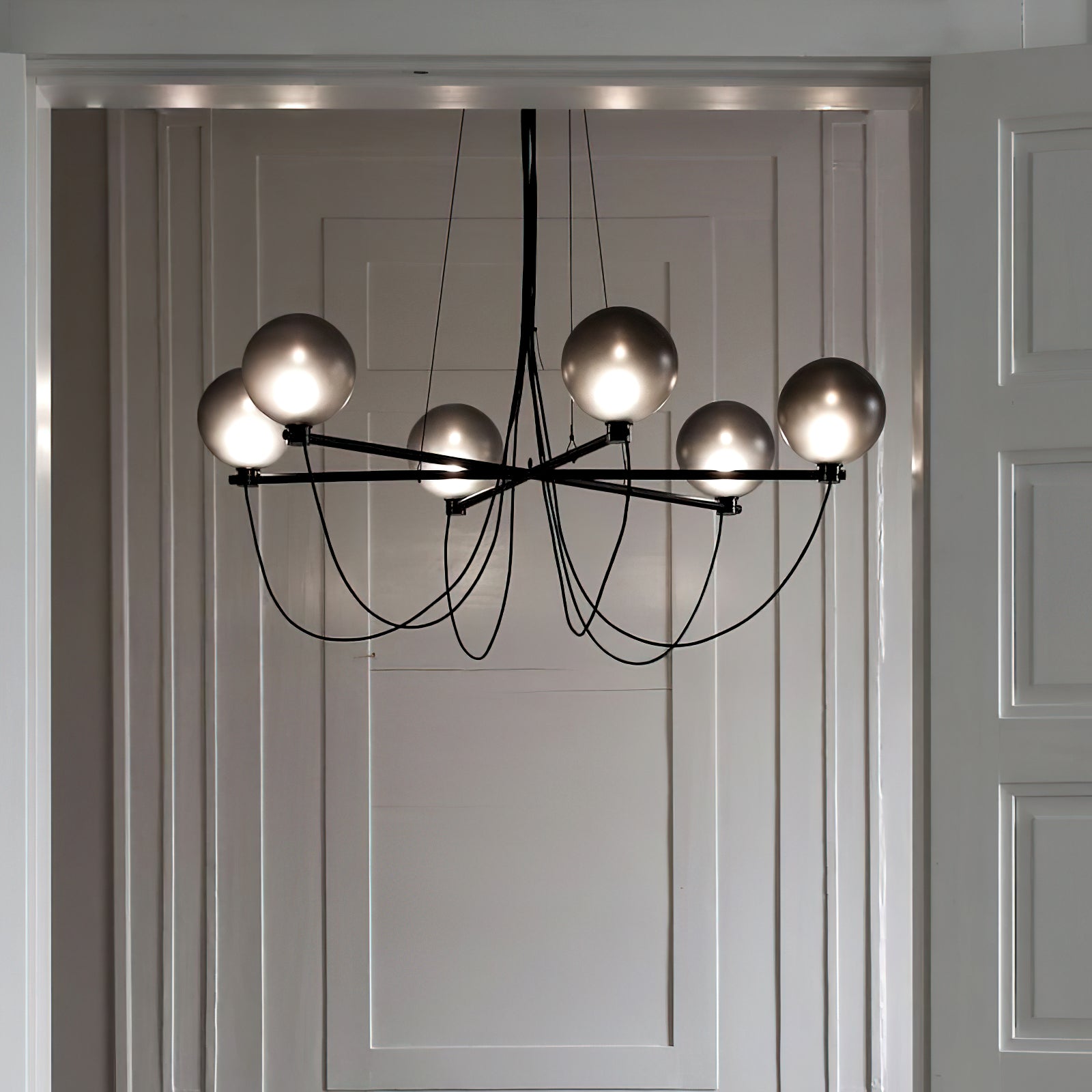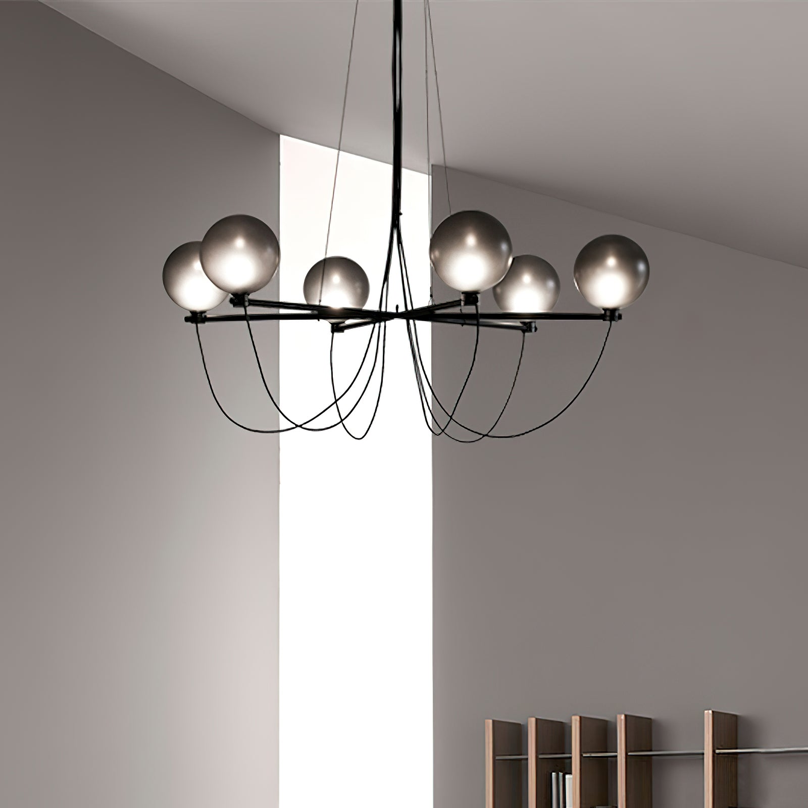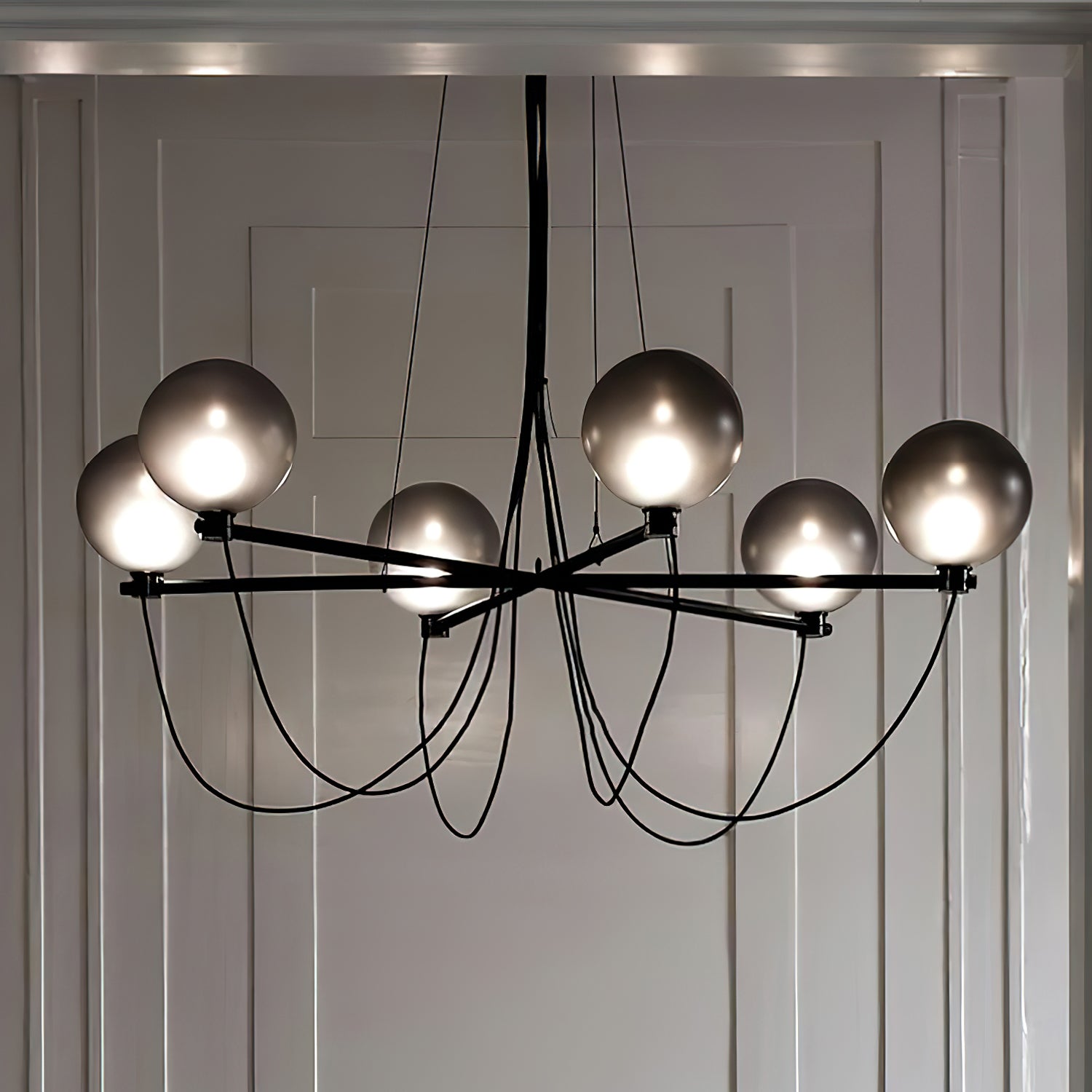 The Bagnoregio Chandelier is inspired by the Bauhaus movement, where form and function are intertwined. The black-coated steel frame and blown Gradient Gray glass globe exude elegance. This chandelier is perfect for any space, adding a touch of sophistication to both residential and commercial settings.