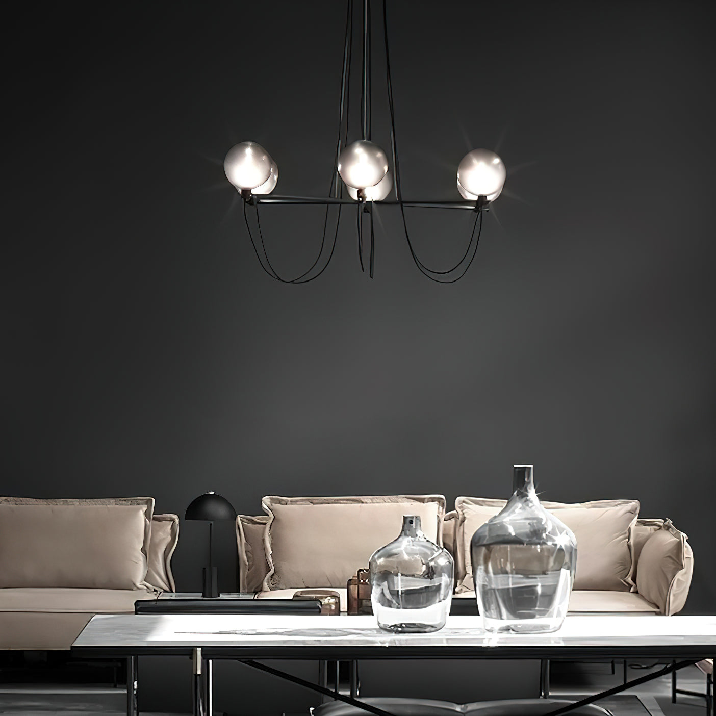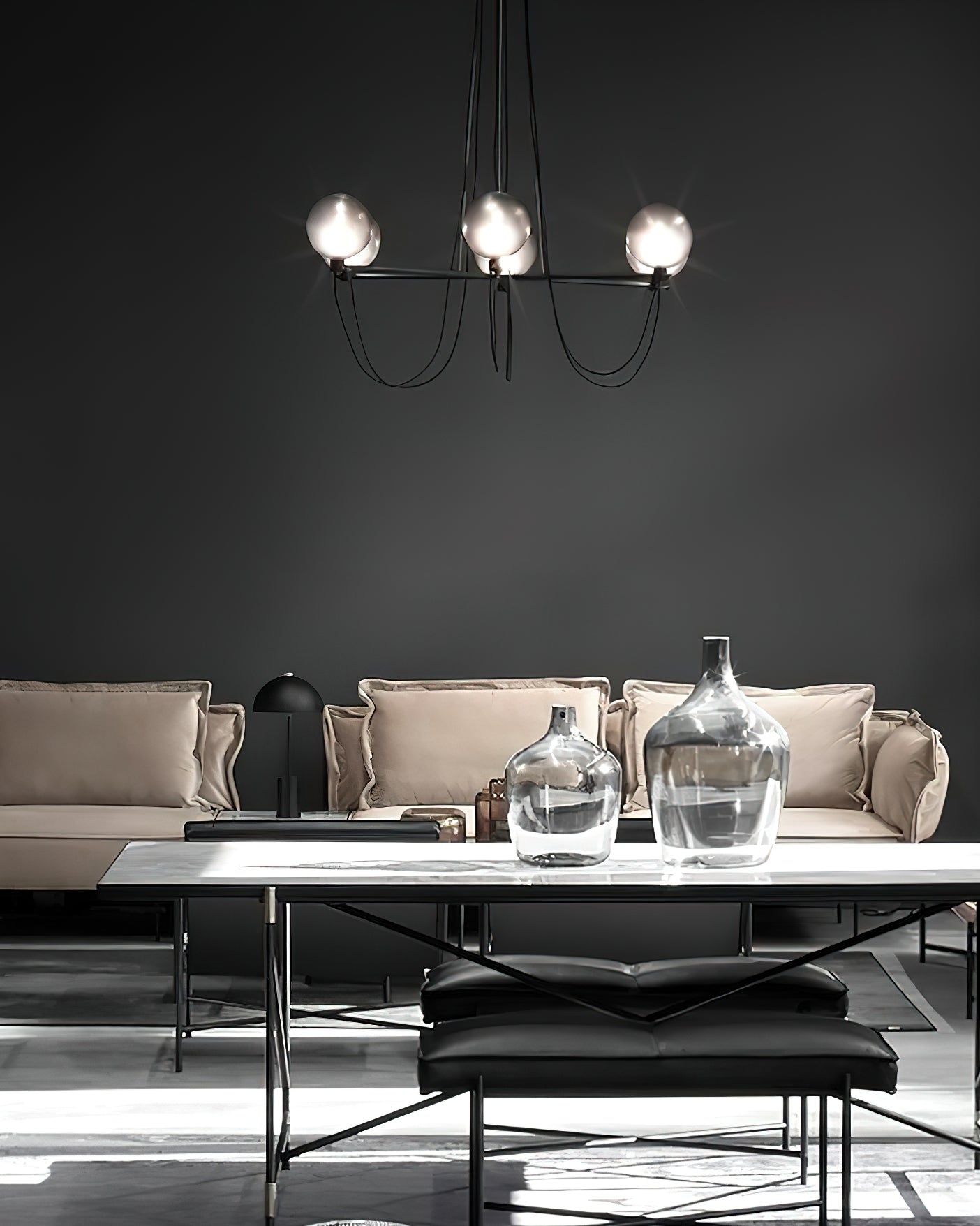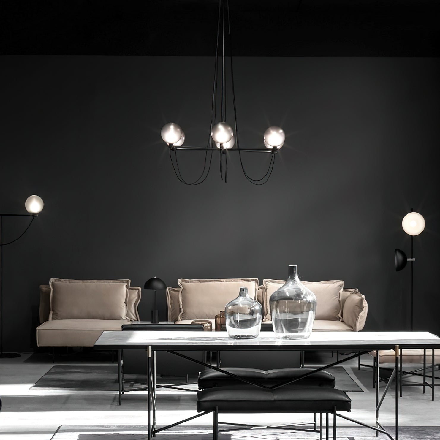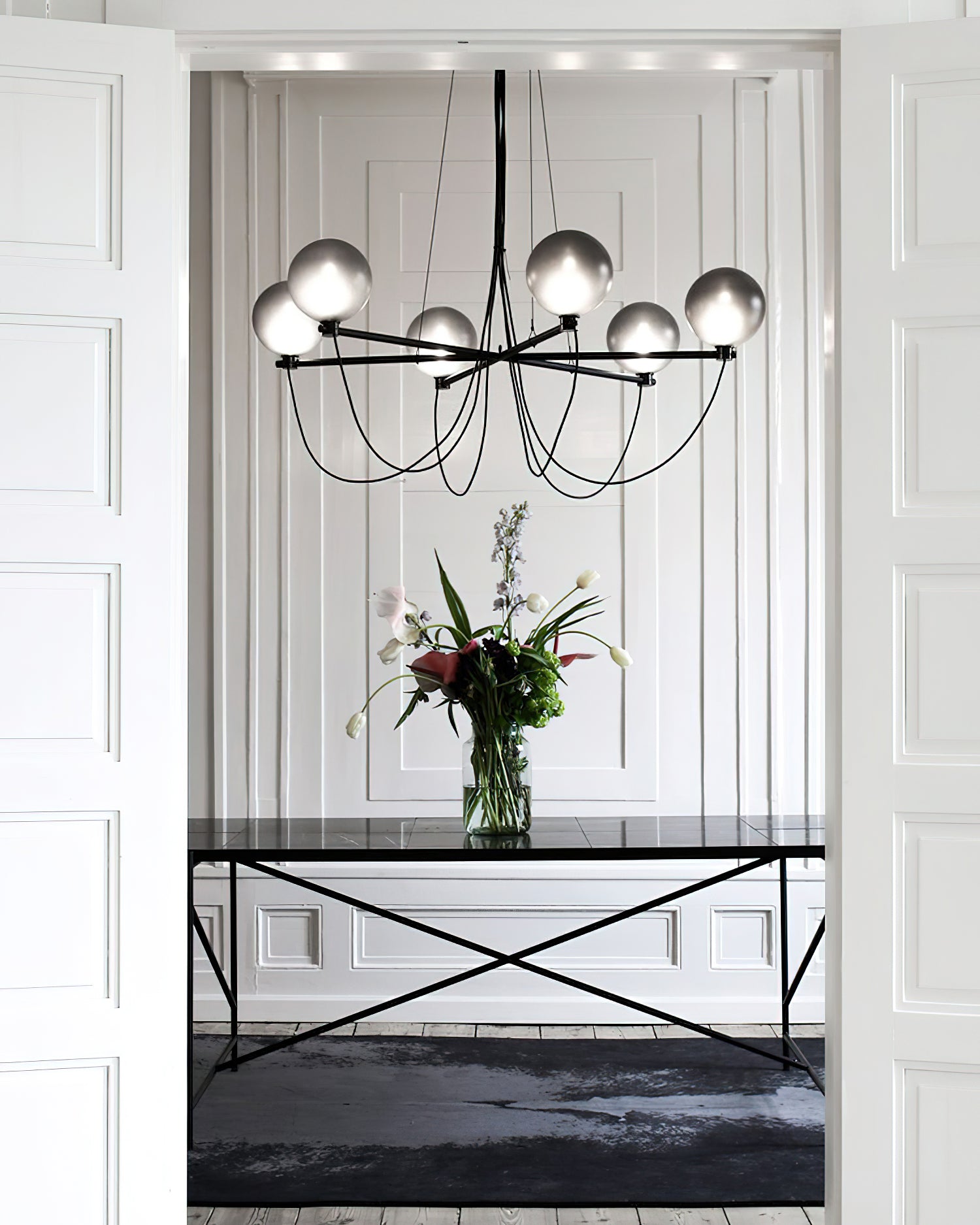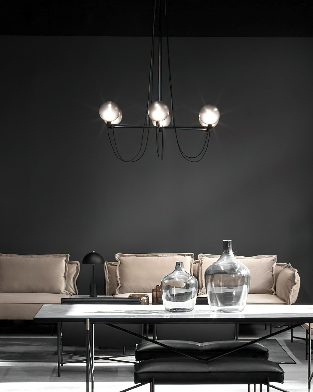 The Bagnoregio Chandelier is inspired by the Bauhaus movement, where form and function are intertwined. The black-coated steel frame and blown Gradient Gray glass globe exude elegance. This chandelier is perfect for any space, adding a touch of sophistication to both residential and commercial settings.