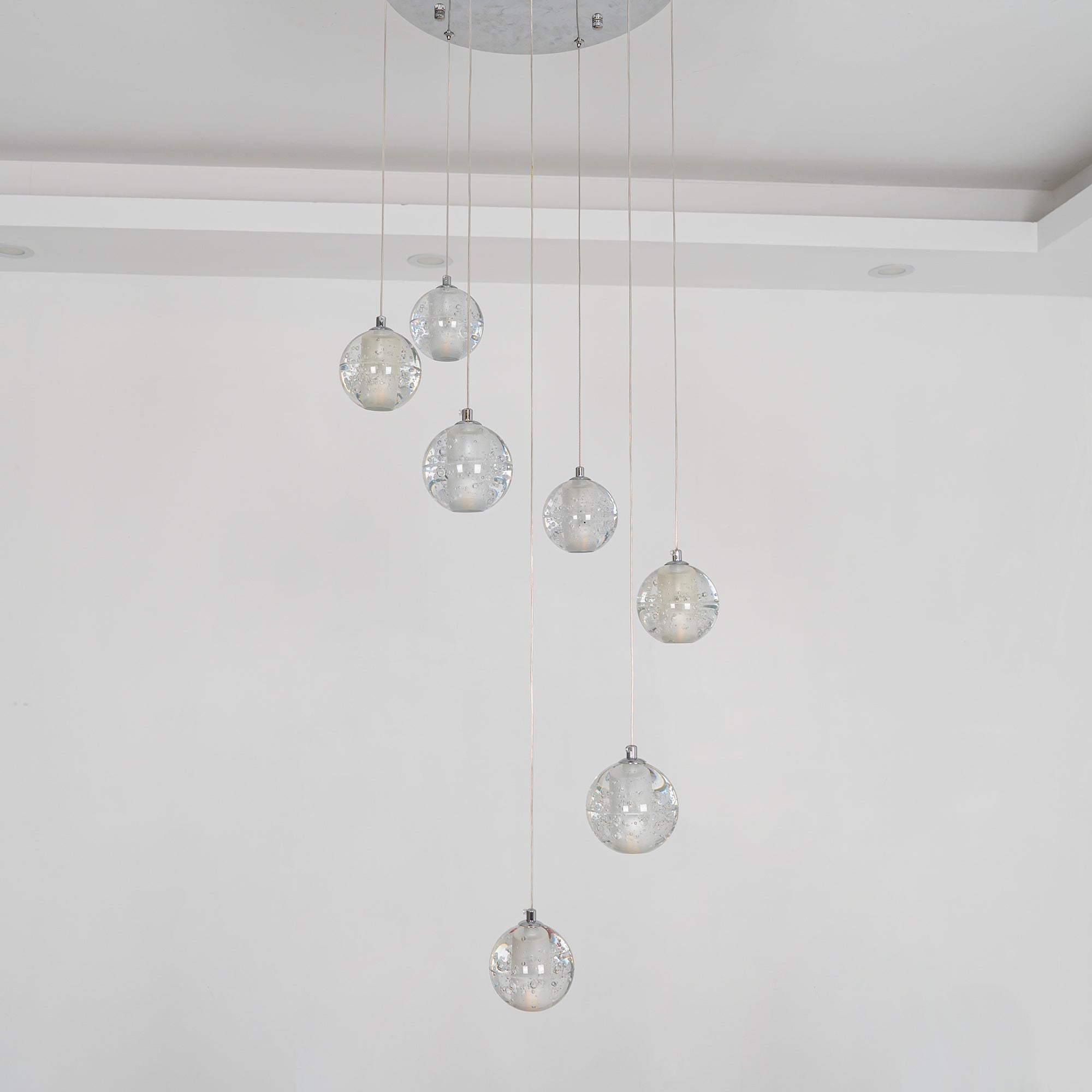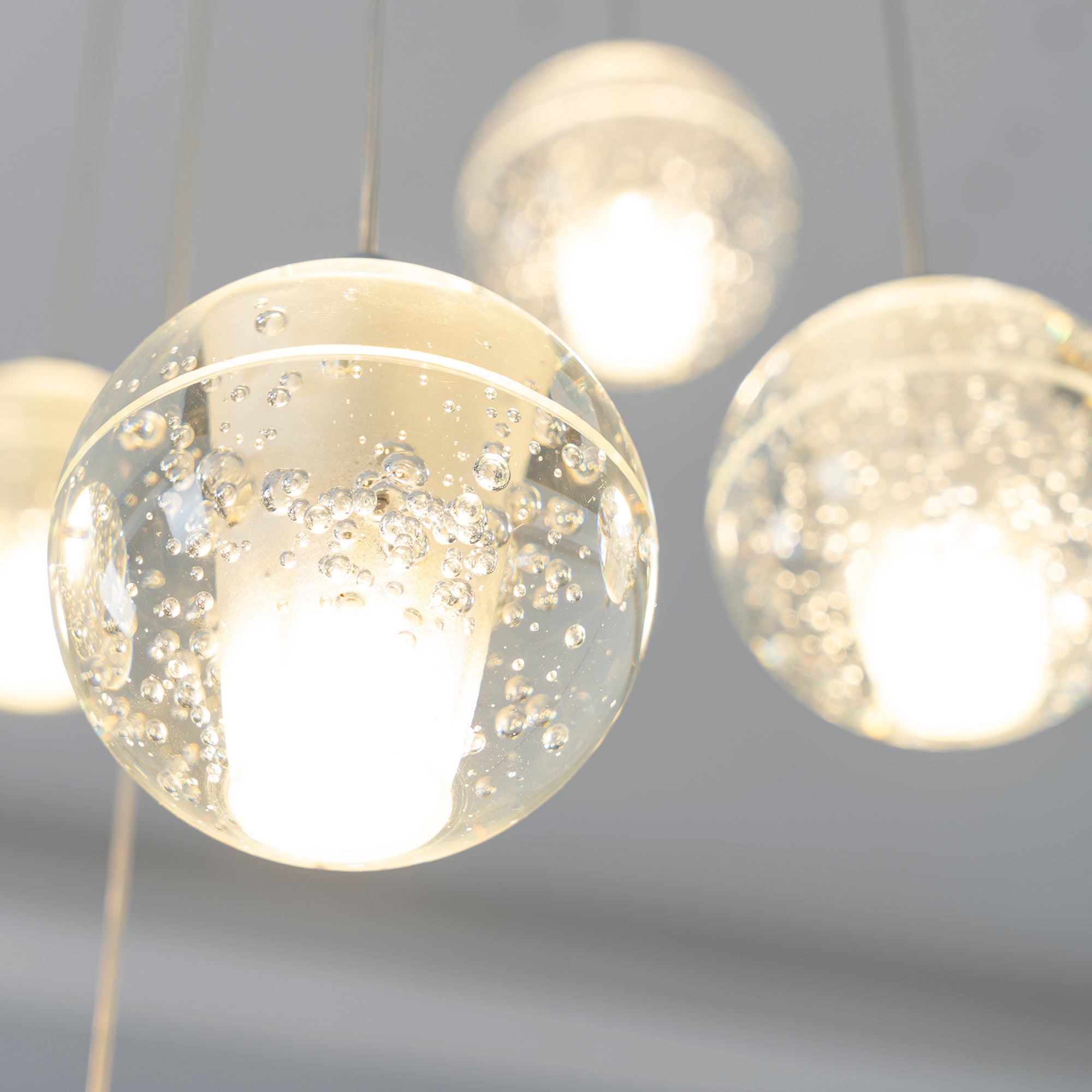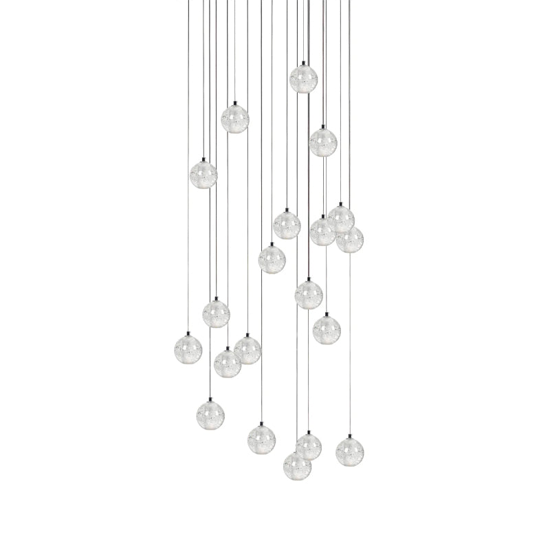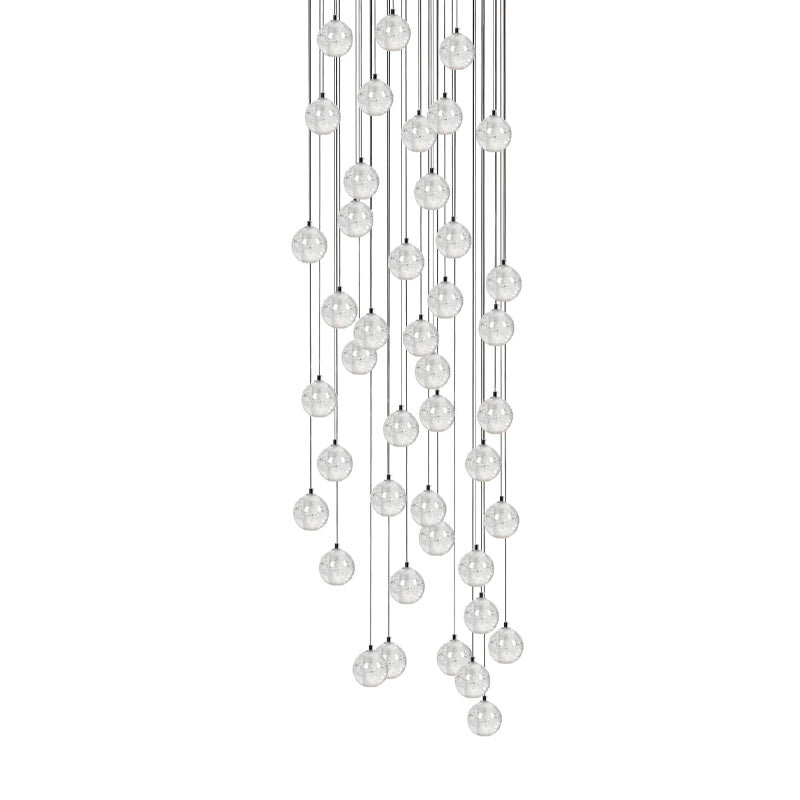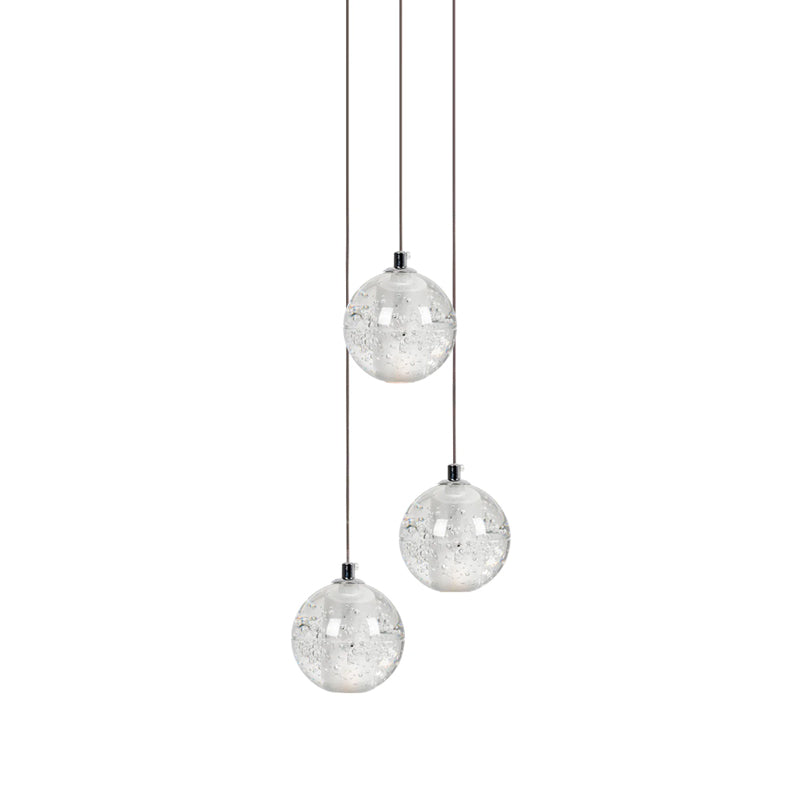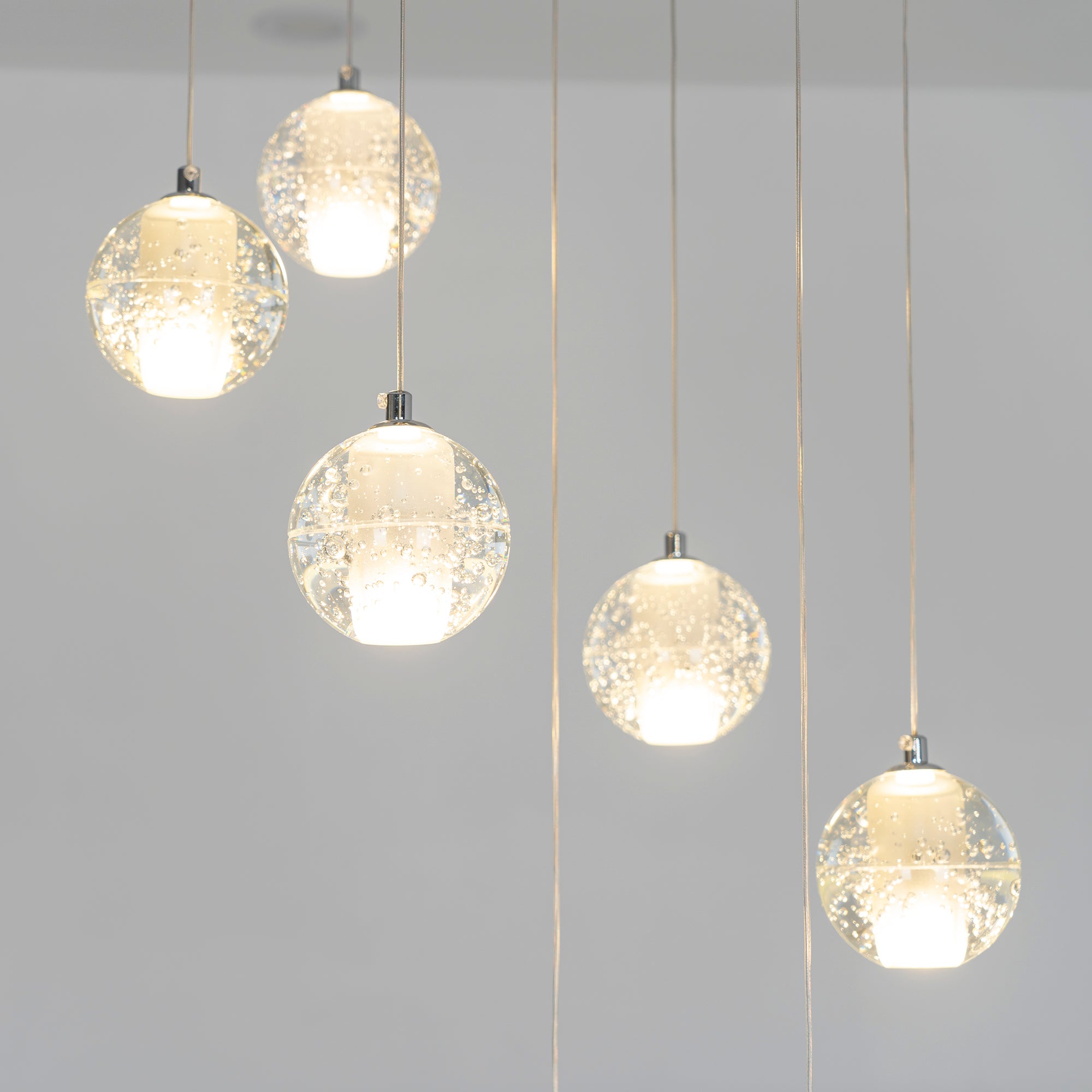 The Ball Crystal Pendant Light interacts with the imperfections of the glass to create a rich halo of light. Visually quite subtle, they gain tremendous strength when clustered in random formations along horizontal and vertical applications. Popular residential and commercial applications include kitchens, restaurants, bedrooms and closets, hallways, patios, staircase illumination, foyers and lobbies, and other large indoor and outdoor configurations in private and public spaces.
