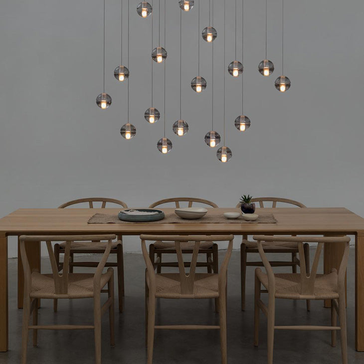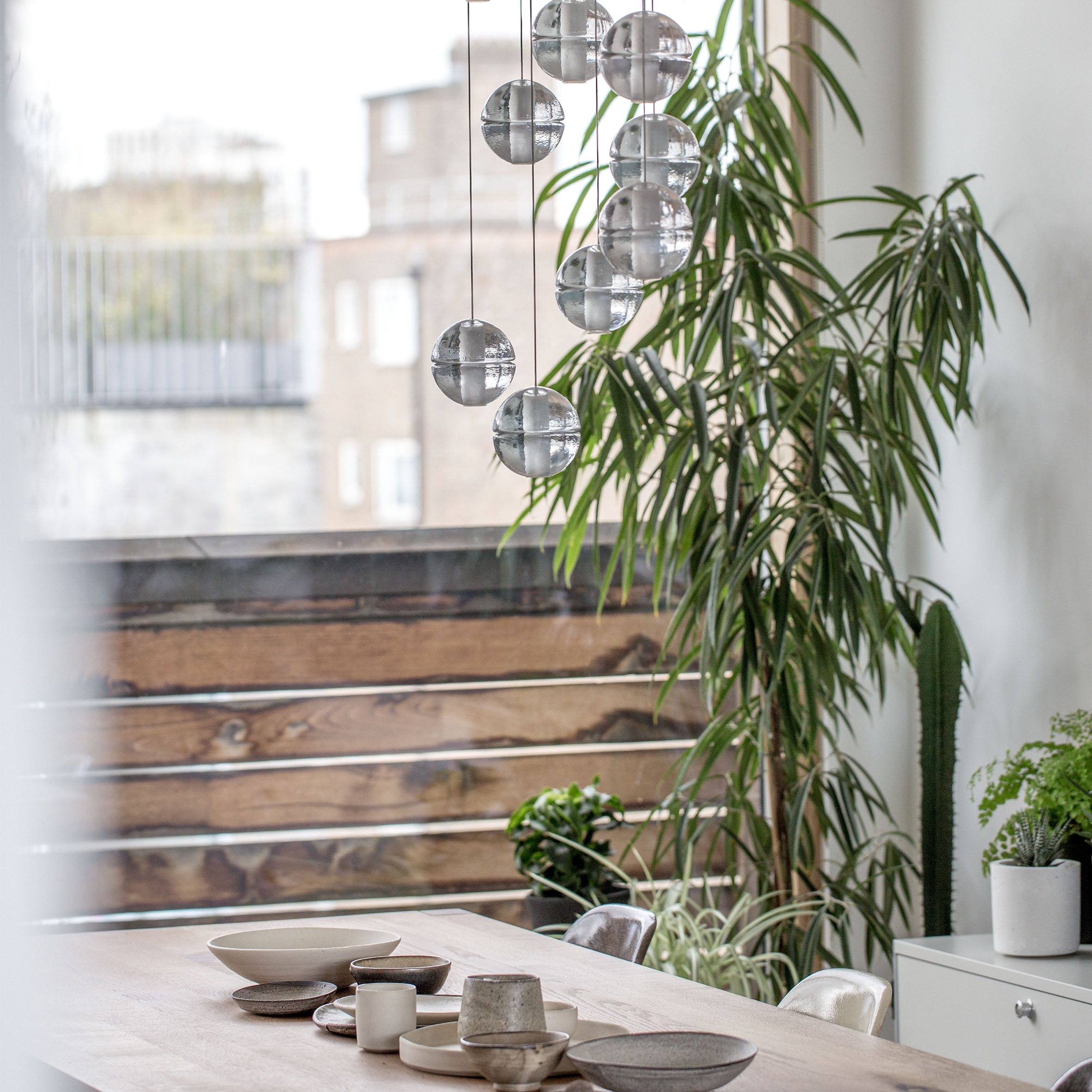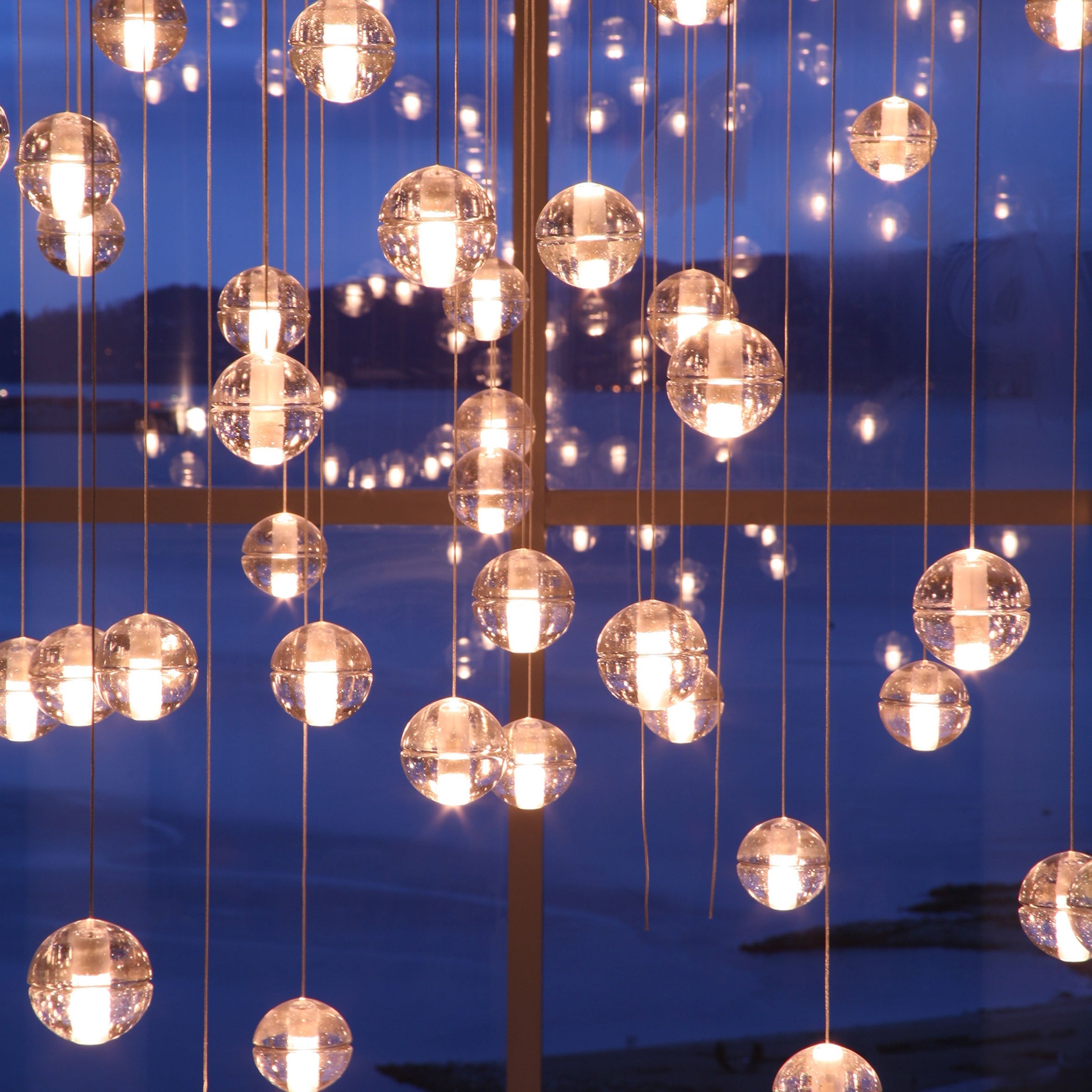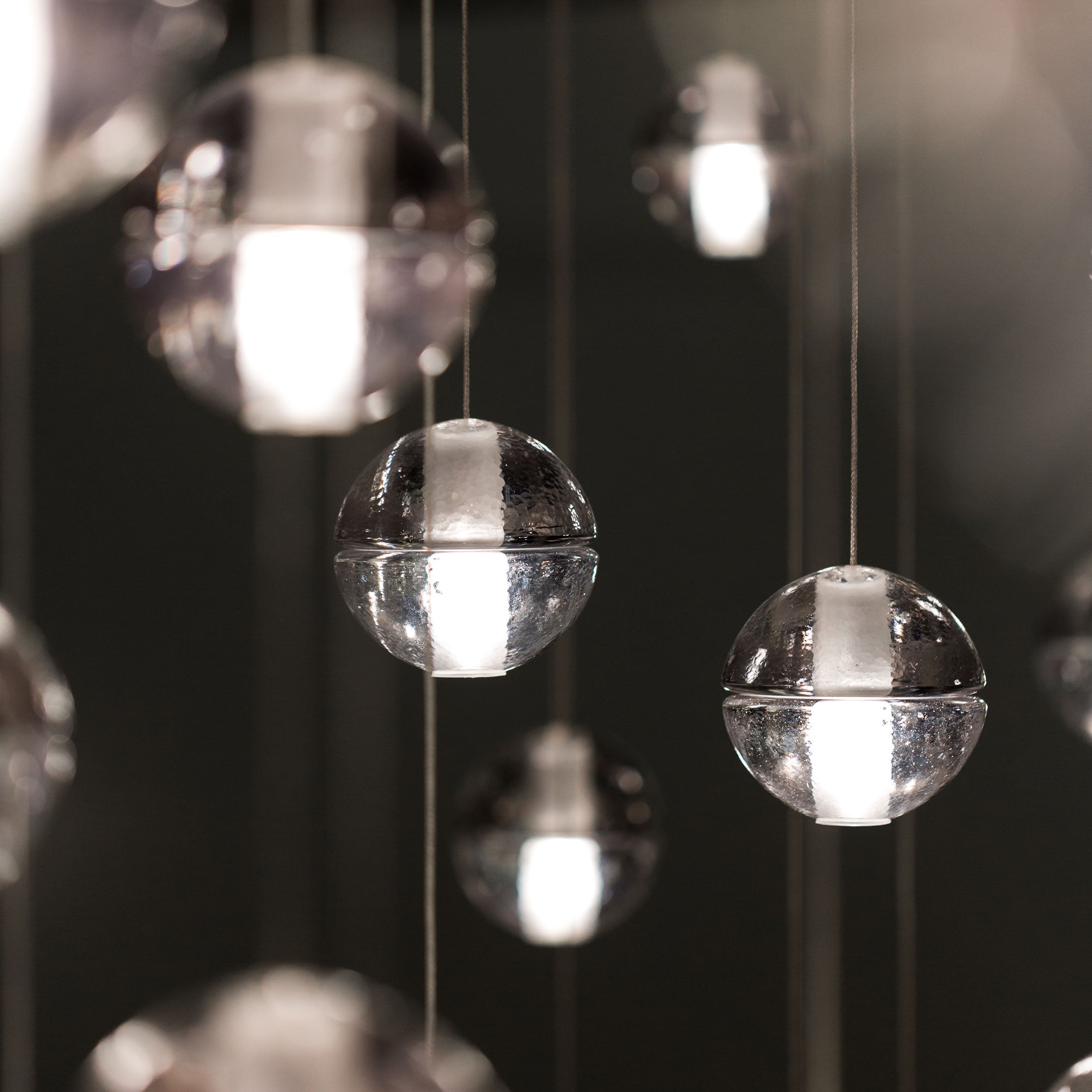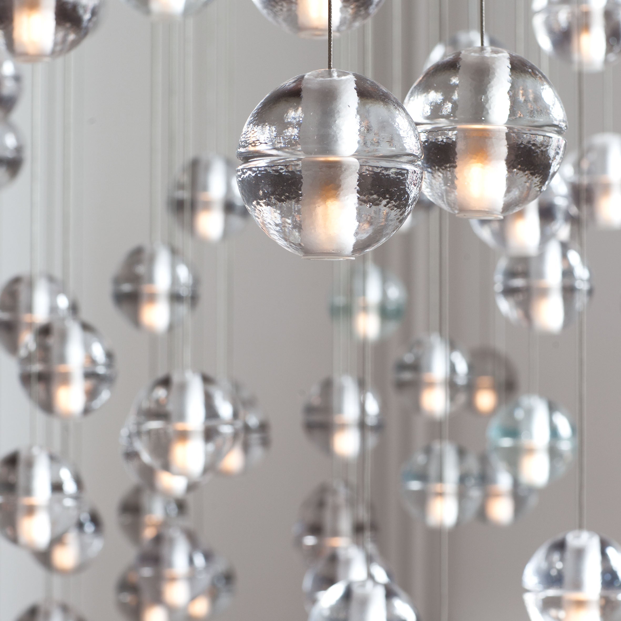 The Ball Crystal Pendant Light is a glowing sphere of hand-cast glass, each distinctive piece creating a unique light. A frosted, cylindrical void houses either a low voltage xenon/halogen or LED light, illuminating the bubbles and imperfections of each articulated sphere. Individually, the pendants are visually subtle but gain an impressive atmospheric quality when clustered. the Ball Crystal Pendant Light became an instant classic and is ideal for both home and commercial properties.