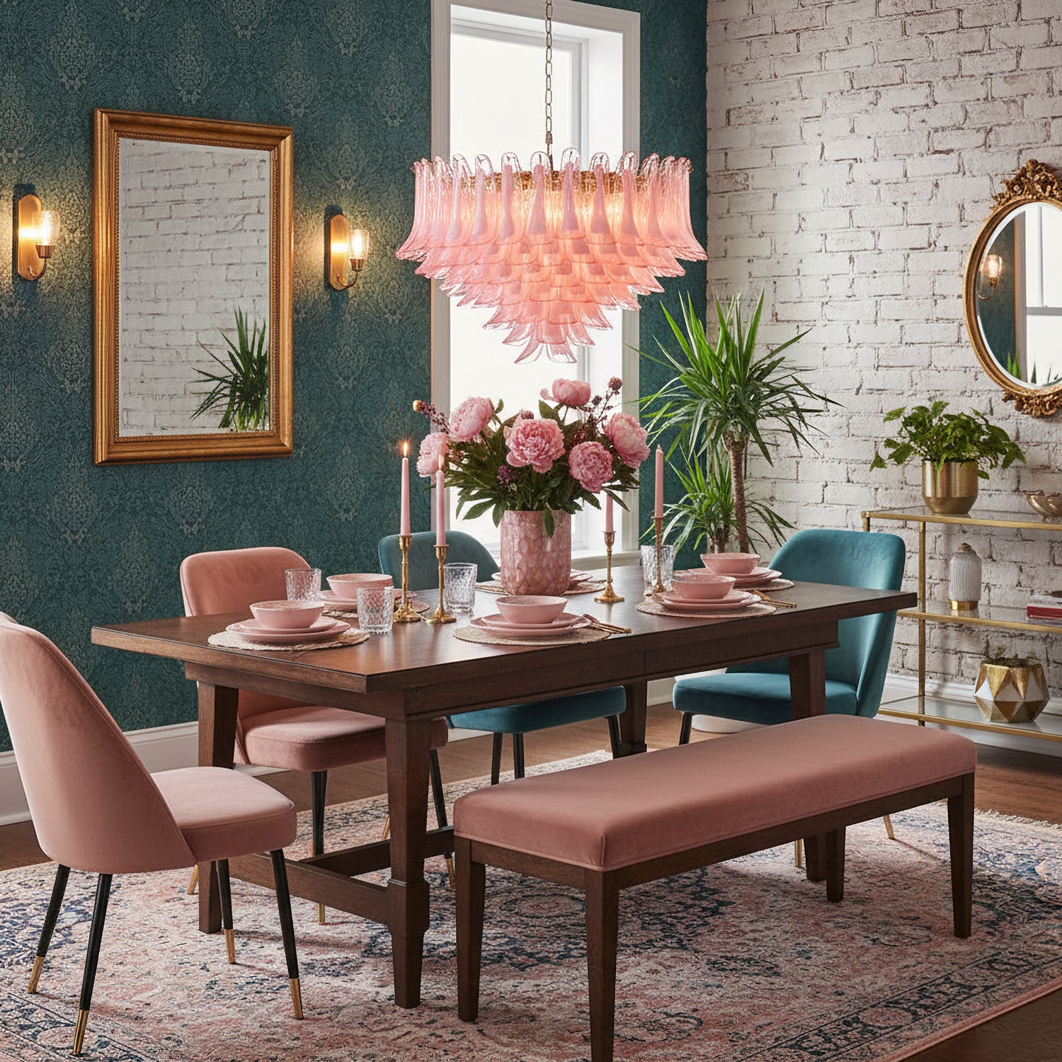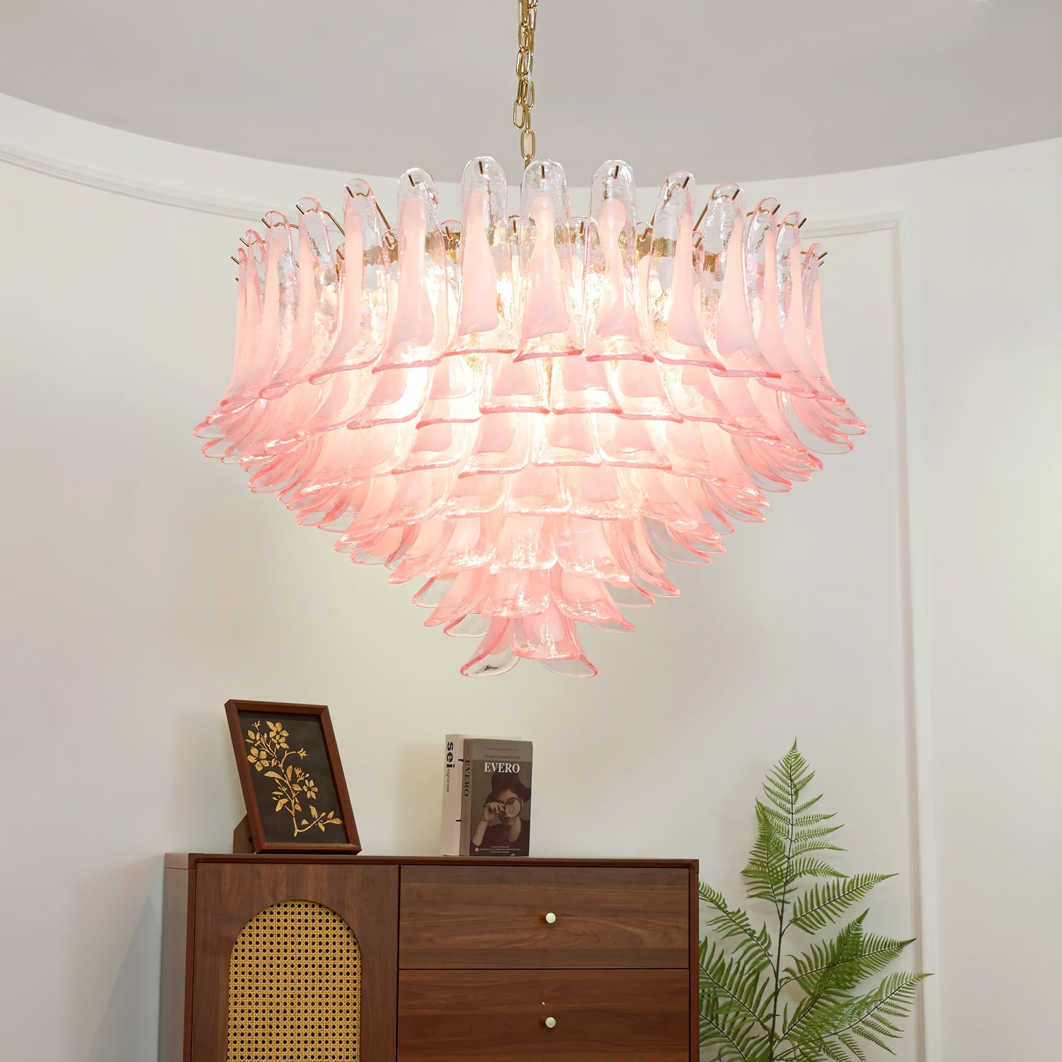 Elevate your space with the Barcelona Murano Chandelier from Mooijane. The gold frame and pink glass create an elegant, blooming petal effect. The modern design adds a touch of luxury while casting a captivating glow. Light up your room and create an enchanting ambience with this sophisticated piece.