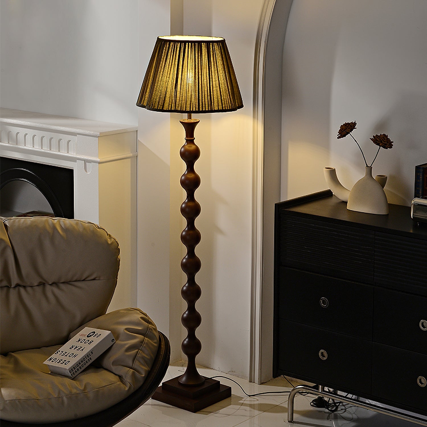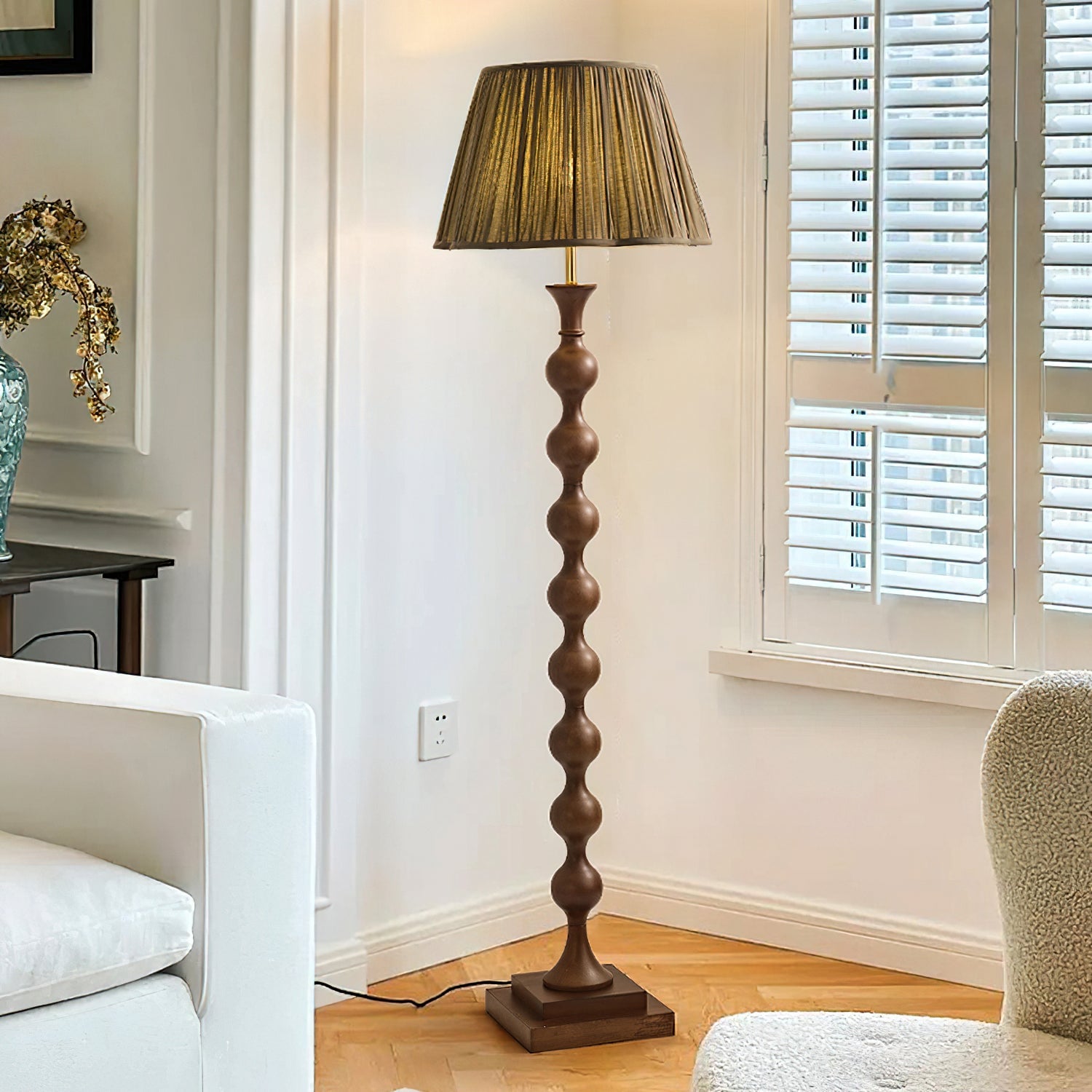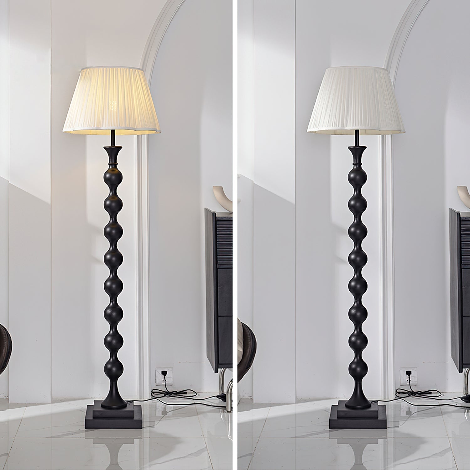 Introducing the Beaded Column Floor Lamp - a modern and luxurious addition to any room. Its unique beaded column design adds an elegant layer of detail, while the simple column and stable base create an understated yet sophisticated look. Featuring a classic pleated lampshade, this lamp emits warm light through the soft fabric to create a cozy ambience. Available in two colors.