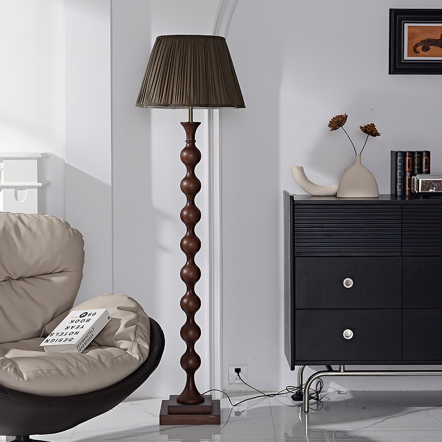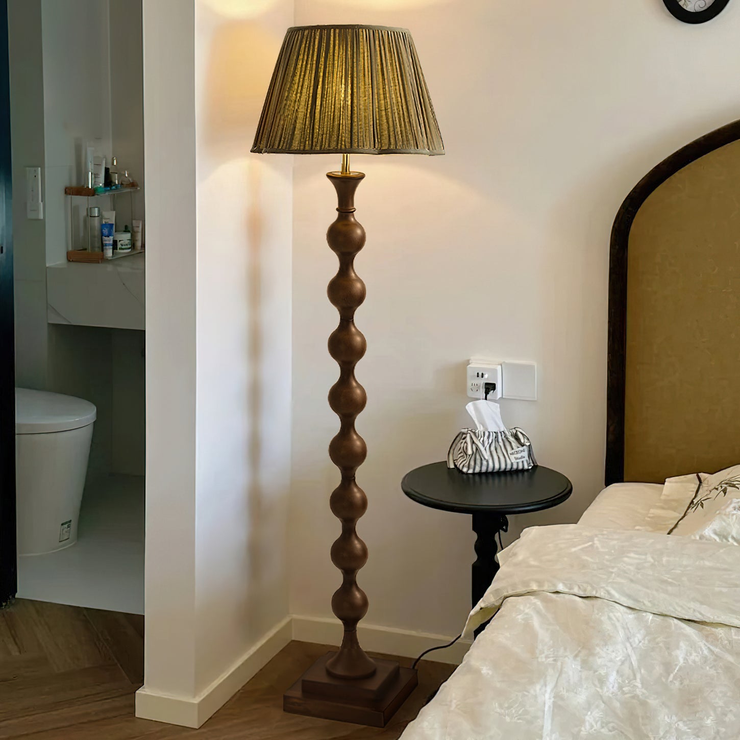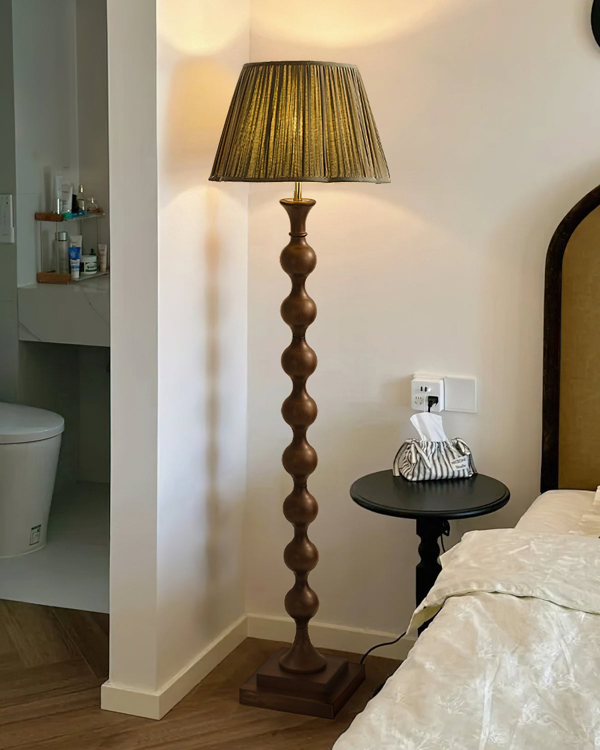 Introducing the Beaded Column Floor Lamp - a modern and luxurious addition to any room. Its unique beaded column design adds an elegant layer of detail, while the simple column and stable base create an understated yet sophisticated look. Featuring a classic pleated lampshade, this lamp emits warm light through the soft fabric to create a cozy ambience. Available in two colors.