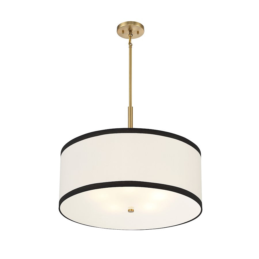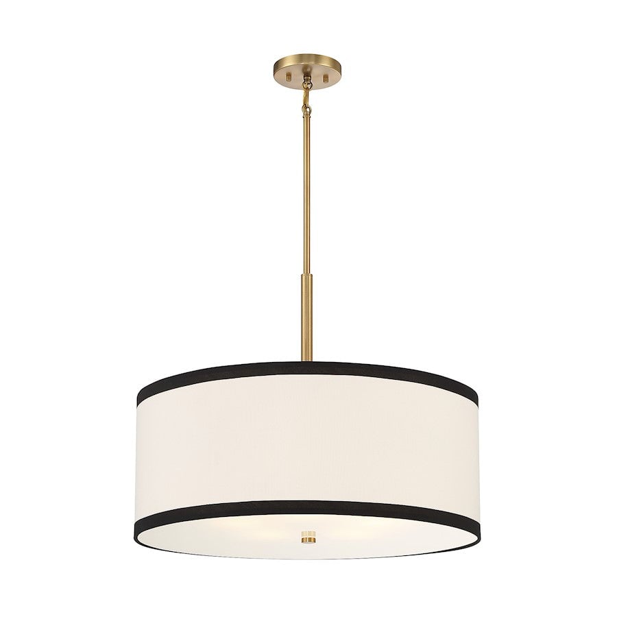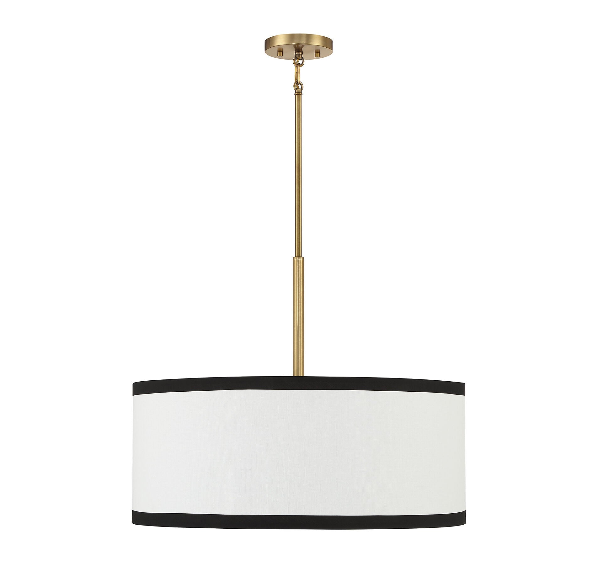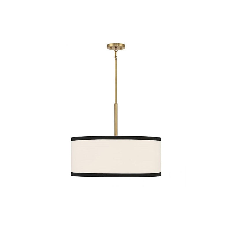The Bellacor Pendant Light by Mooijane features a crisply tailored design with a striking two-tone appeal. Its white fabric shade, edged in black, complements the warm natural brass finish, creating a bright and stylish addition to any space. Ideal for adding elegance and sophistication to dining areas or kitchens.