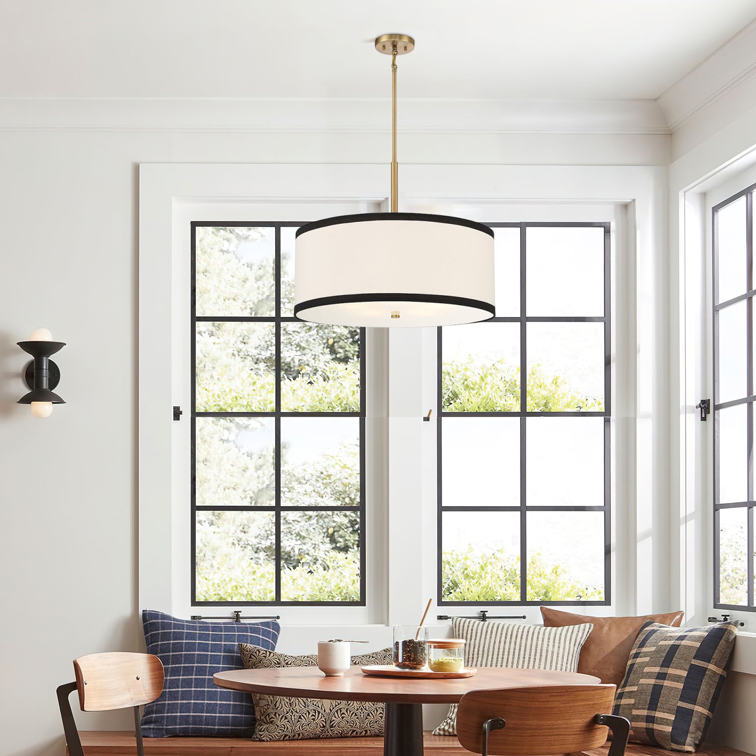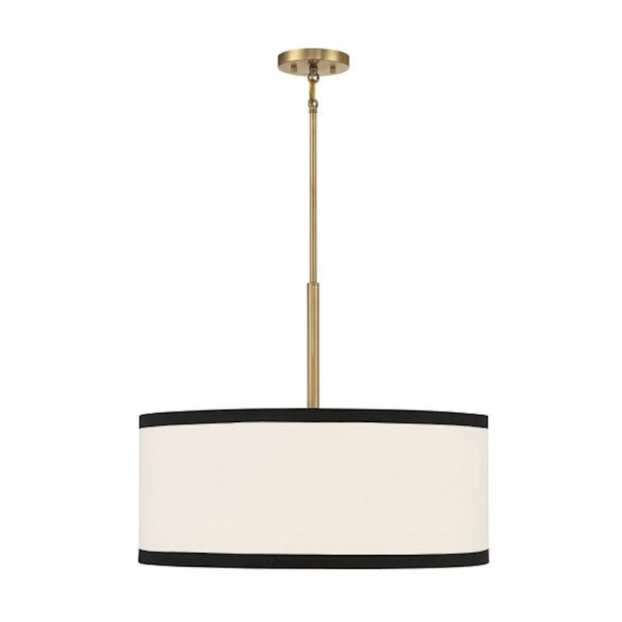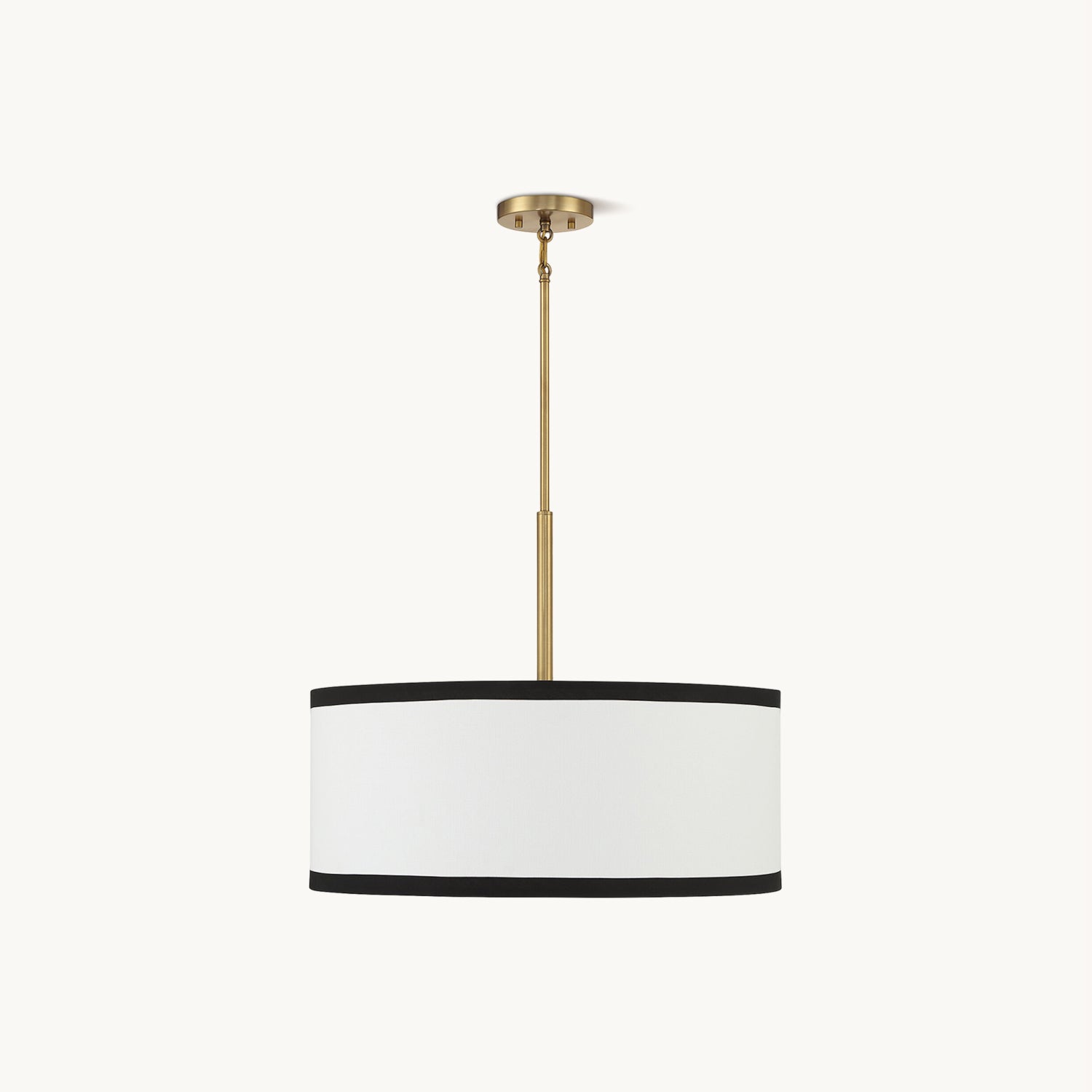 The Bellacor Pendant Light by Mooijane features a crisply tailored design with a striking two-tone appeal. Its white fabric shade, edged in black, complements the warm natural brass finish, creating a bright and stylish addition to any space. Ideal for adding elegance and sophistication to dining areas or kitchens.