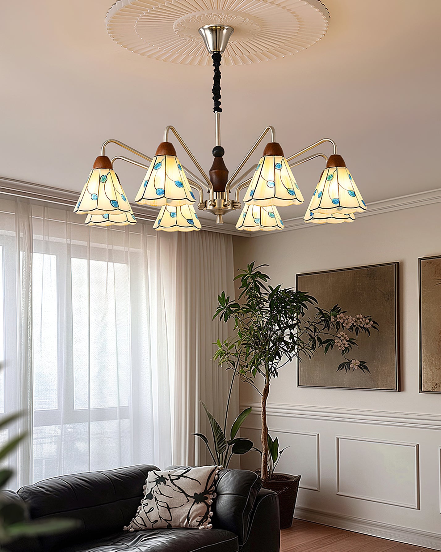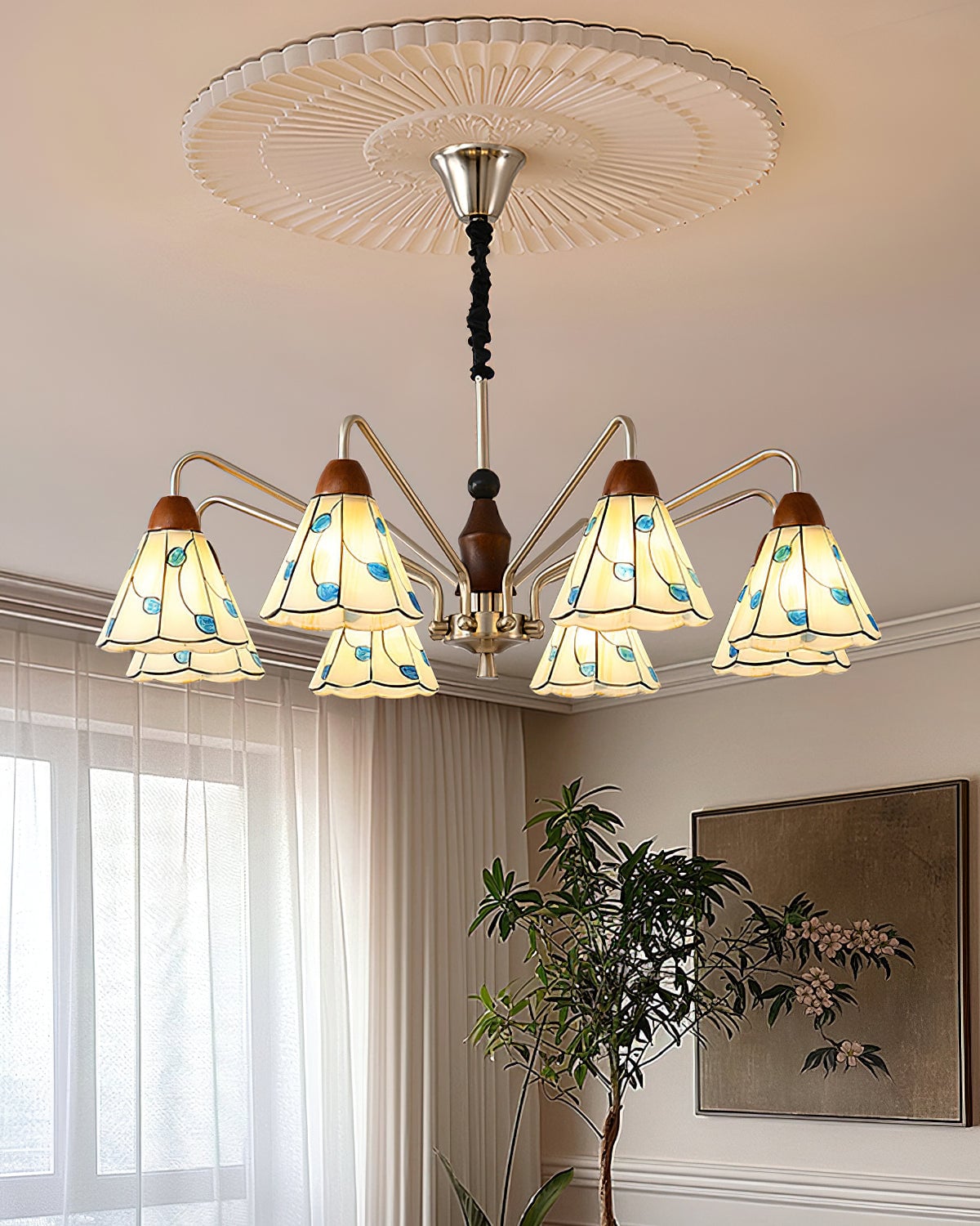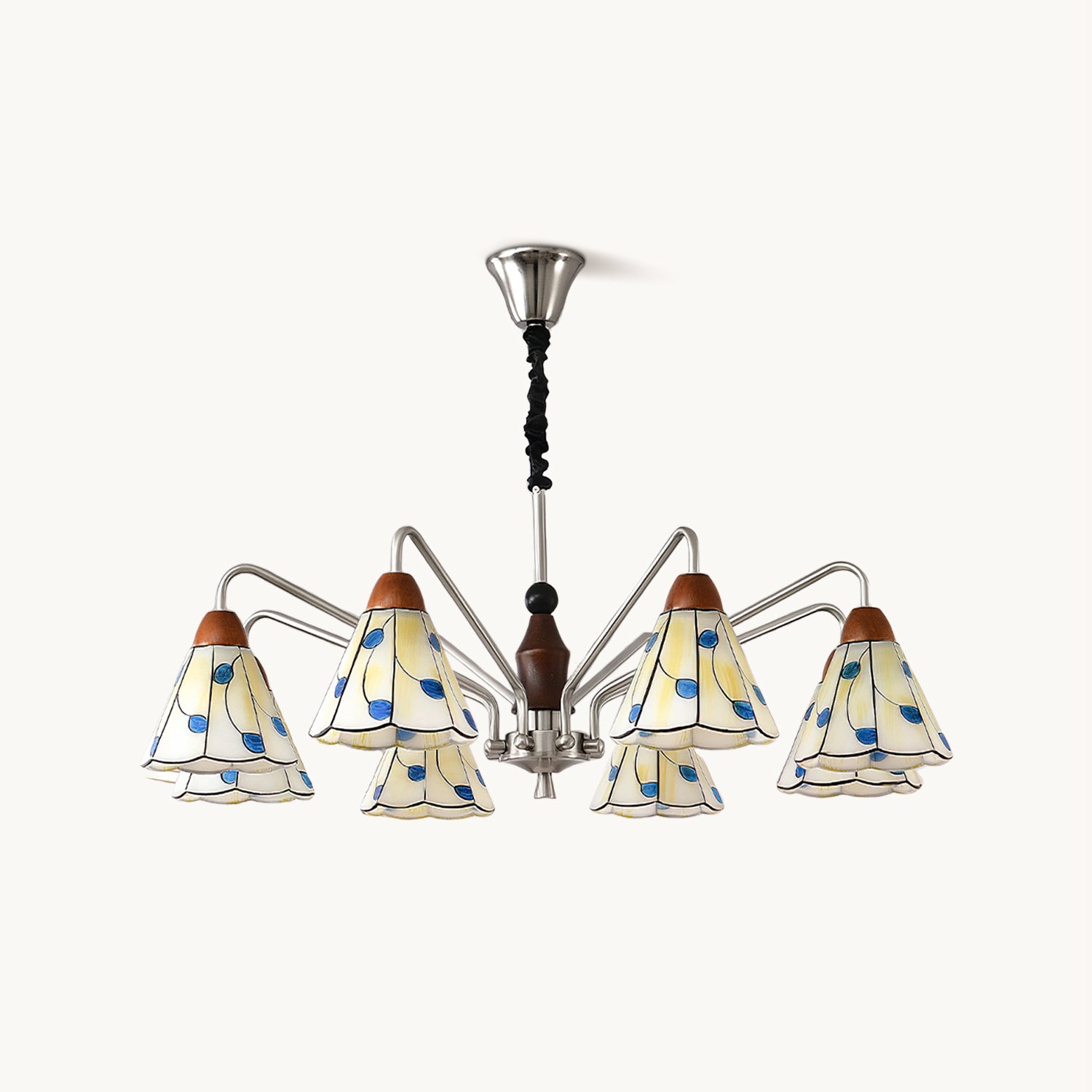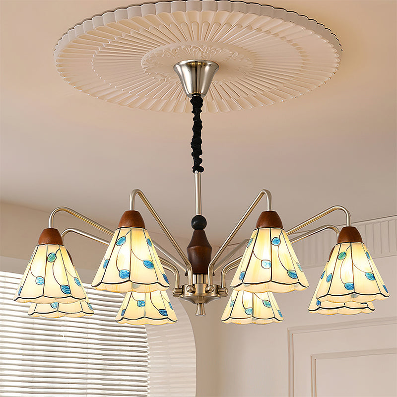 The Bellisse Chandelier from Mooijane blends vintage charm with natural elegance. Featuring gracefully curved metal arms with a soft metallic sheen, its refined silhouette is both stable and stylish. Stained glass shades, shaped like delicate petals and accented with blue-green leaf motifs, add a romantic, floral touch. A warm wooden lamp head completes the design, enhancing its artisanal appeal.