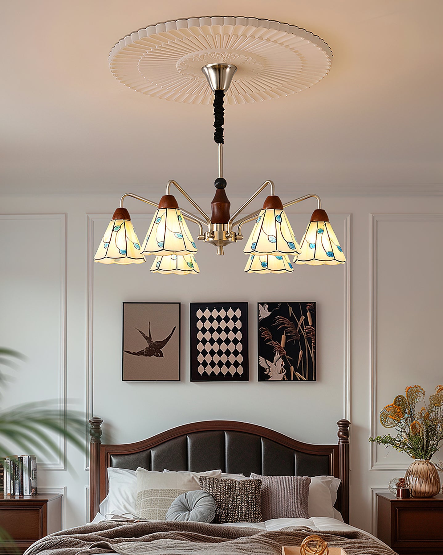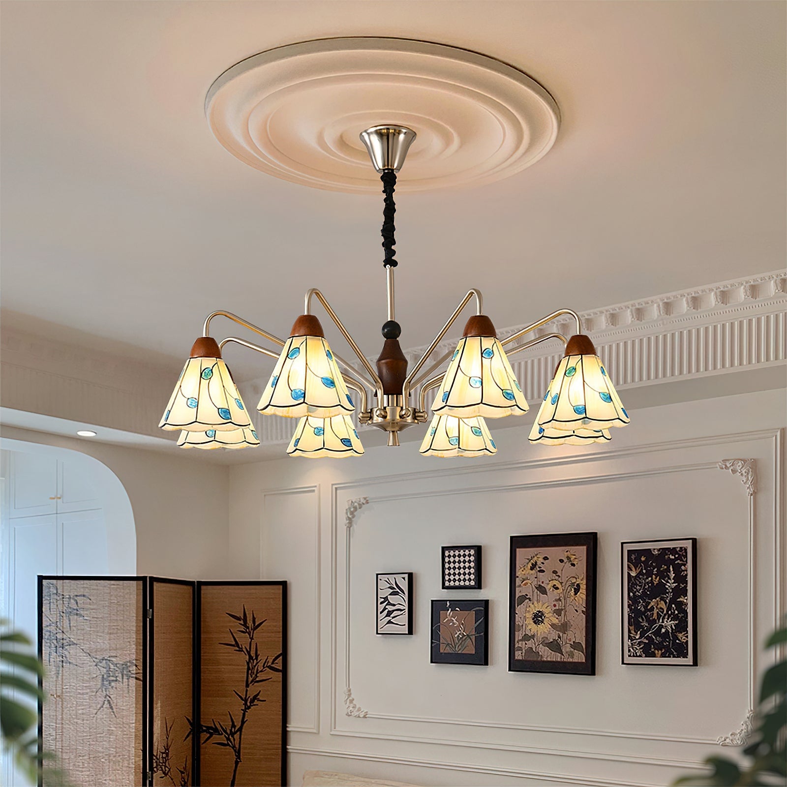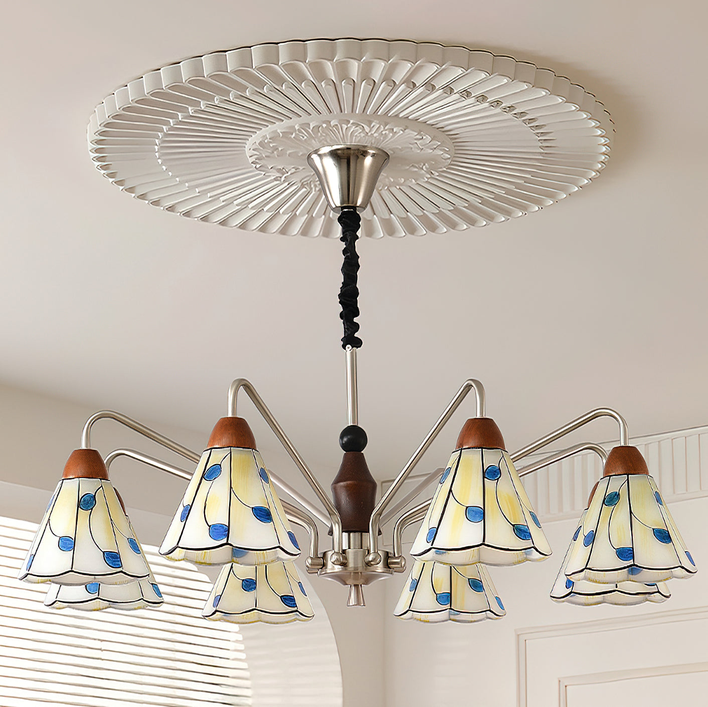 The Bellisse Chandelier from Mooijane blends vintage charm with natural elegance. Featuring gracefully curved metal arms with a soft metallic sheen, its refined silhouette is both stable and stylish. Stained glass shades, shaped like delicate petals and accented with blue-green leaf motifs, add a romantic, floral touch. A warm wooden lamp head completes the design, enhancing its artisanal appeal.