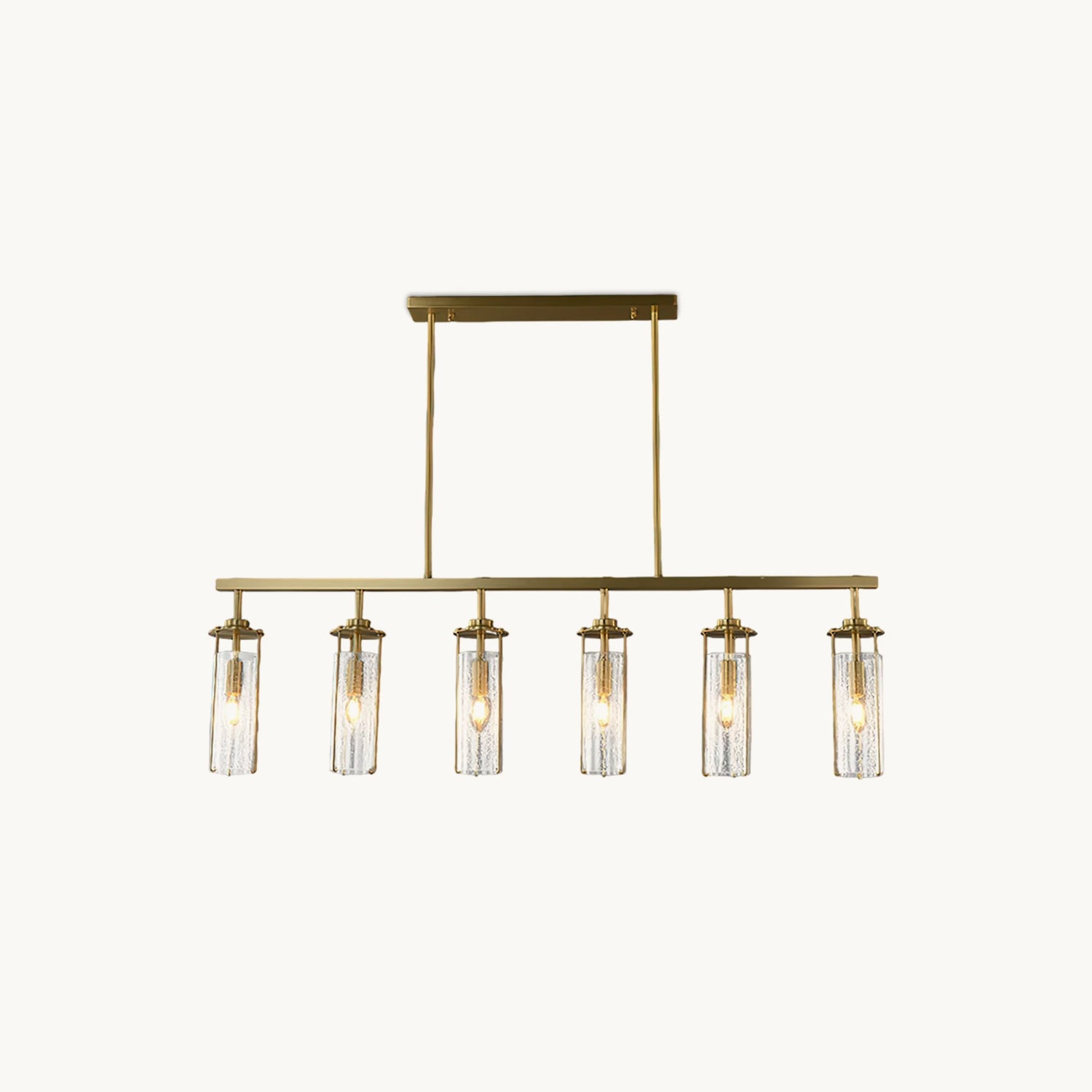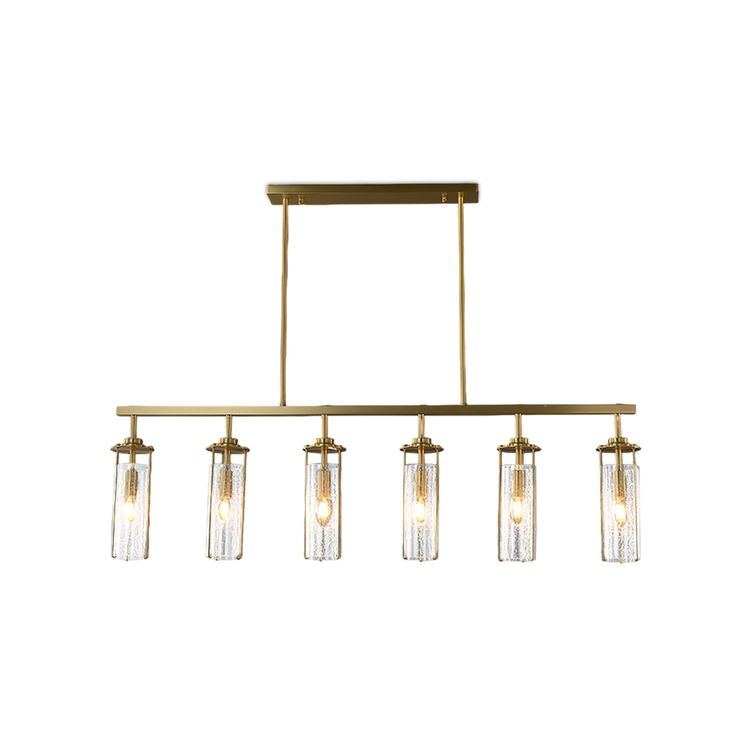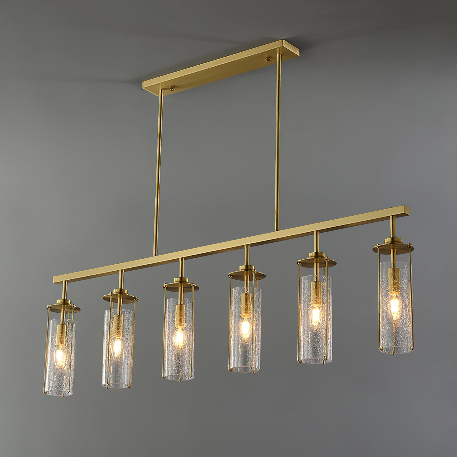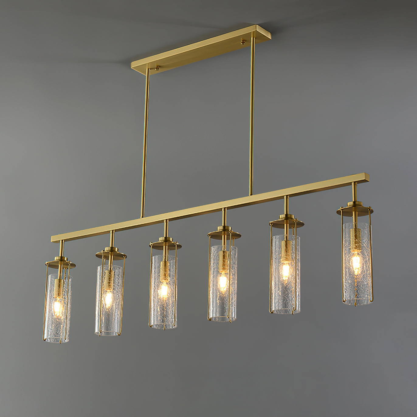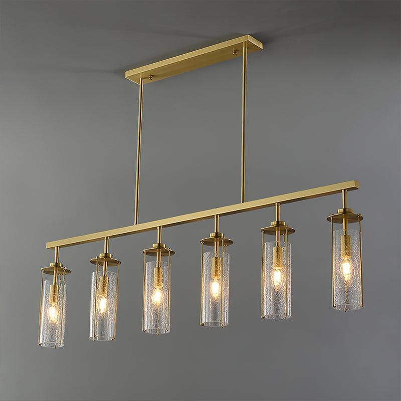 Elevate any room with this Belmont Crackle Glass Chandelier from Mooijane. Crafted from a polished solid copper body and six clear cylindrical crackle glass pieces, this modern island chandelier emits a soft, diffused light that complements any nature-inspired decor. Perfect for the kitchen, dining room, living room, or bedroom, its simple, elegant design is sure to turn heads. Add a touch of sophistication to your space.