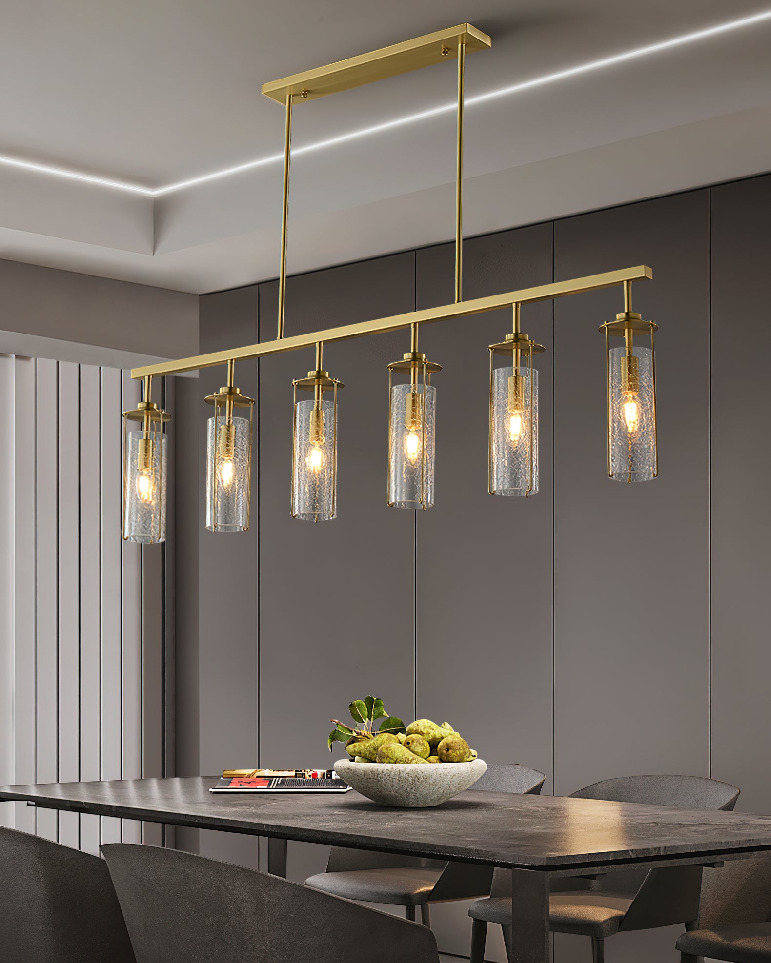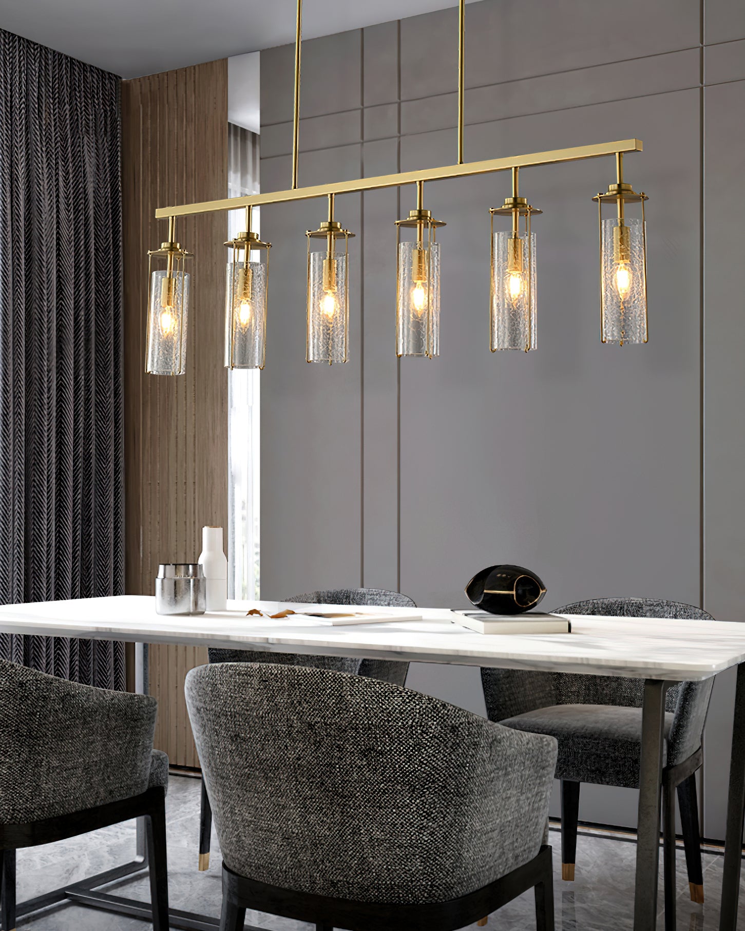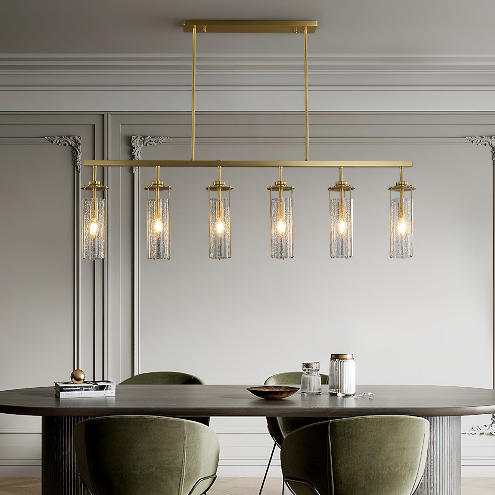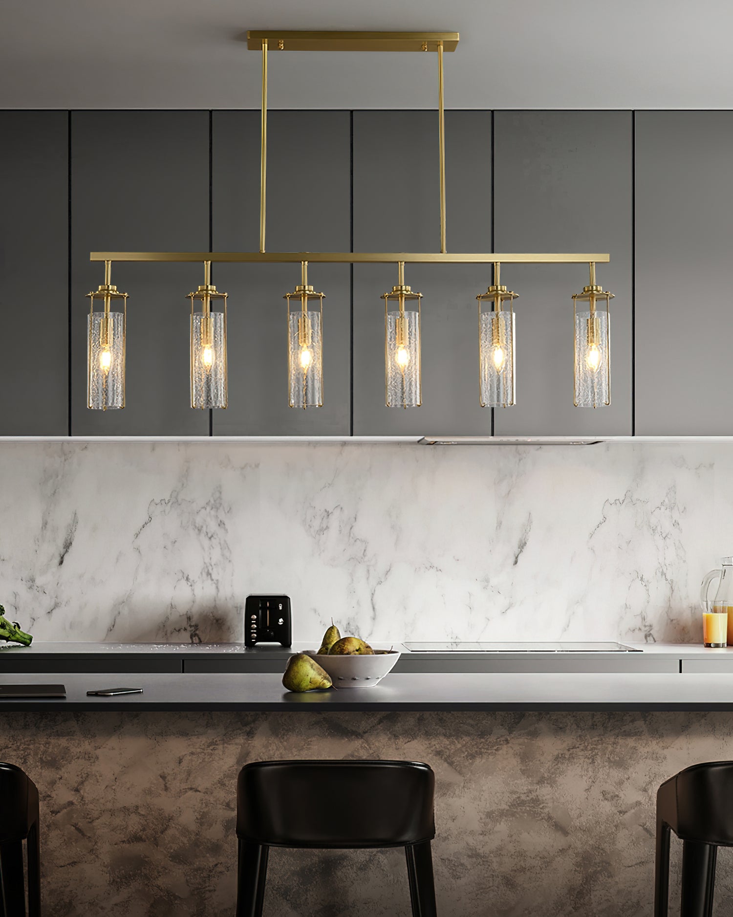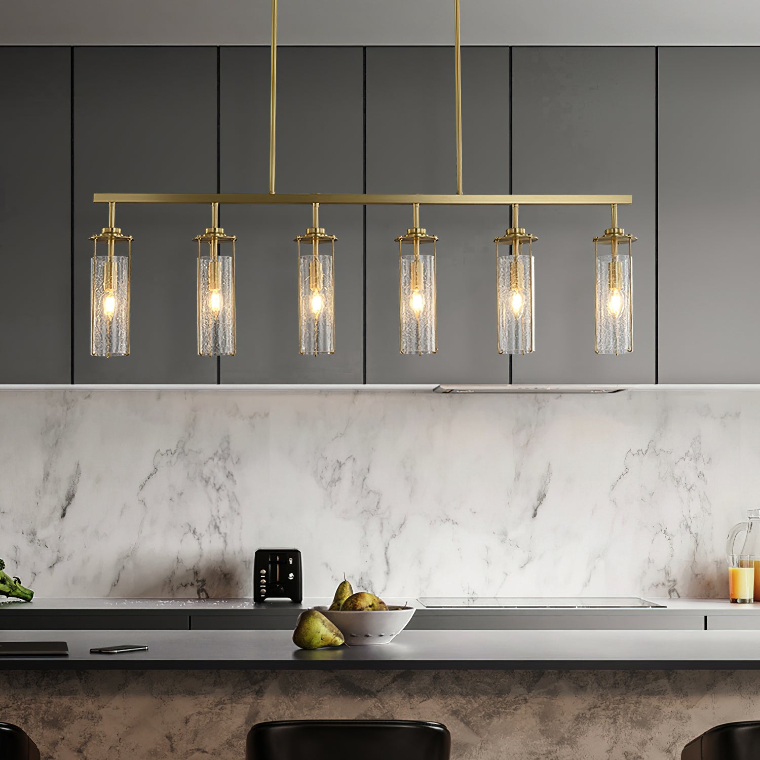 Elevate any room with this Belmont Crackle Glass Chandelier from Mooijane. Crafted from a polished solid copper body and six clear cylindrical crackle glass pieces, this modern island chandelier emits a soft, diffused light that complements any nature-inspired decor. Perfect for the kitchen, dining room, living room, or bedroom, its simple, elegant design is sure to turn heads. Add a touch of sophistication to your space.