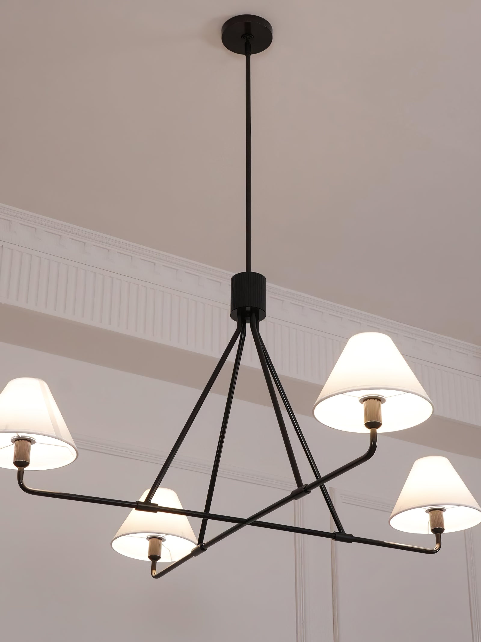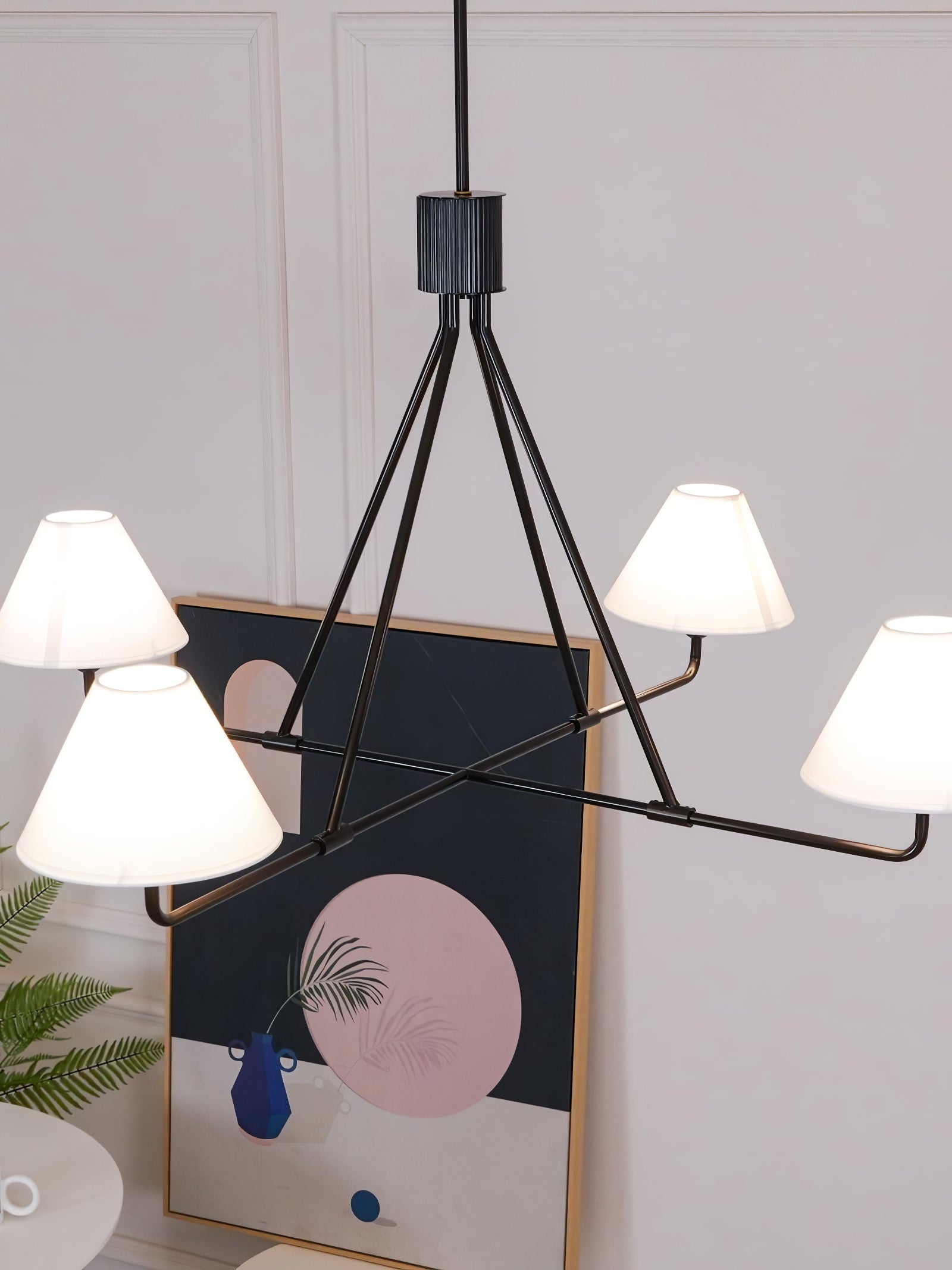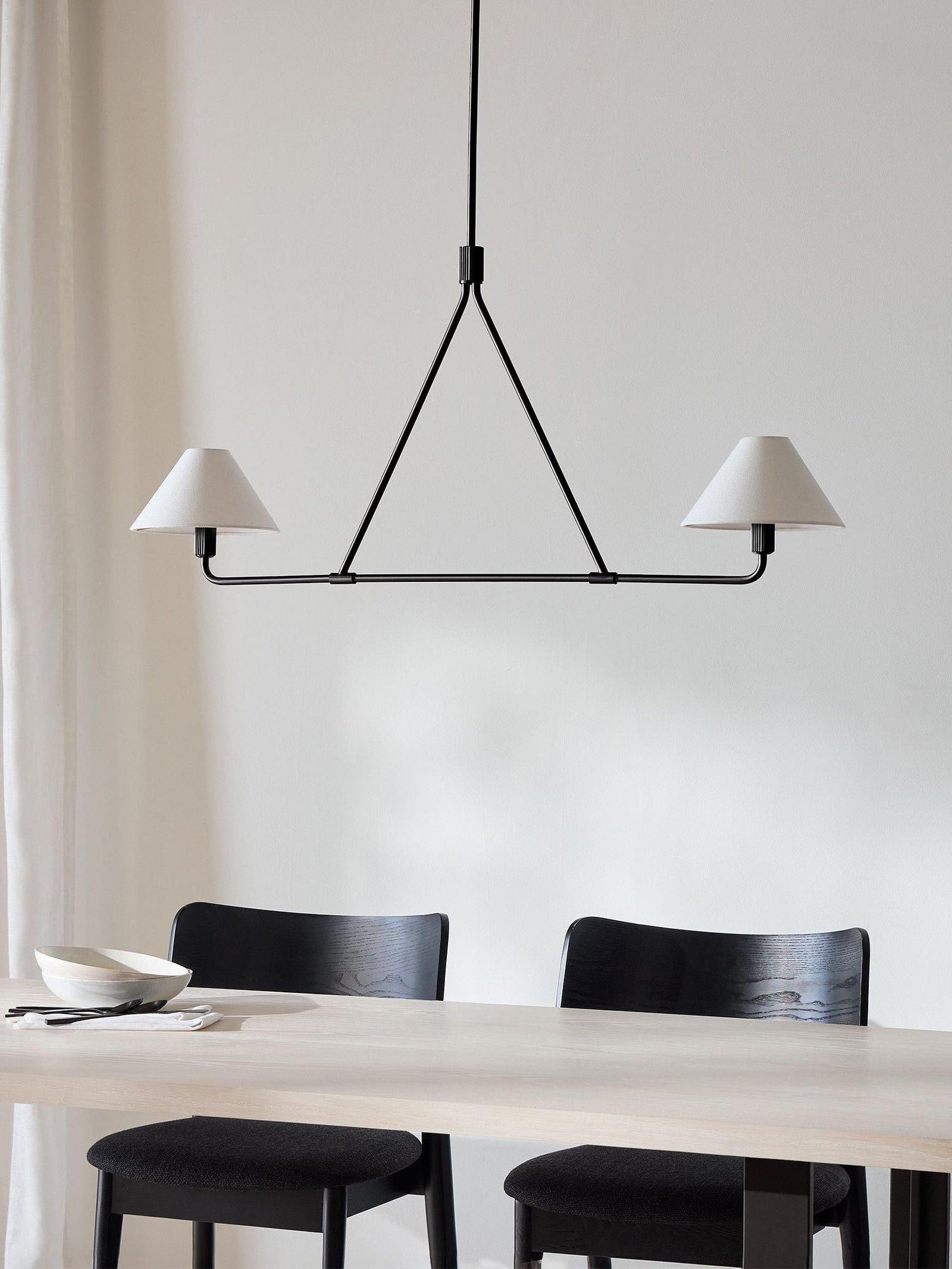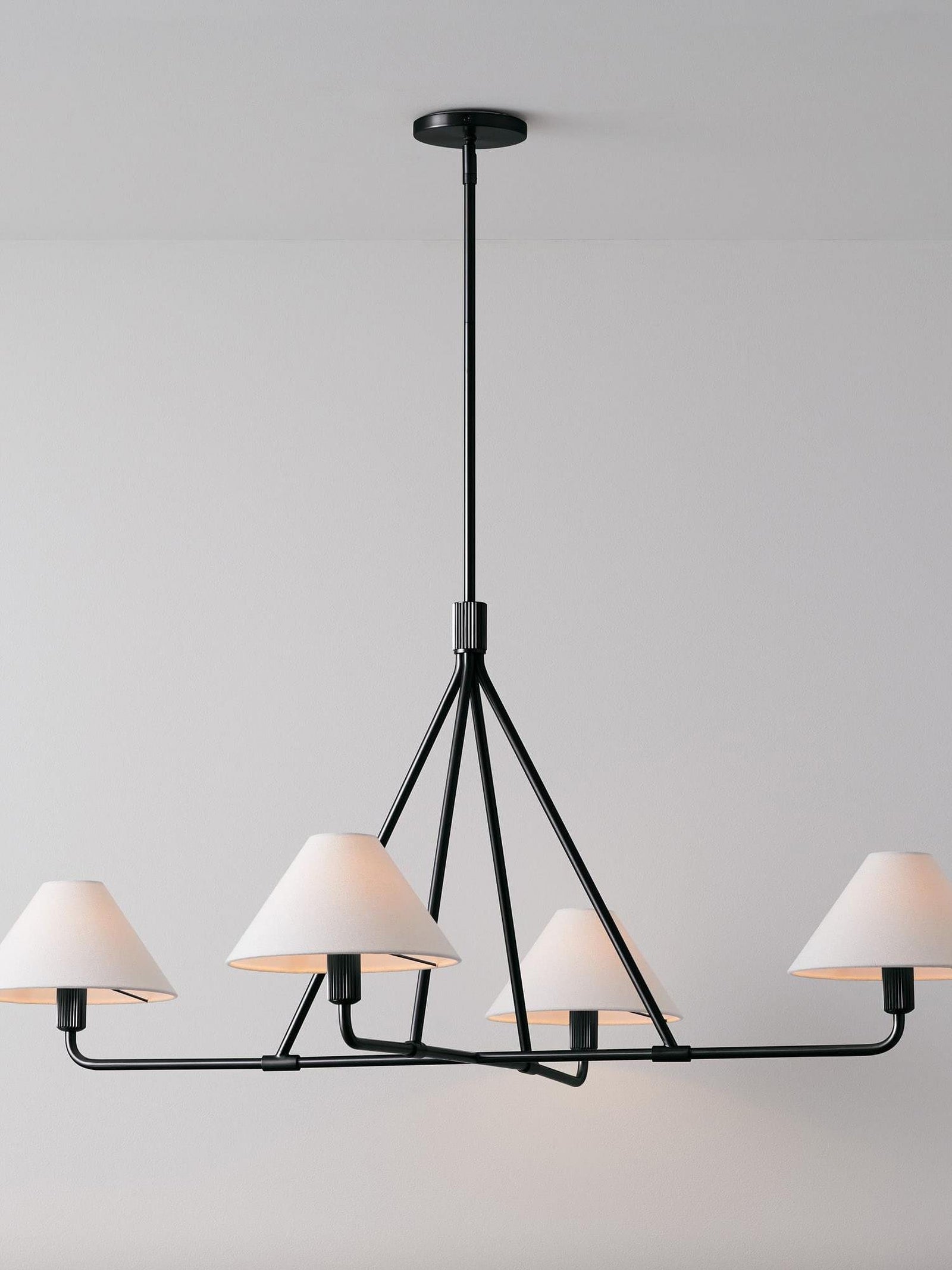The Black Beatrix Chandelier is a minimalist masterpiece, featuring sharp angular lines and a bold architectural design. Its tapered linen shades exude modern elegance, making it the perfect statement piece above dining tables or console areas. Constructed with a durable steel frame, this contract-grade chandelier ensures long-lasting style and functionality. Ideal for spaces seeking a balance of contemporary flair and timeless charm.