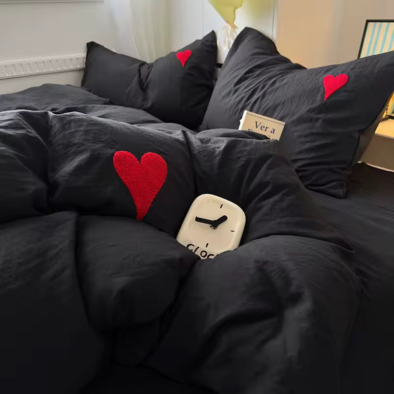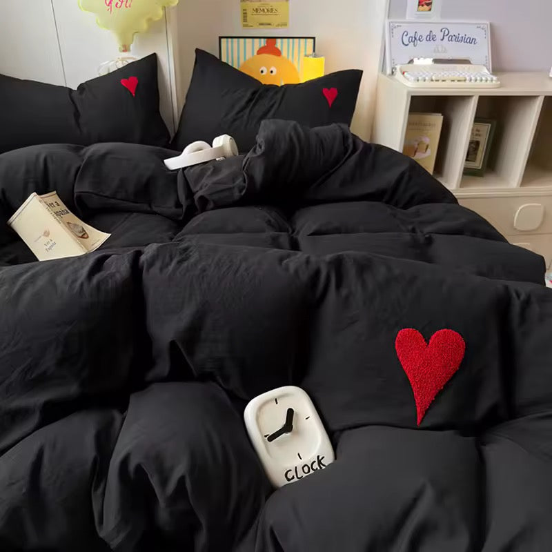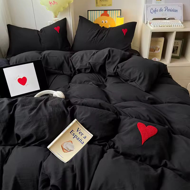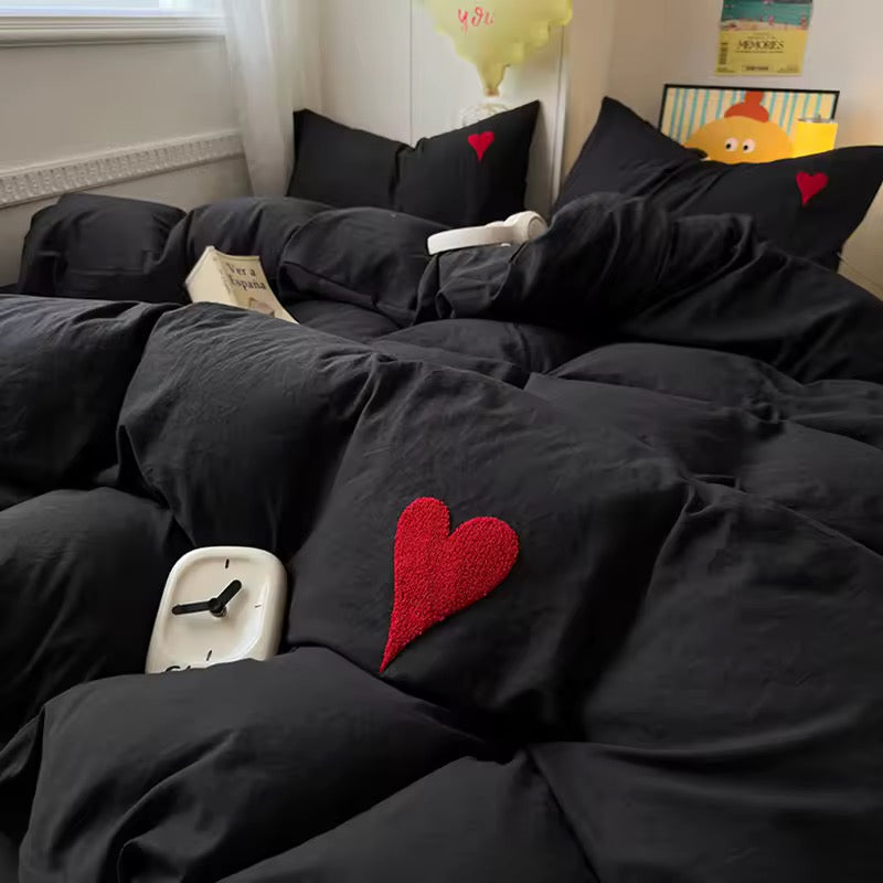 Embrace the perfect blend of softness and edge with our Black Heart Cotton Bedding Set, designed for the soft girl, dark academia, and emo coquette aesthetics. This 4-piece set includes a plush duvet cover, flat sheet, and two pillowcases, all in deep black cotton with bold red embroidered hearts. Made for teen girls, college dorm rooms, and TikTok-inspired room makeovers, this bedding set turns your space into a moody yet cozy sanctuary. Whether you're reading by soft light, working late, or filming your latest GRWM, it sets the perfect tone.