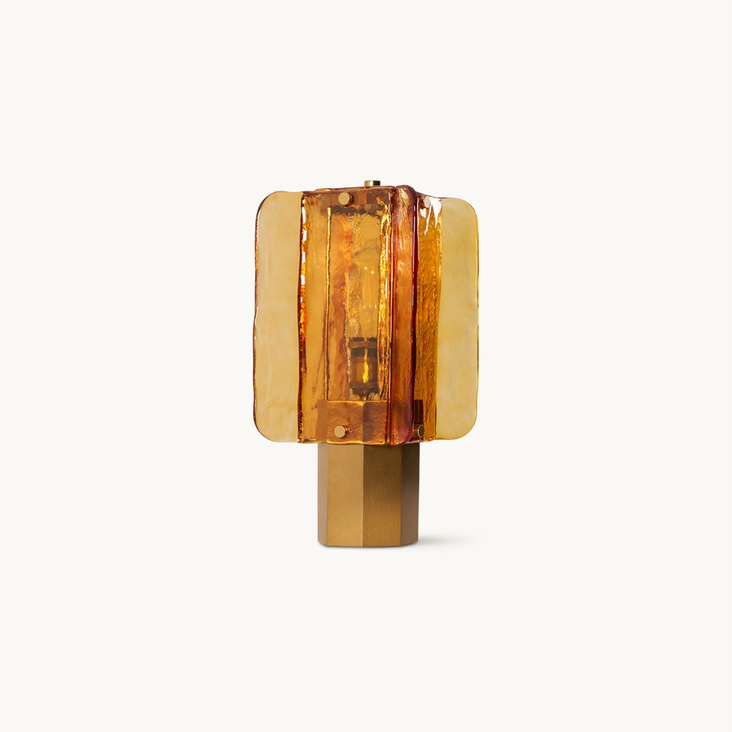 The Blason Table Lamp from Mooijane features a tessellation of molded, curved glass panels arranged like a collage. The warm amber hue creates a gentle glow, reminiscent of the Roman afternoon sun. The time-worn metal base contrasts beautifully with the translucent glass, offering a vintage elegance with a modern, minimalist aesthetic.