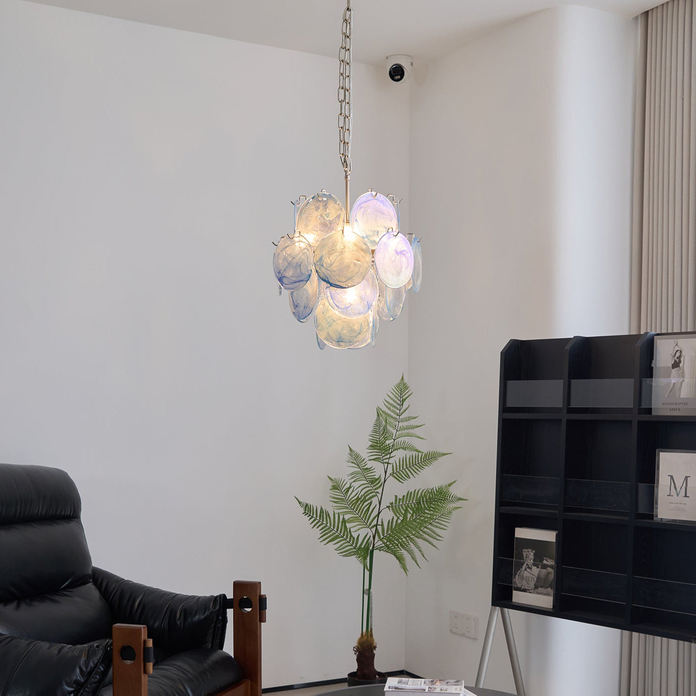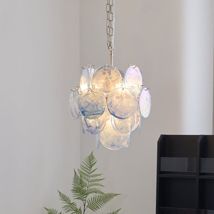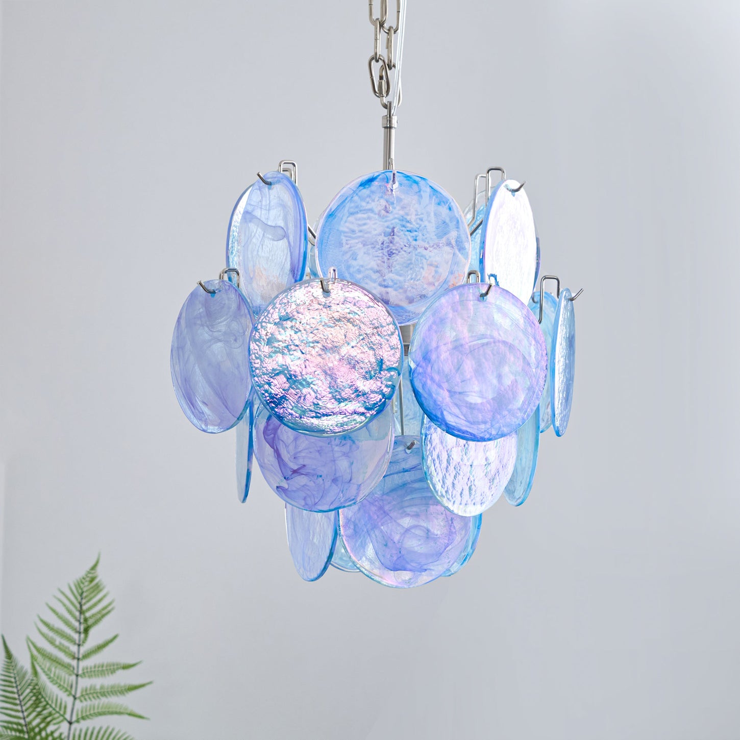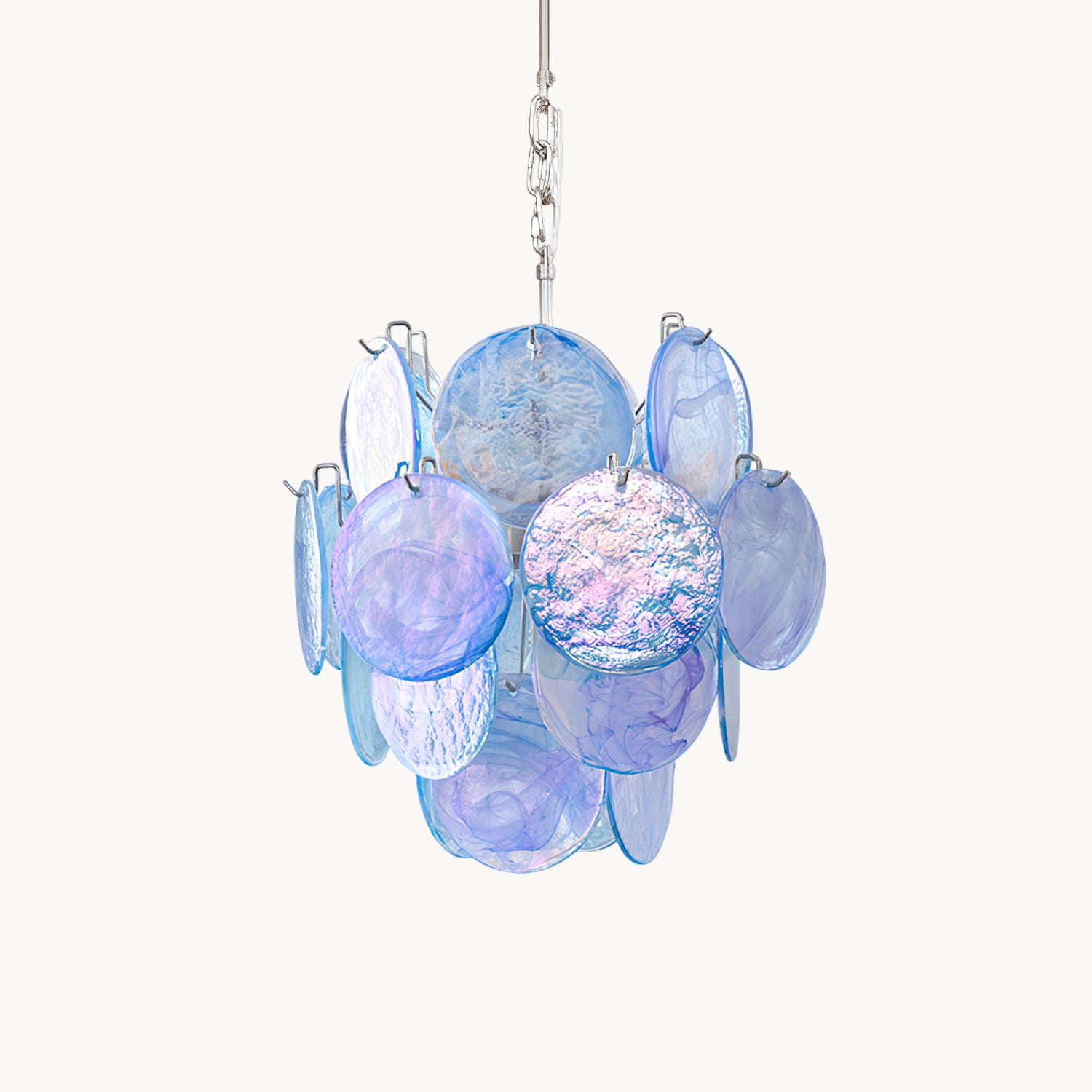 Elevate your space with the stunning Blue Murano Disc Chandelier from Mooijane. Each handcrafted Murano glass disc catches and reflects light, creating a mesmerizing display. With its blend of art and contemporary style, this chandelier adds a touch of luxury and sophistication to any room.