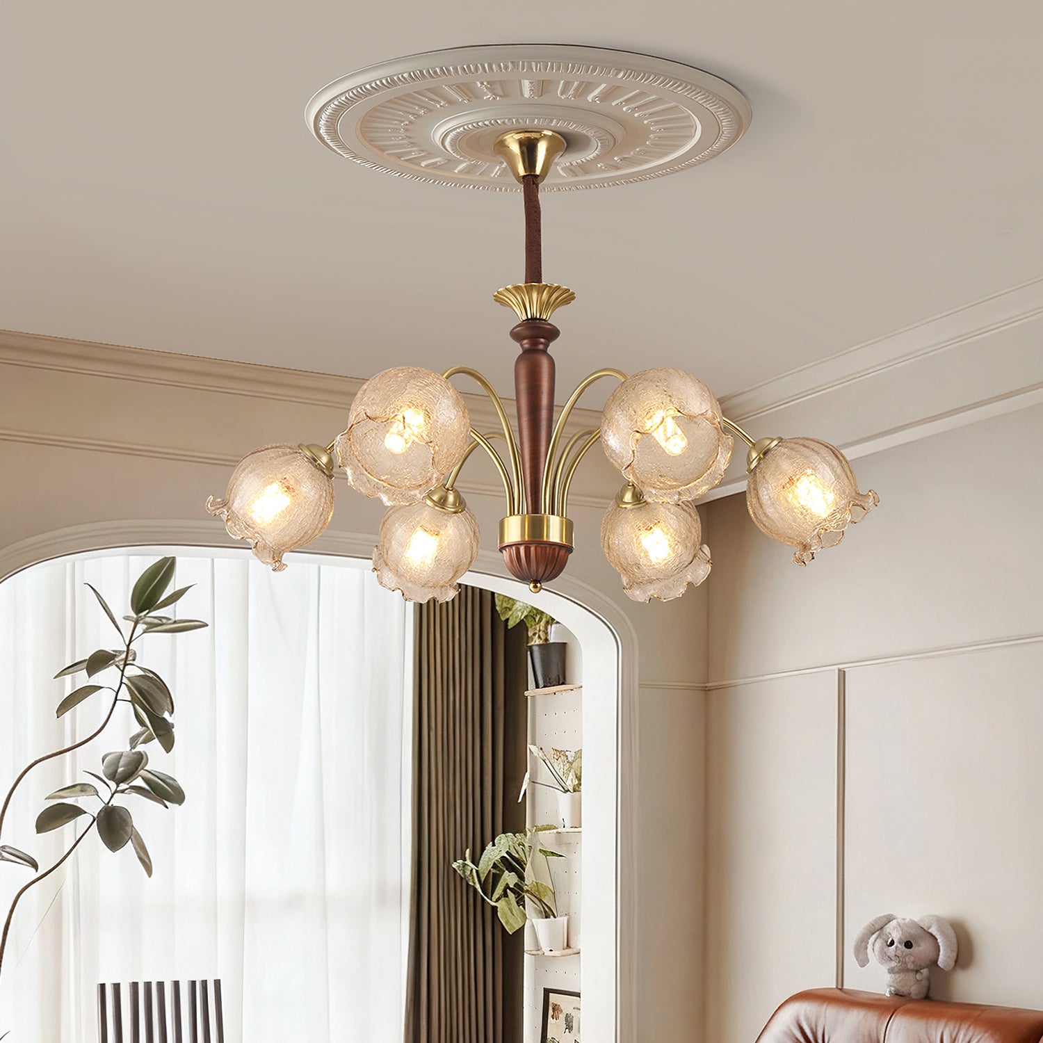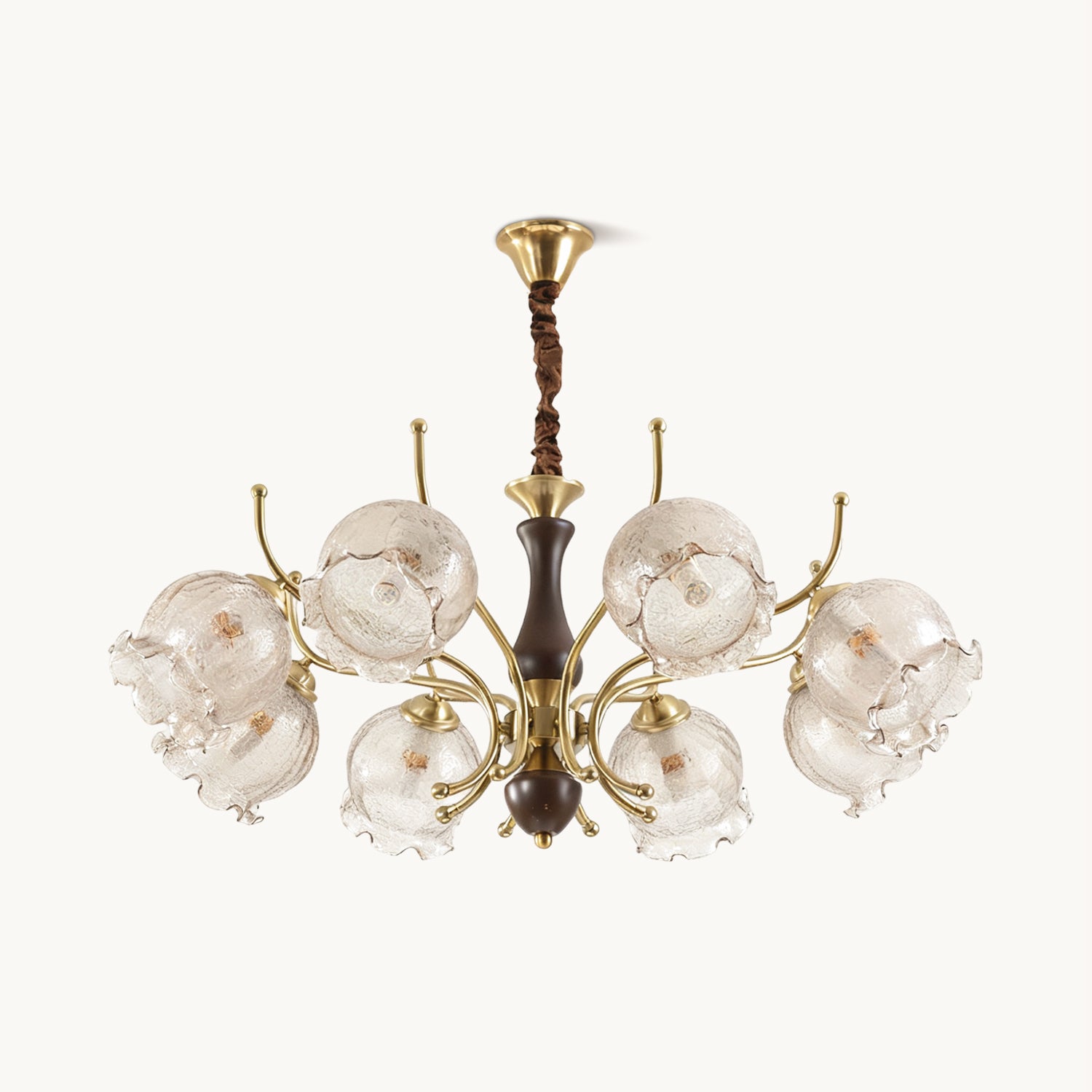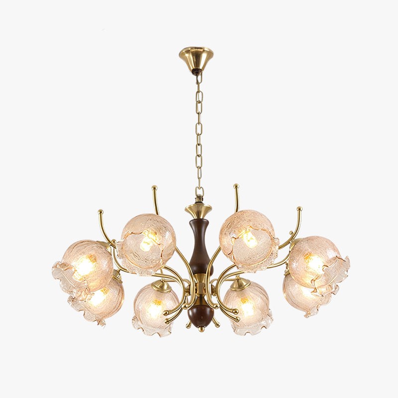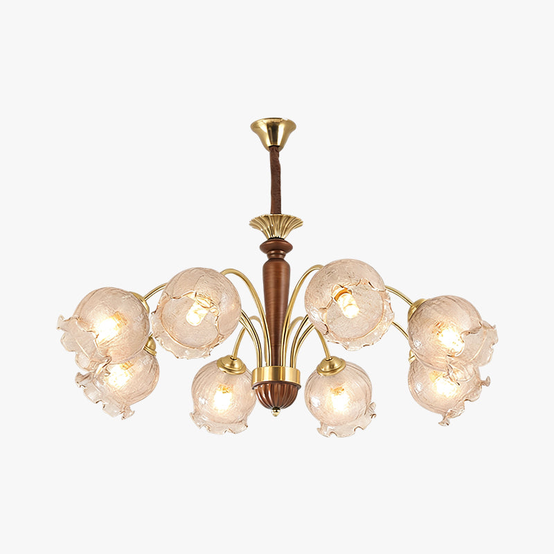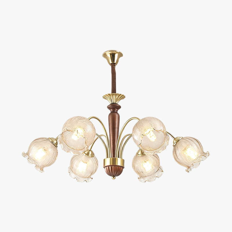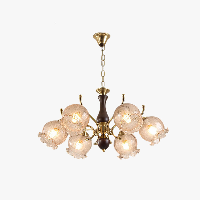 The Borelli Chandelier from Mooijane features a solid wood central column, complemented by streamlined metal arms and a handcrafted glass shade inspired by a flower bud. Its delicately textured, petal-shaped glass diffuses a soft amber glow, creating a warm, layered ambiance. The semi-flush design suits standard ceiling heights, making it ideal above dining tables, in living rooms, bedrooms, or hallways—adding a refined, vintage-inspired focal point to any interior.