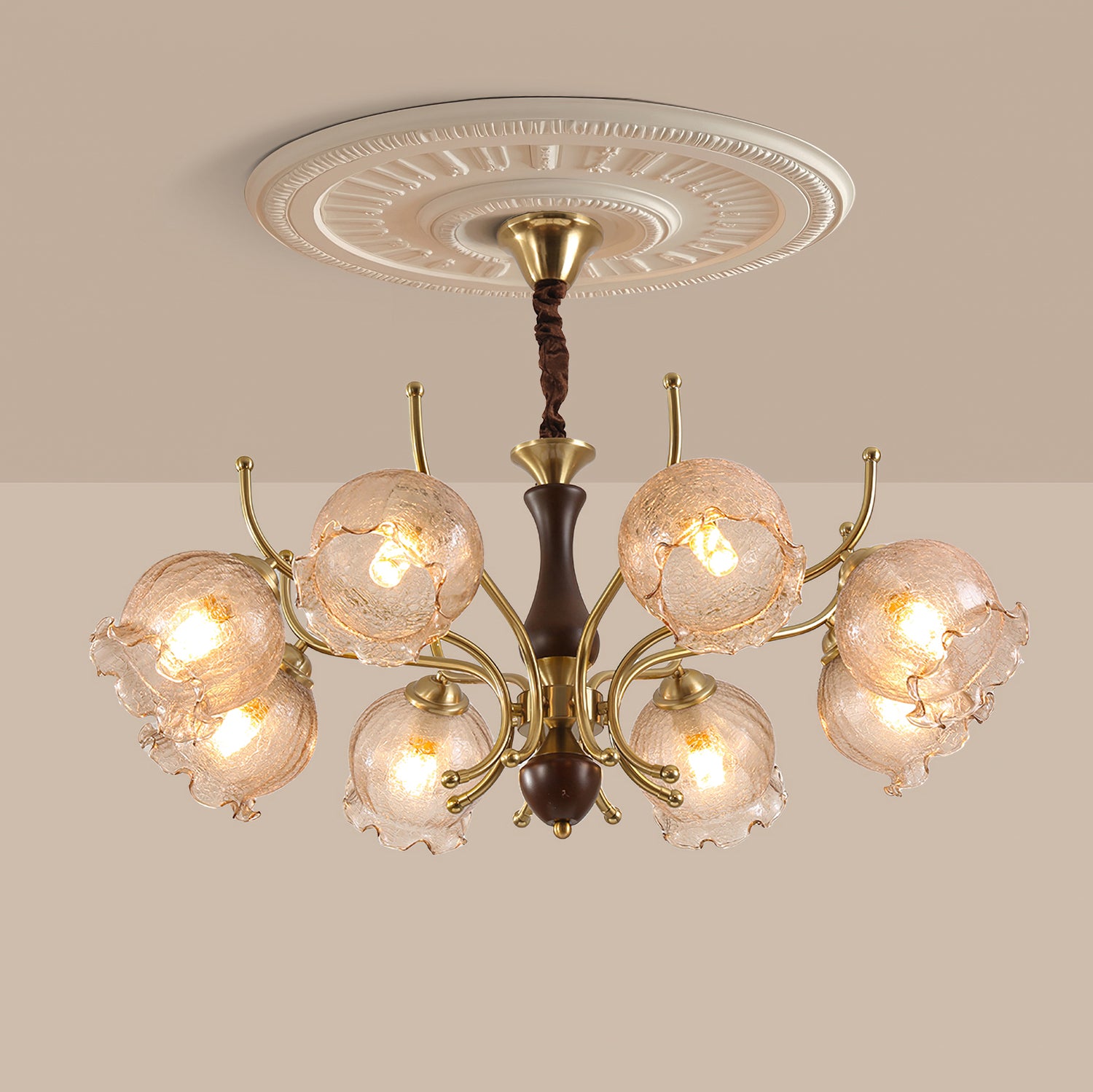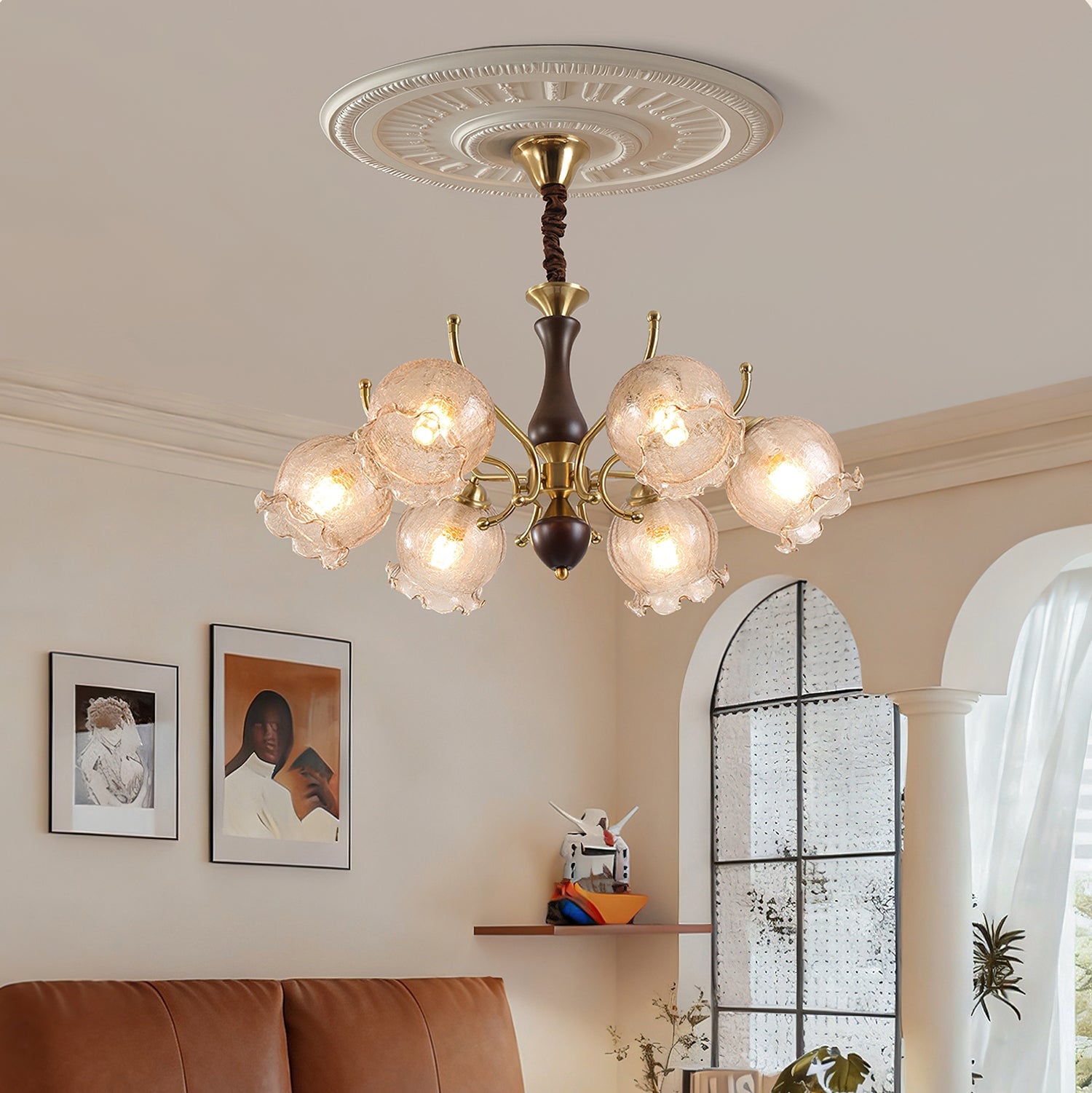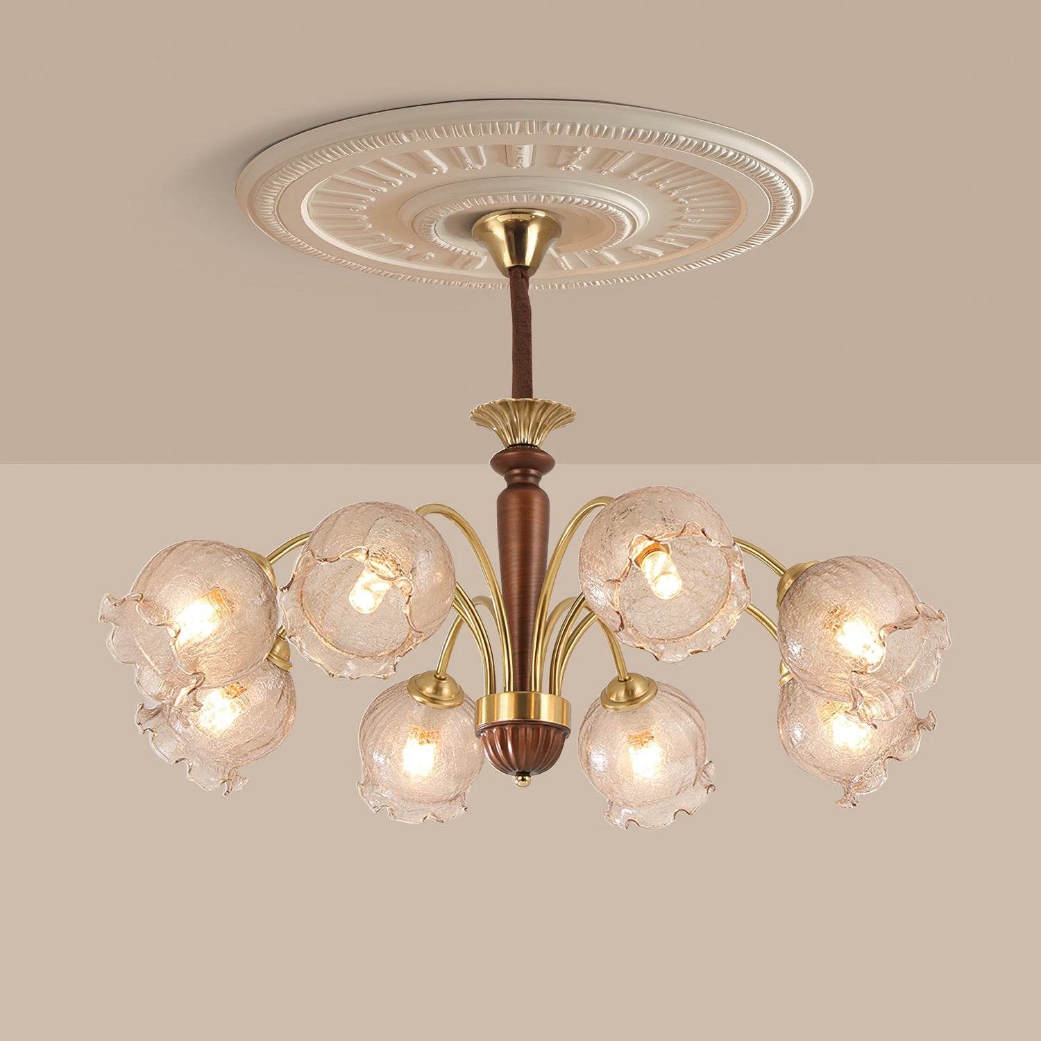 The Borelli Chandelier from Mooijane features a solid wood central column, complemented by streamlined metal arms and a handcrafted glass shade inspired by a flower bud. Its delicately textured, petal-shaped glass diffuses a soft amber glow, creating a warm, layered ambiance. The semi-flush design suits standard ceiling heights, making it ideal above dining tables, in living rooms, bedrooms, or hallways—adding a refined, vintage-inspired focal point to any interior.