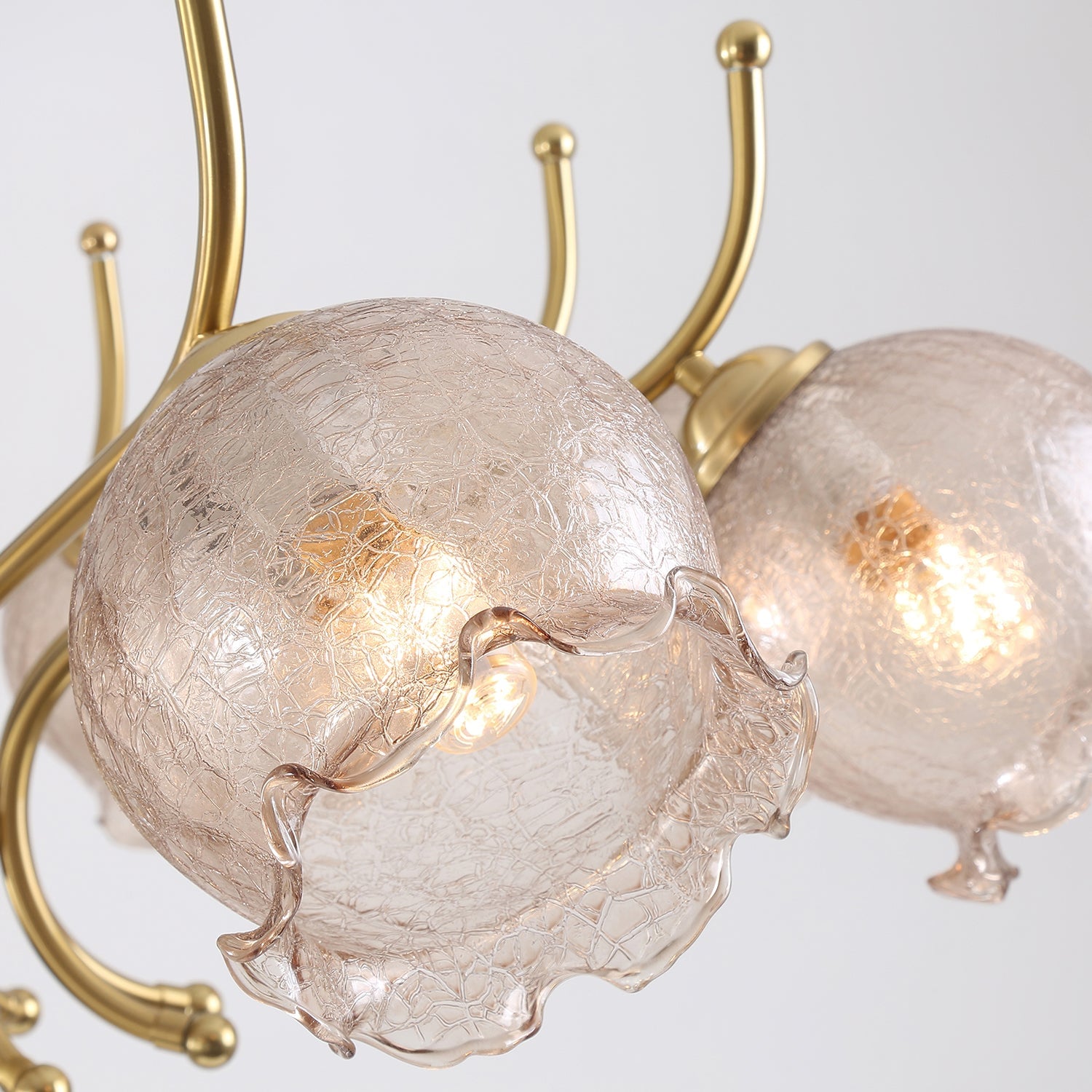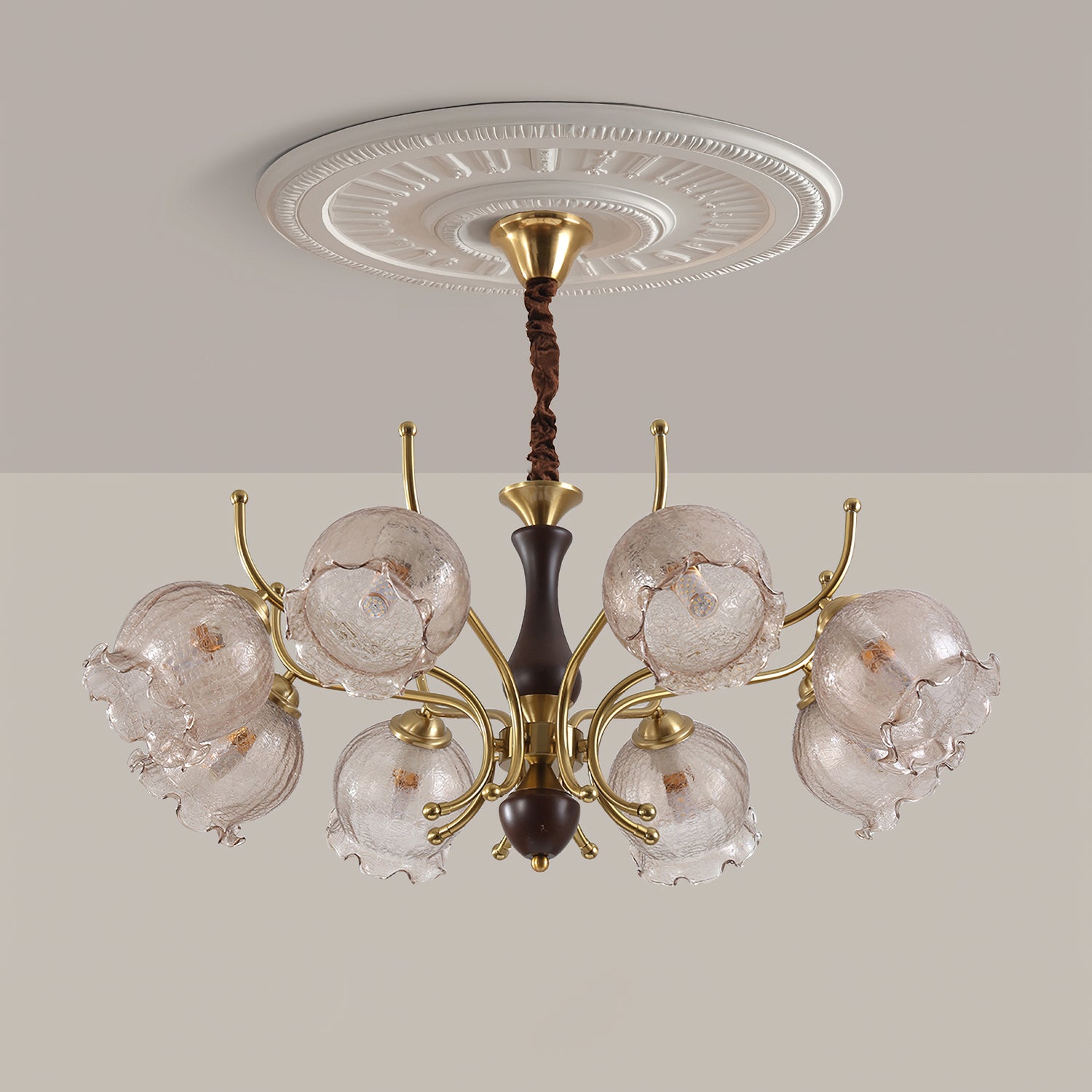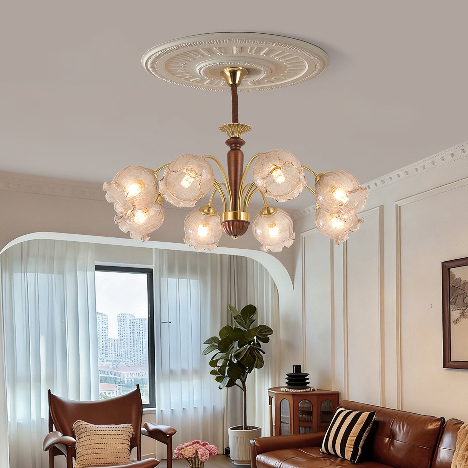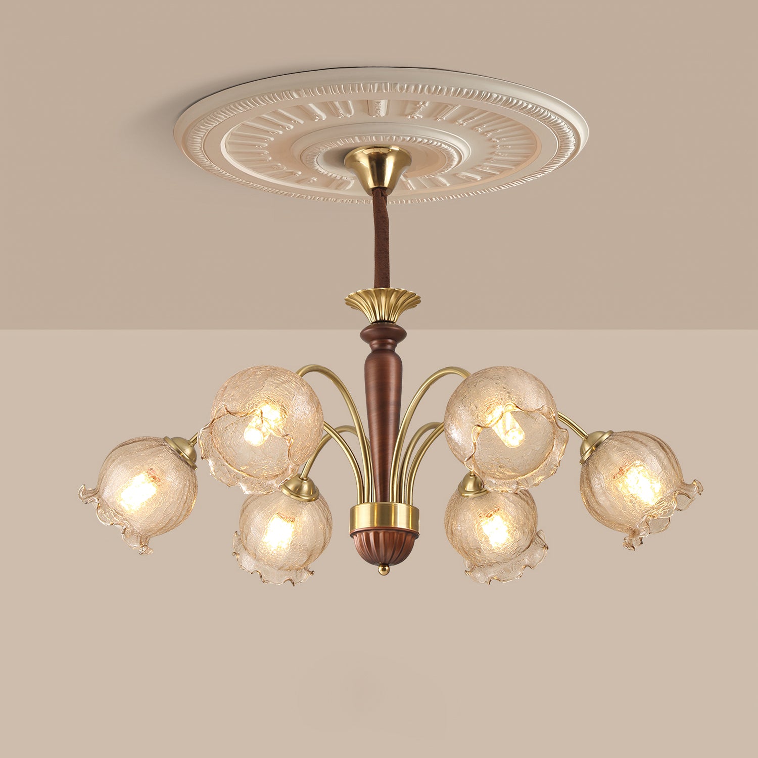 The Borelli Chandelier from Mooijane features a solid wood central column, complemented by streamlined metal arms and a handcrafted glass shade inspired by a flower bud. Its delicately textured, petal-shaped glass diffuses a soft amber glow, creating a warm, layered ambiance. The semi-flush design suits standard ceiling heights, making it ideal above dining tables, in living rooms, bedrooms, or hallways—adding a refined, vintage-inspired focal point to any interior.