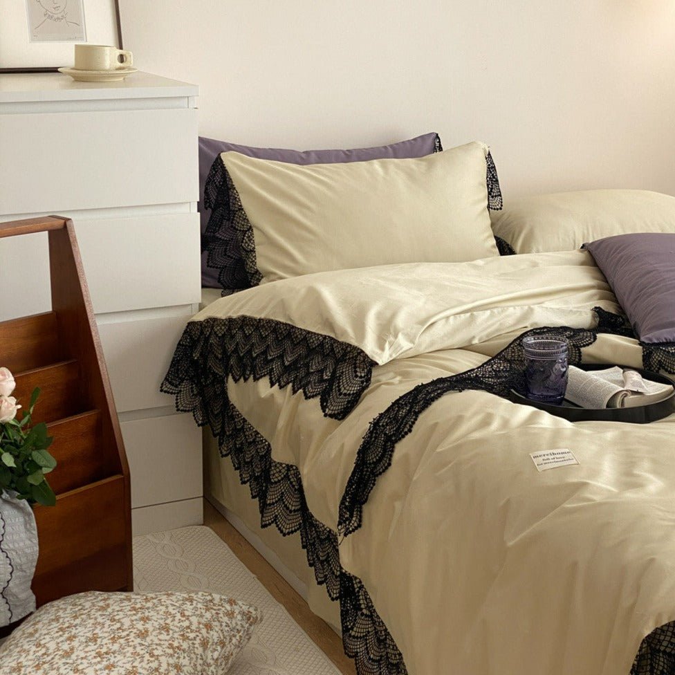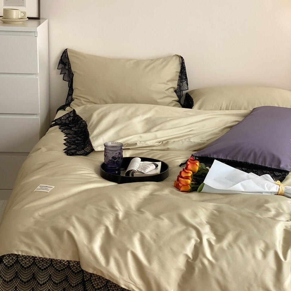 Add a sense of elegance to your bedroom with the Boudoir Quilt Cover Set. Available in ivory, blue or purple and trimmed in soft black lace this set is a luxurious way to style your space and get the ultimate night's sleep. Made from 100% cotton, this quilt cover is made for snuggling and is built for dreamy nights.