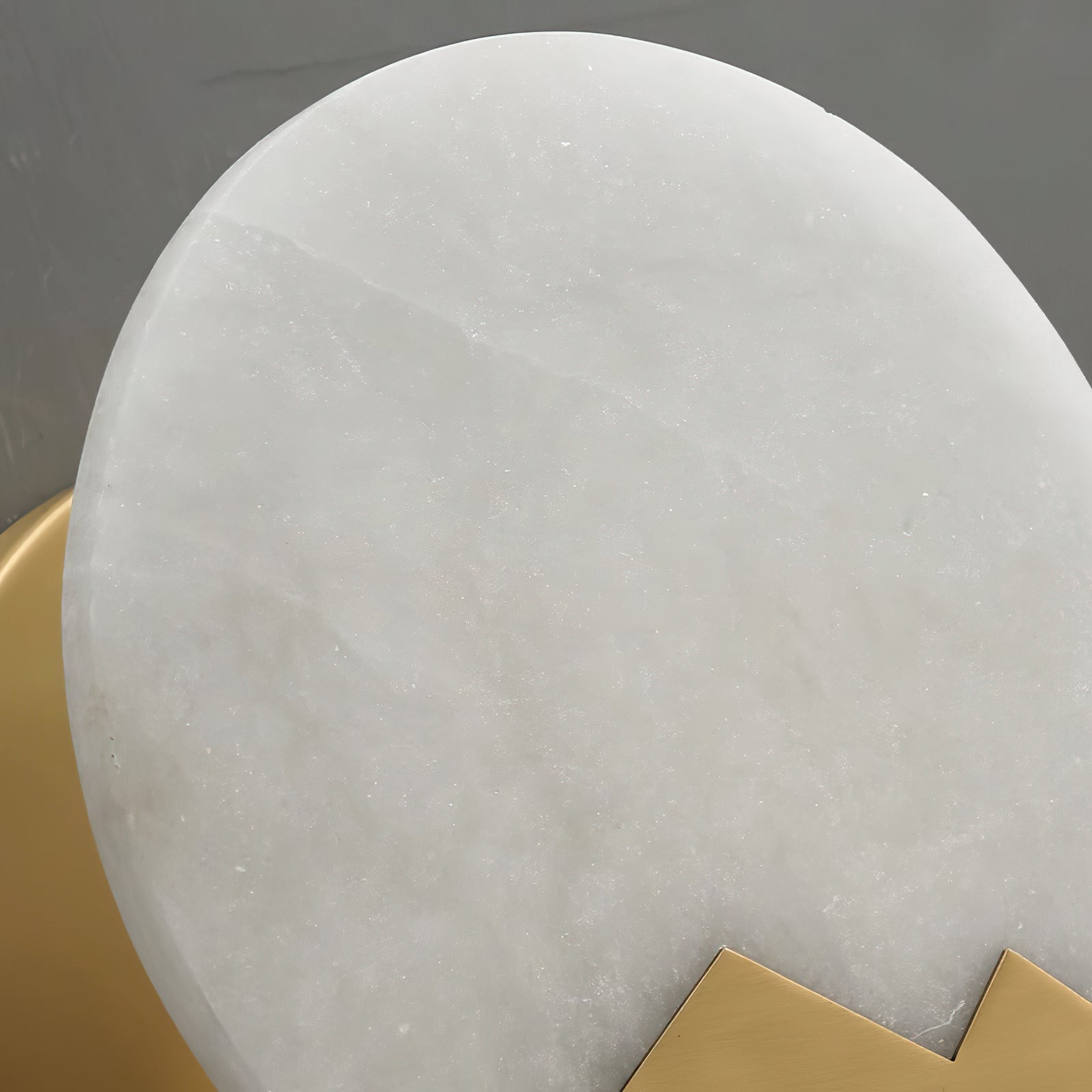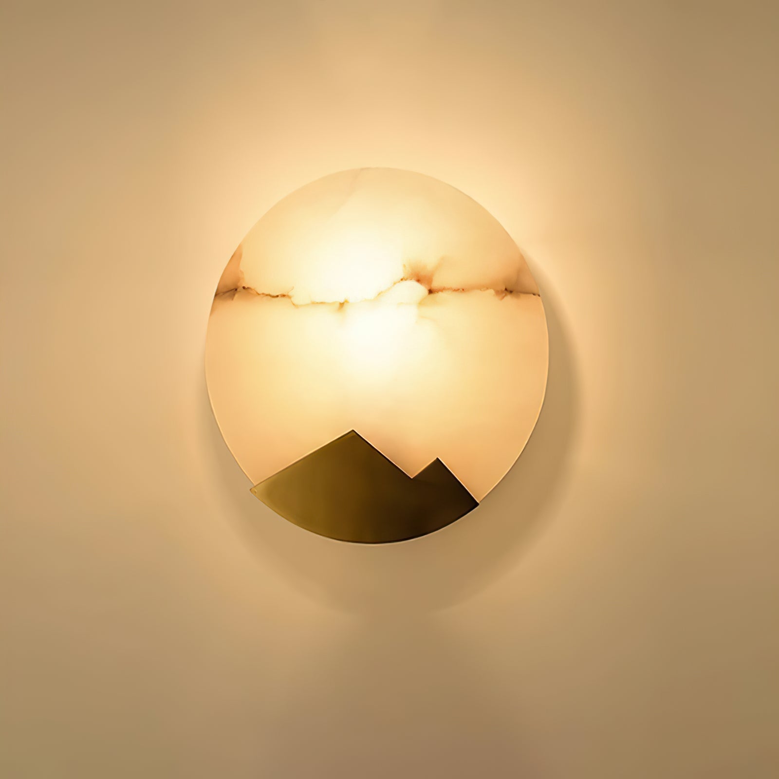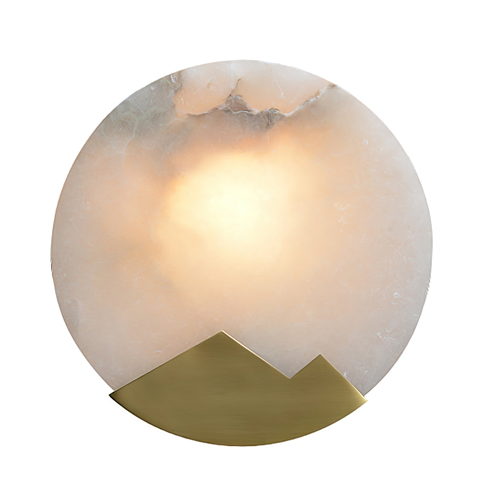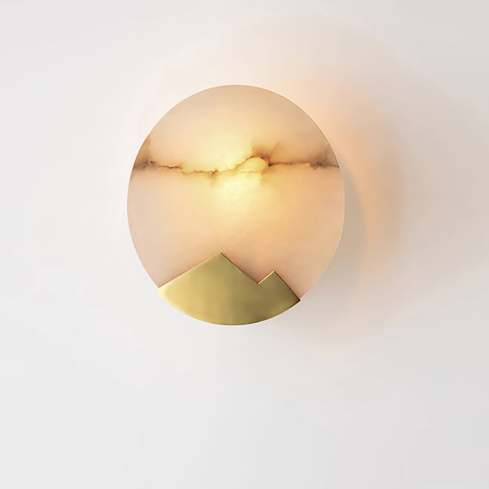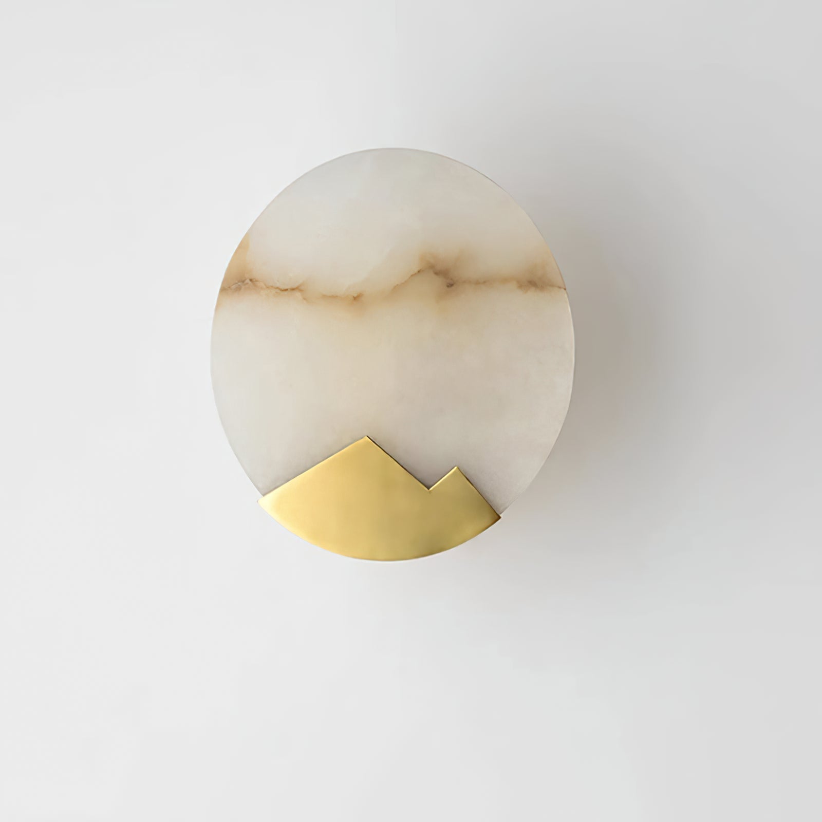 This Brass and Alabaster Round Wall Light features a circular alabaster panel that radiates a warm, diffused glow, highlighting the natural veining and texture of the stone. The design incorporates a unique brass accent at the bottom, shaped like abstract mountain peaks, adding an artistic and elegant touch to the fixture. The combination of the soft, organic patterns in the alabaster and the geometric brass element creates a visually intriguing contrast. Ideal for contemporary and minimalist interiors, this wall light serves as both a functional lighting piece and a decorative art object, bringing warmth and sophistication to any space.