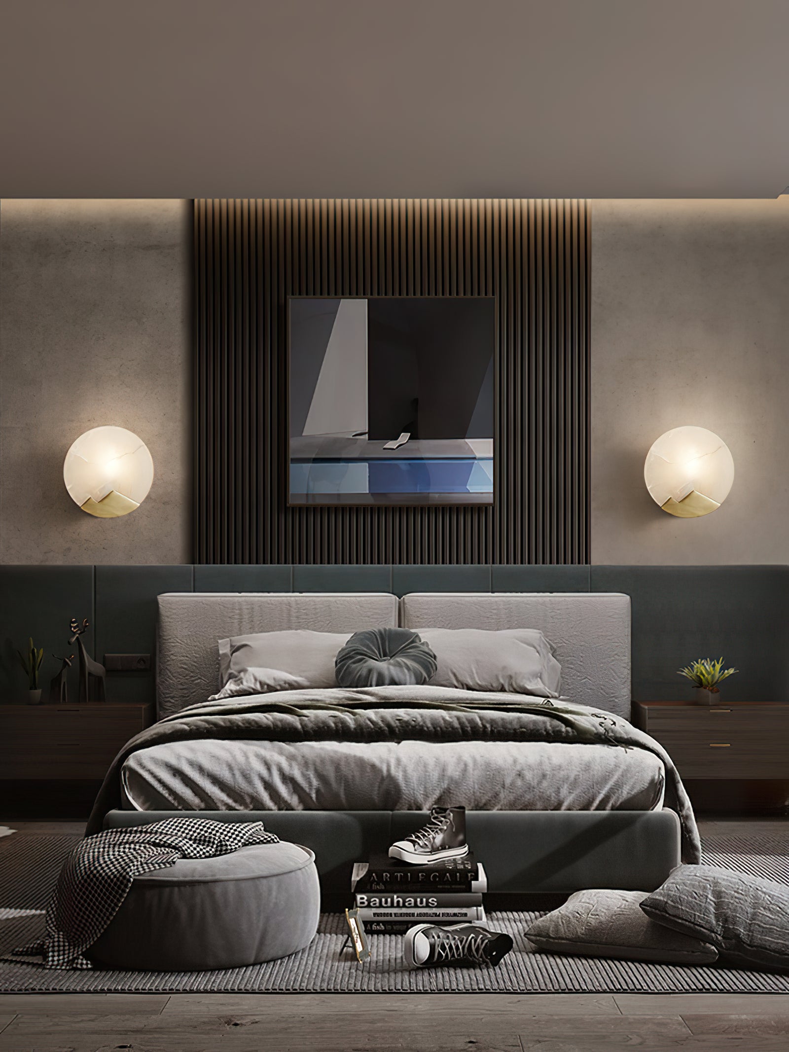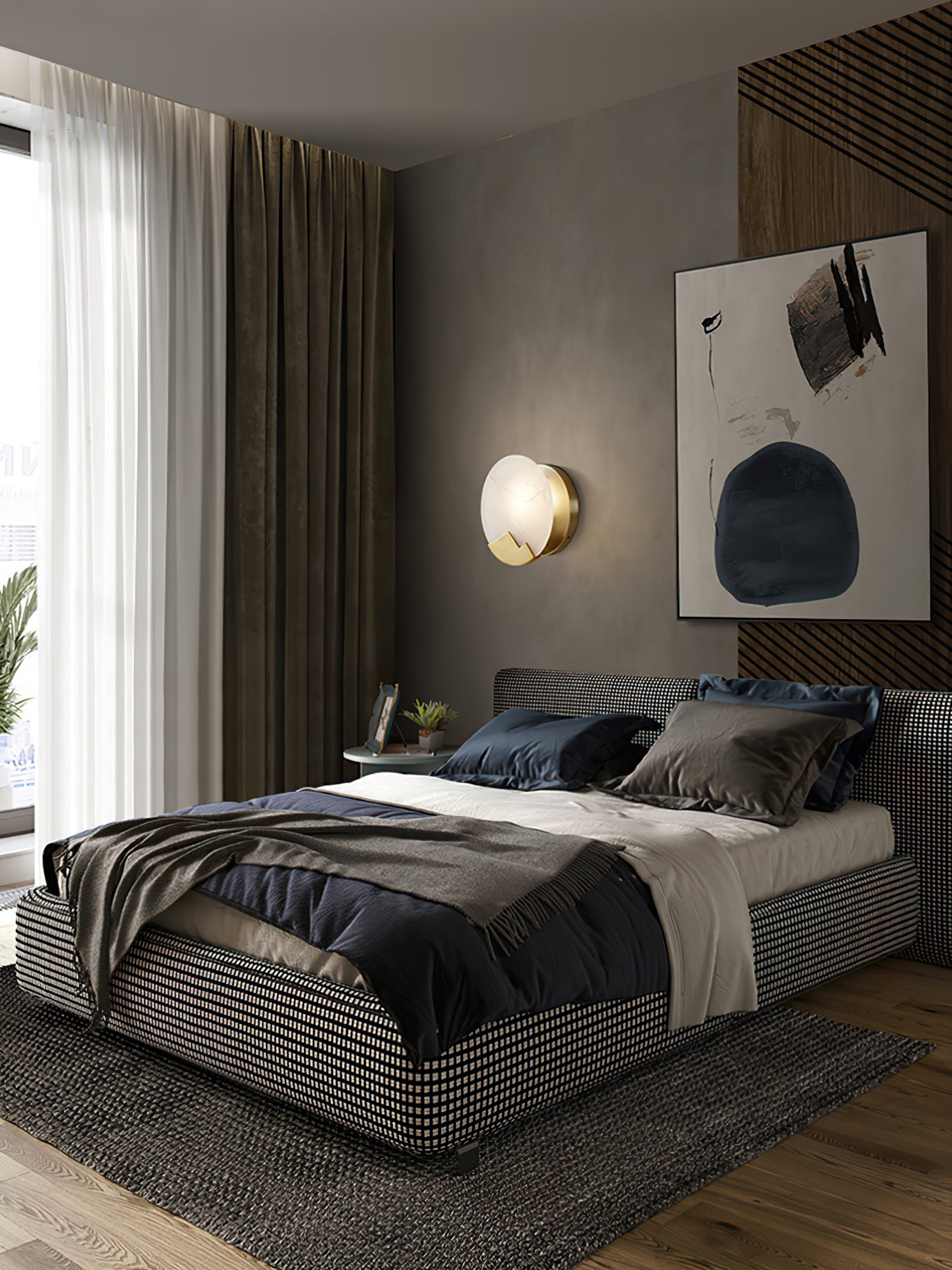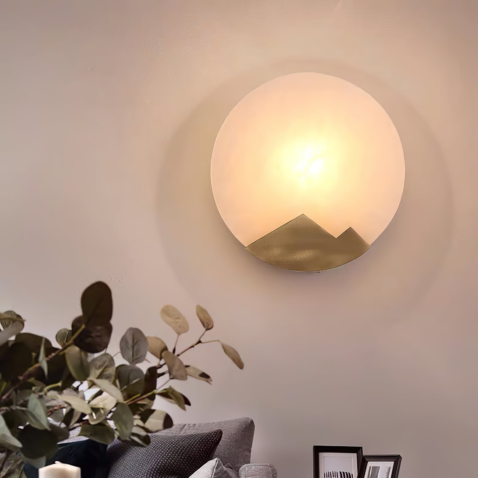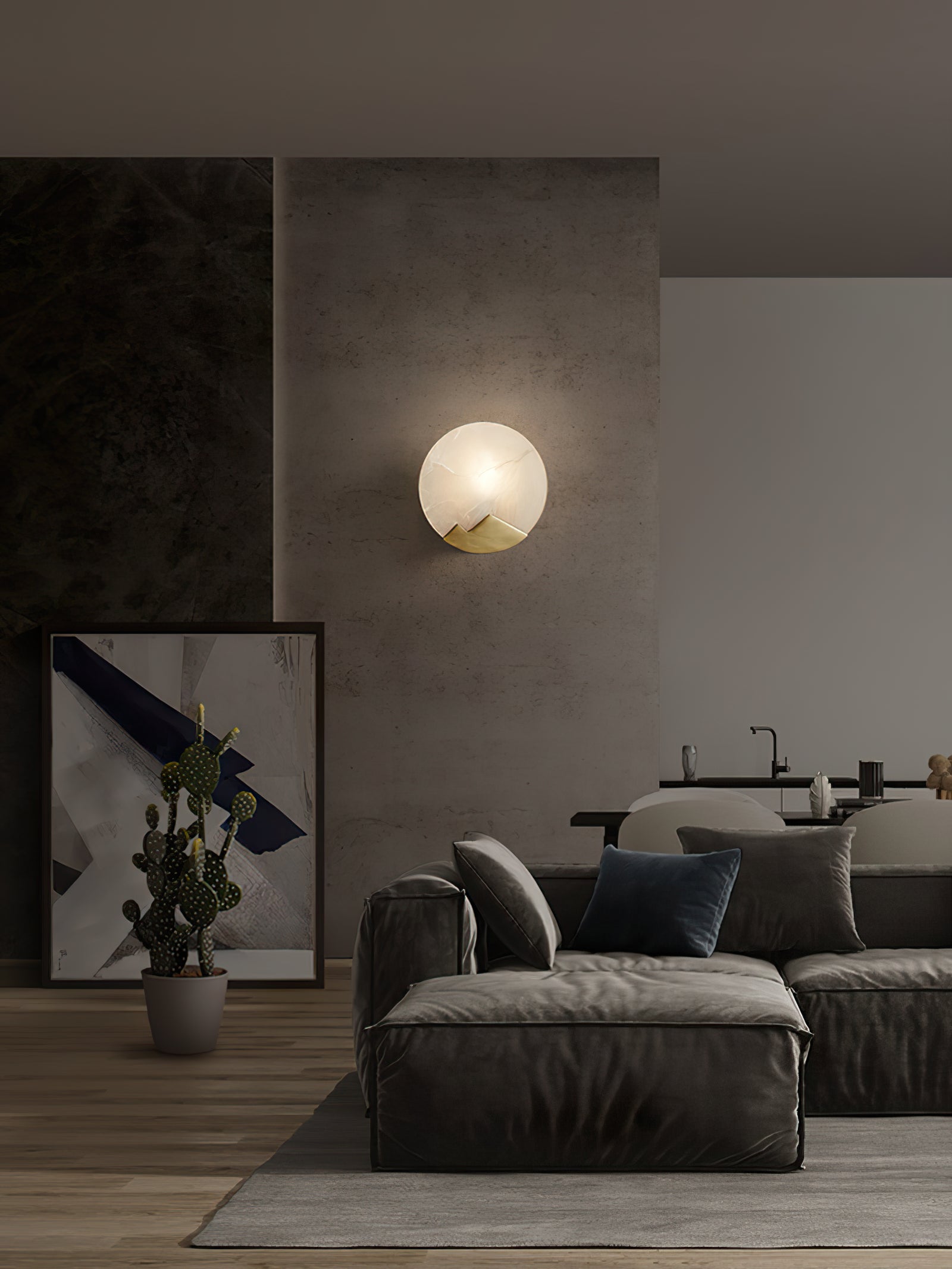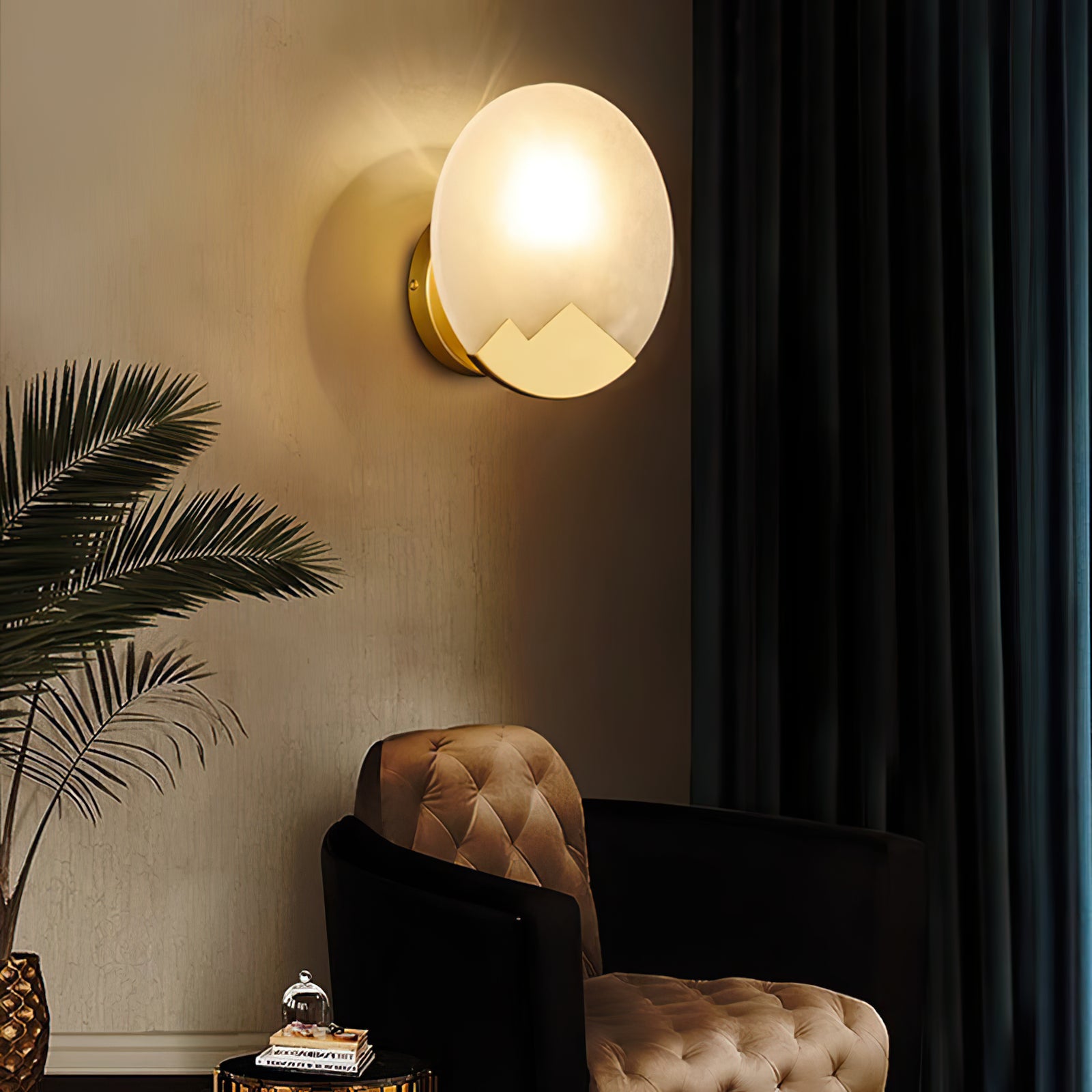 This Brass and Alabaster Round Wall Light features a circular alabaster panel that radiates a warm, diffused glow, highlighting the natural veining and texture of the stone. The design incorporates a unique brass accent at the bottom, shaped like abstract mountain peaks, adding an artistic and elegant touch to the fixture. The combination of the soft, organic patterns in the alabaster and the geometric brass element creates a visually intriguing contrast. Ideal for contemporary and minimalist interiors, this wall light serves as both a functional lighting piece and a decorative art object, bringing warmth and sophistication to any space.