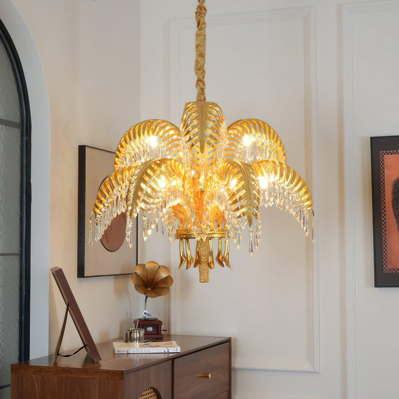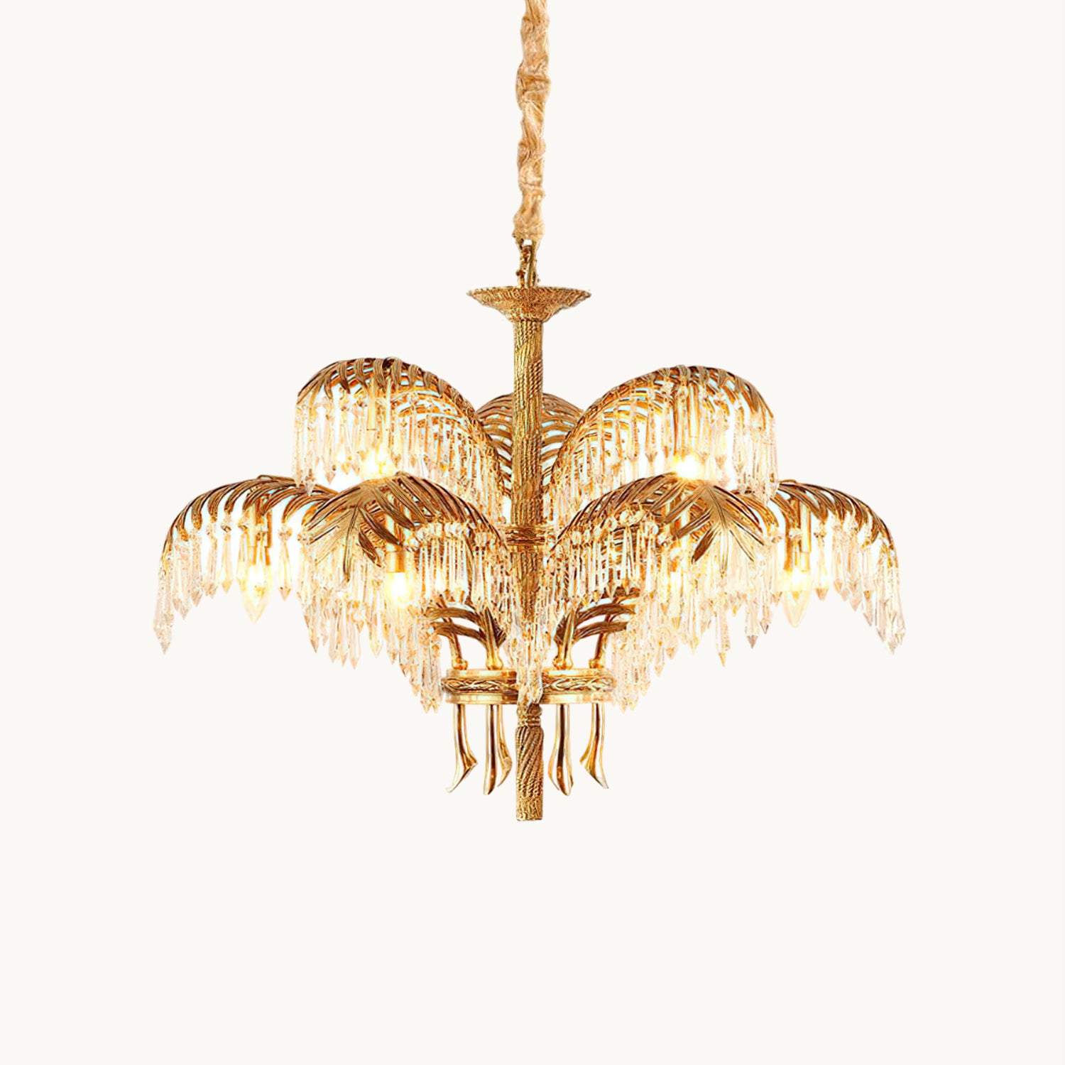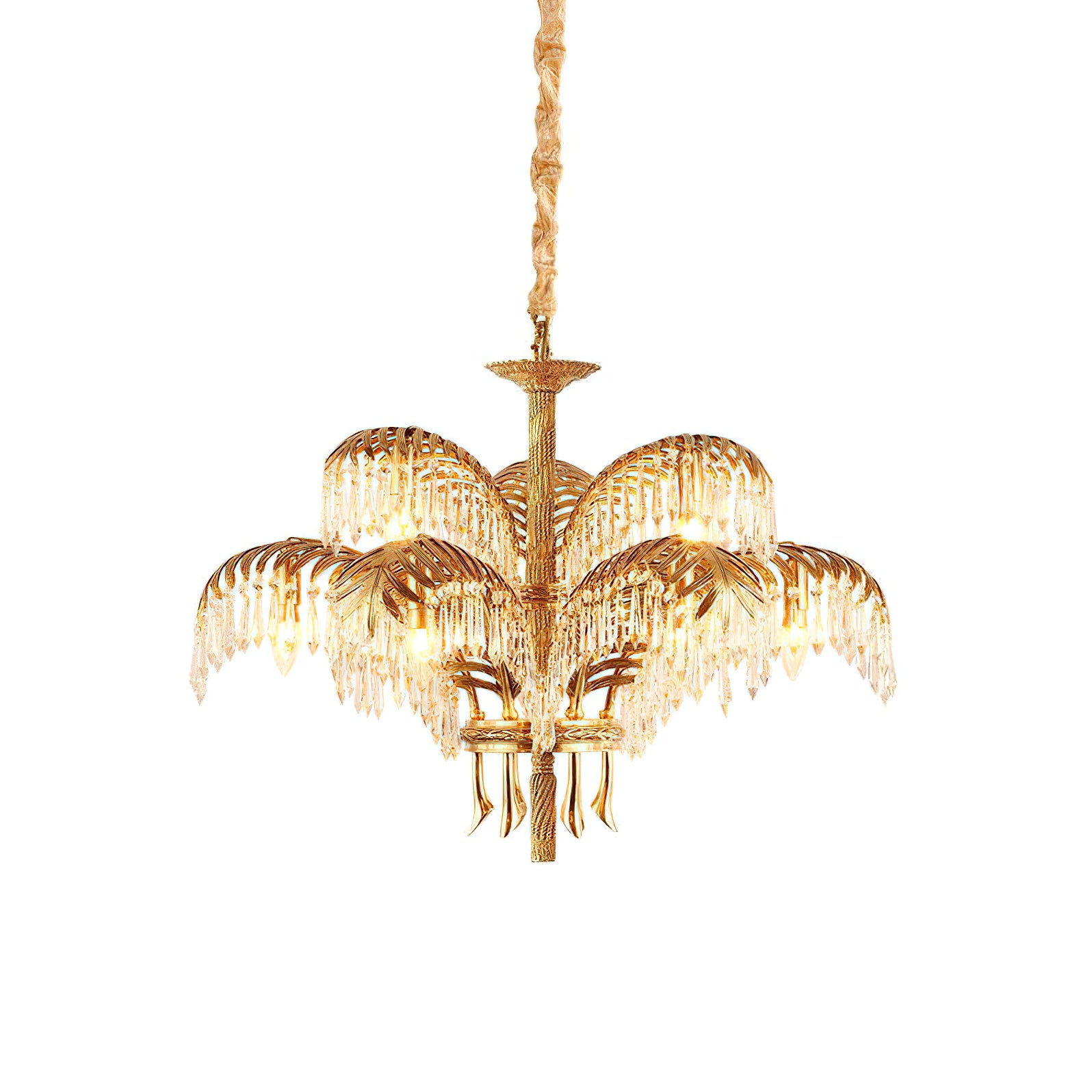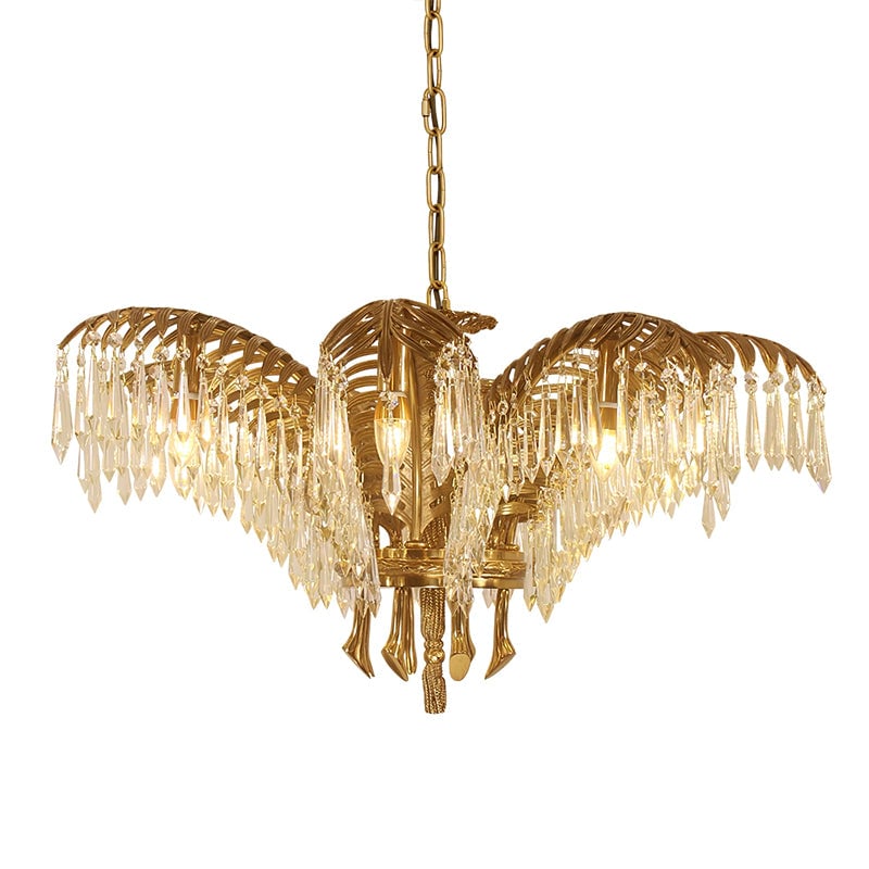 Brass Palm Leaf Crystal Chandelier