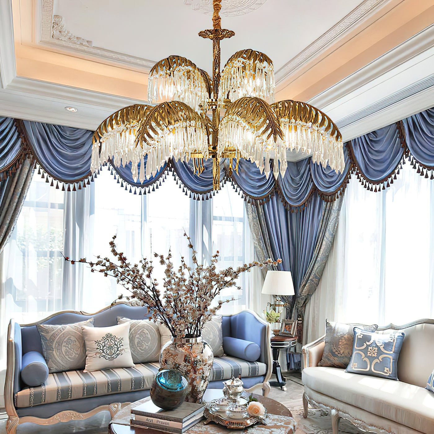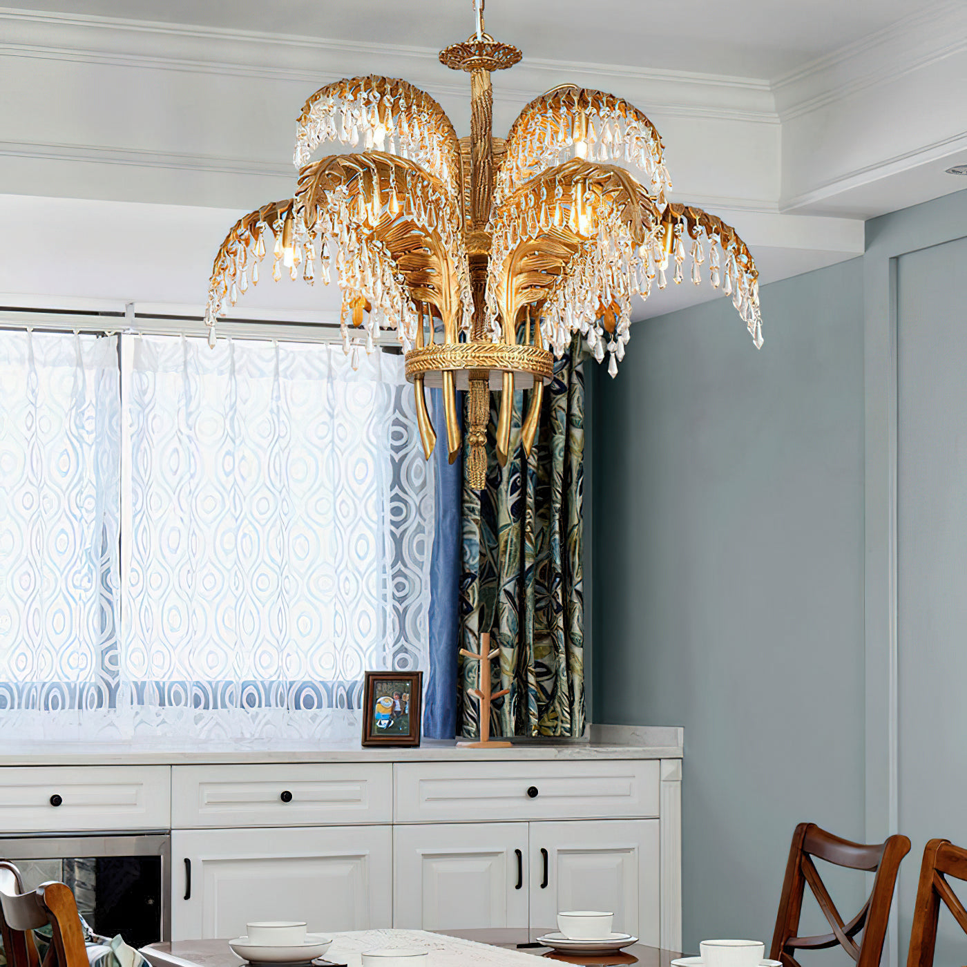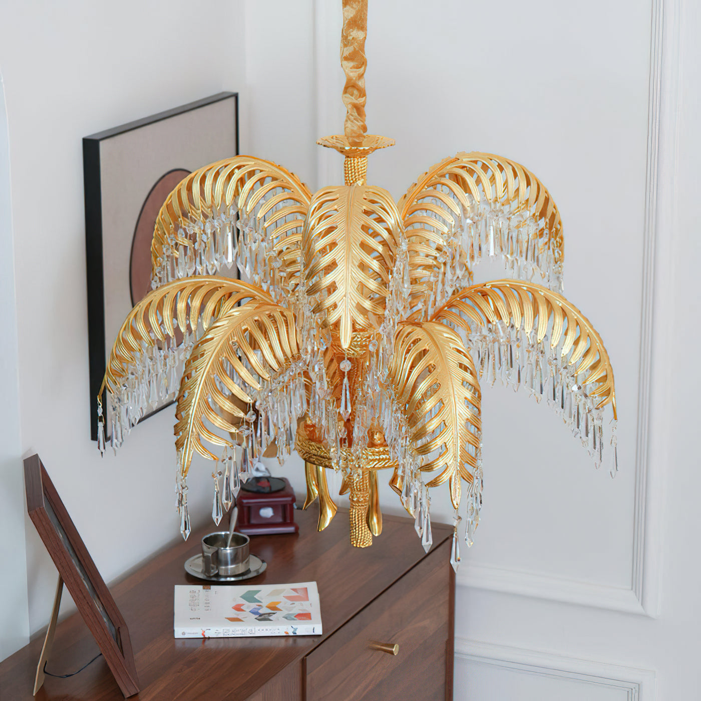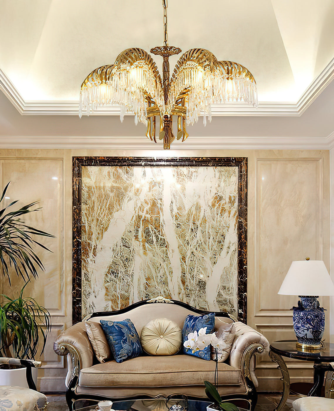 Brass Palm Leaf Crystal Chandelier