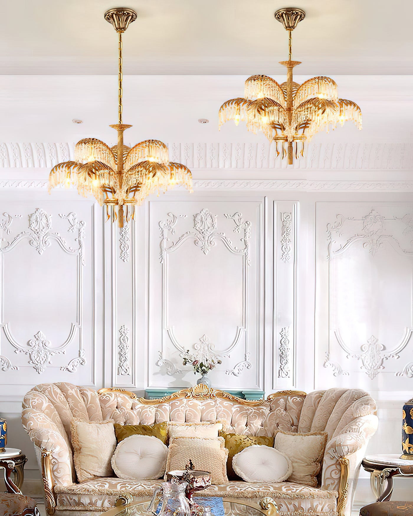 Indulge in the luxury of our Brass Palm Leaf Crystal Chandelier. Skillfully handcrafted with Italianate influences, each delicate brass leaf exudes exquisite craftsmanship. The warm brass finish exudes elegance while maintaining an airy feel. Elevate any space with this stunning chandelier and bask in luxury.