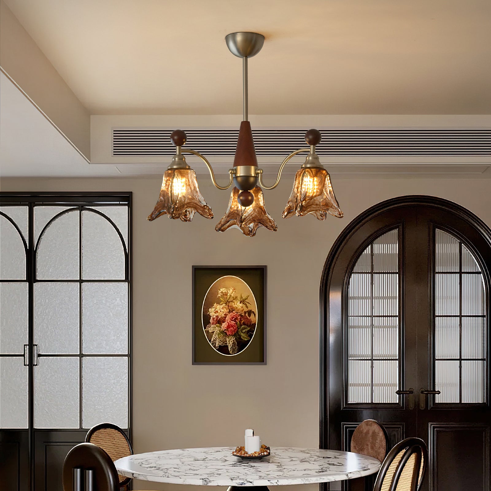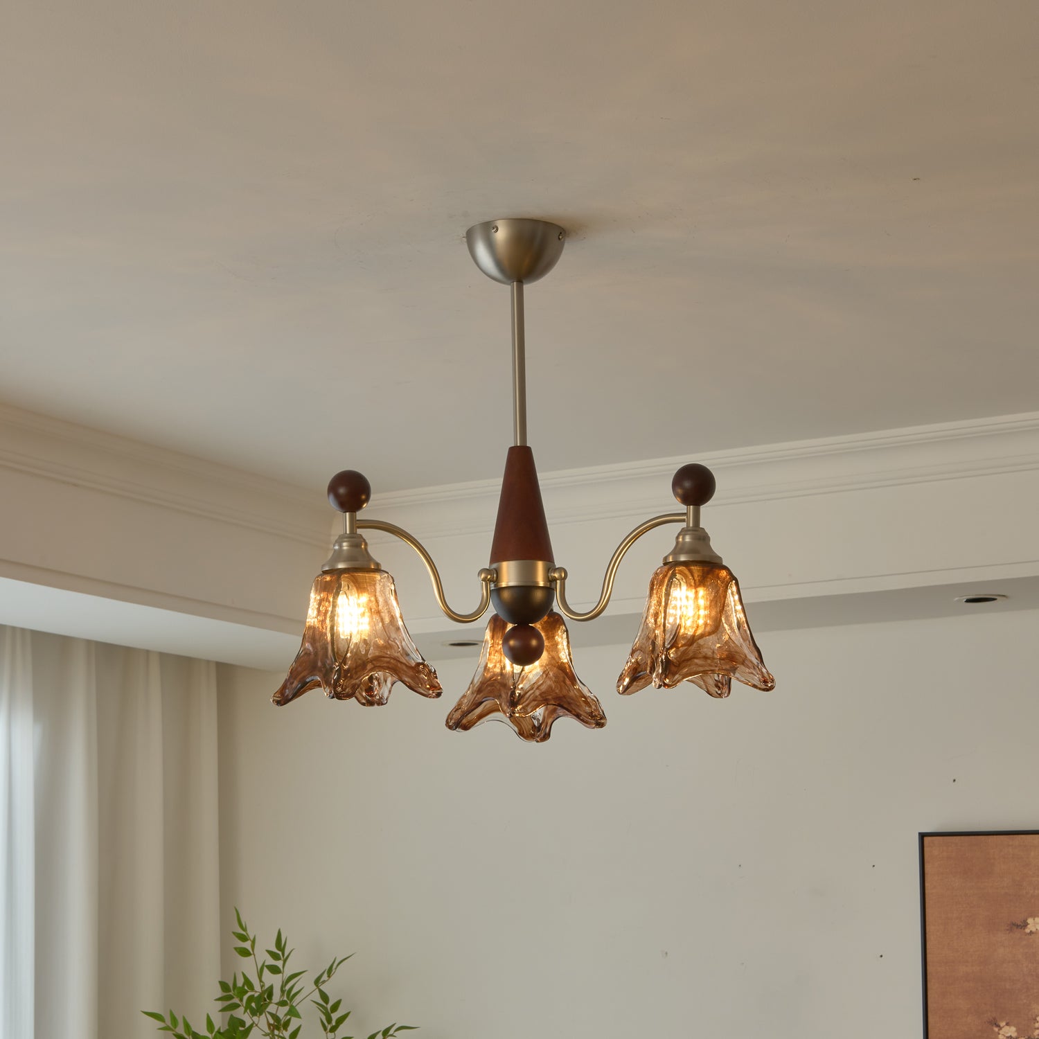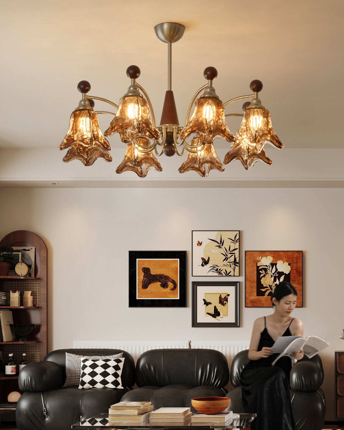 The Bravino Chandelier by Mooijane captures organic beauty through its soft, flowing lines and balanced mix of metal, glass, and wood. The matte-finished metal frame exudes modern refinement, while hand-blown amber glass shades bloom like delicate flowers, casting a warm, inviting glow. A central wooden accent adds natural depth, enhancing the design’s graceful harmony.
