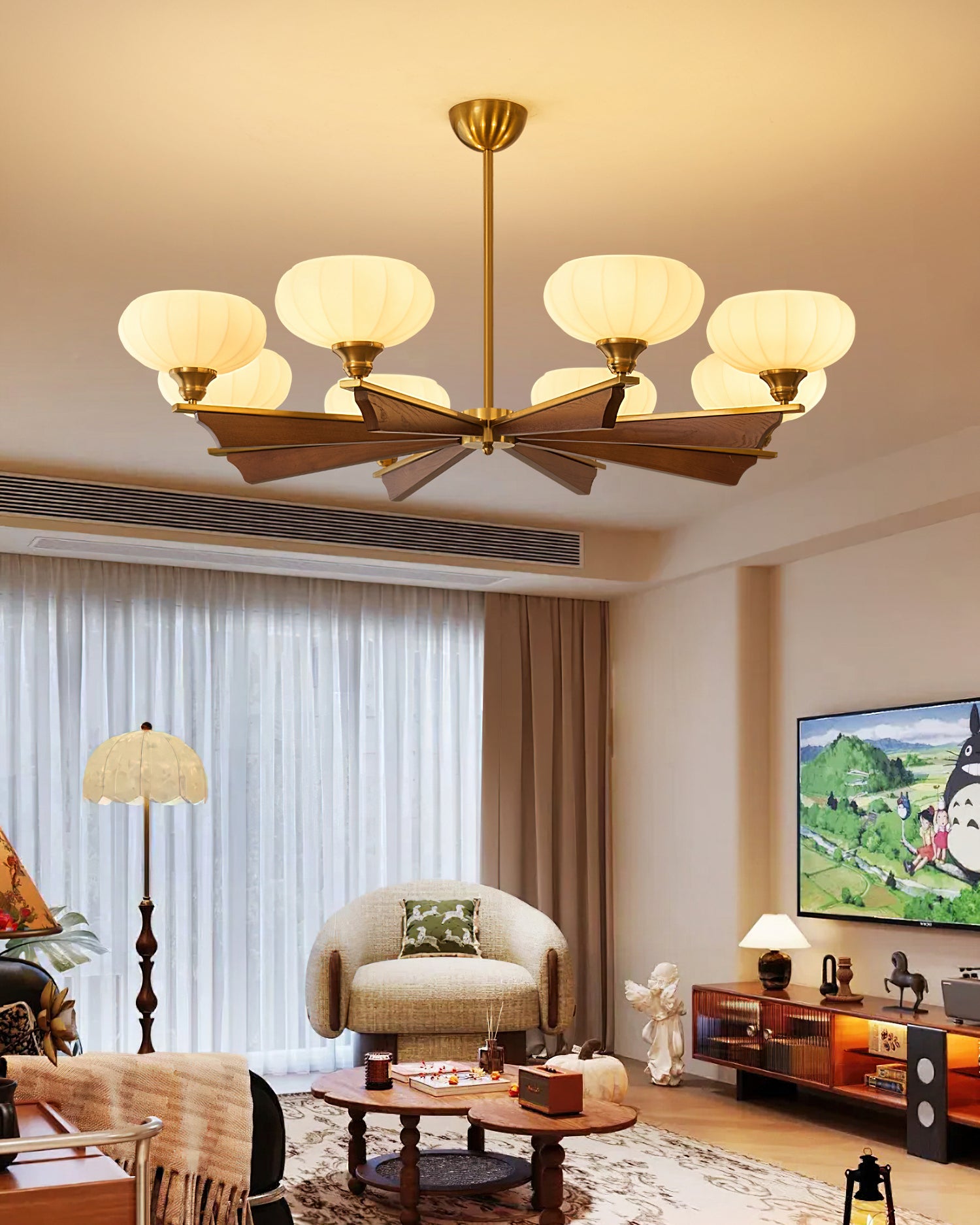 The Brillora Chandelier by Mooijane blends modern elegance with natural warmth through its refined mix of wood, metal, and frosted glass shades. Designed to create a soft, inviting glow, it serves as a sophisticated centerpiece for dining rooms, living areas, or bedrooms. Combining timeless style with practical illumination, this chandelier enhances any interior with effortless charm and contemporary grace.