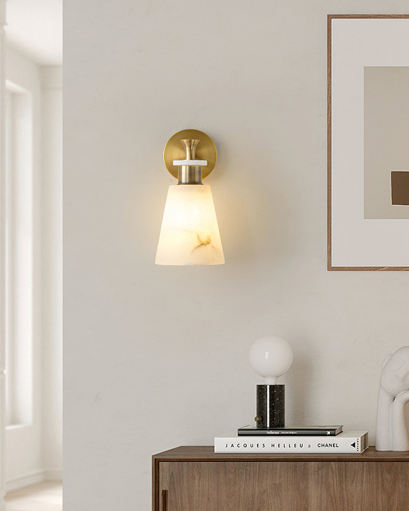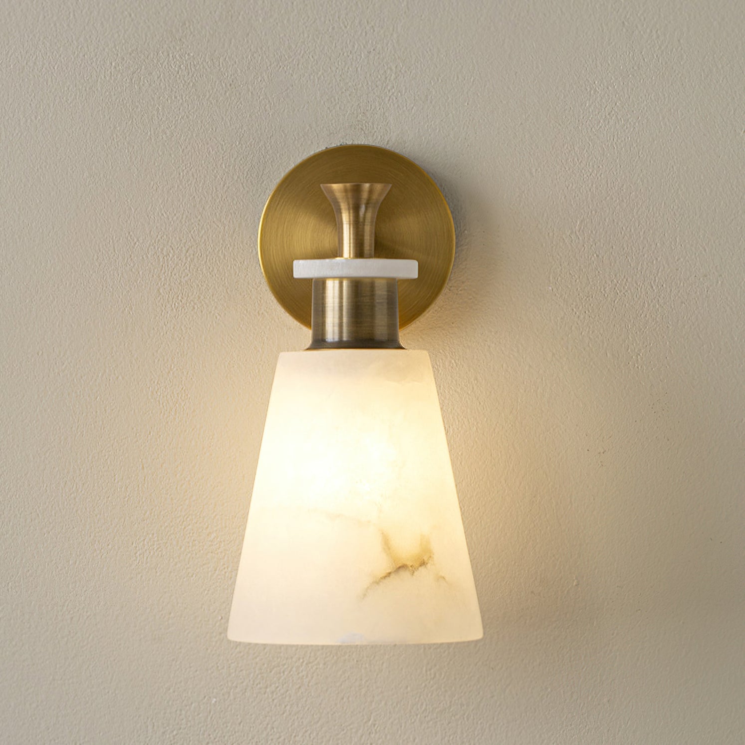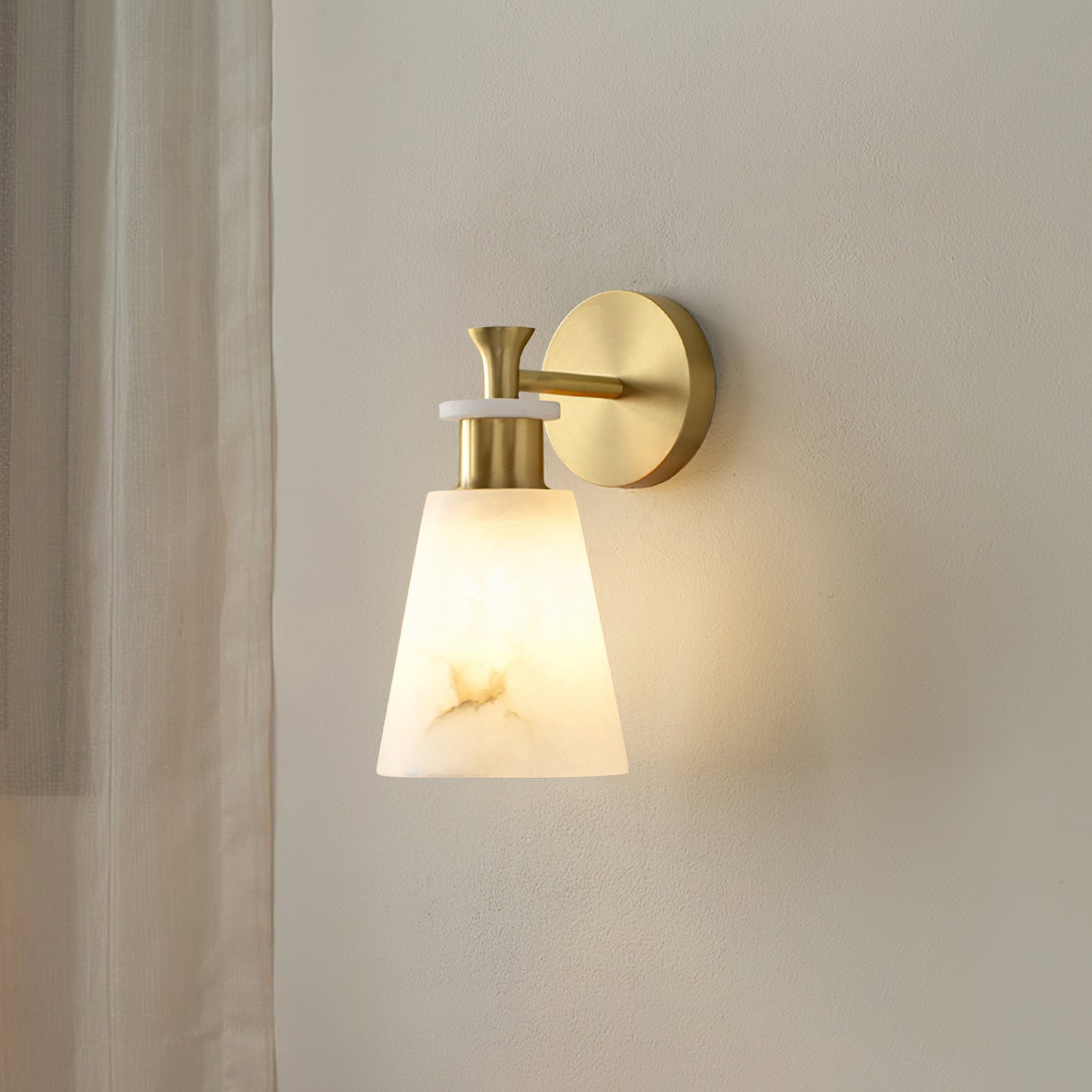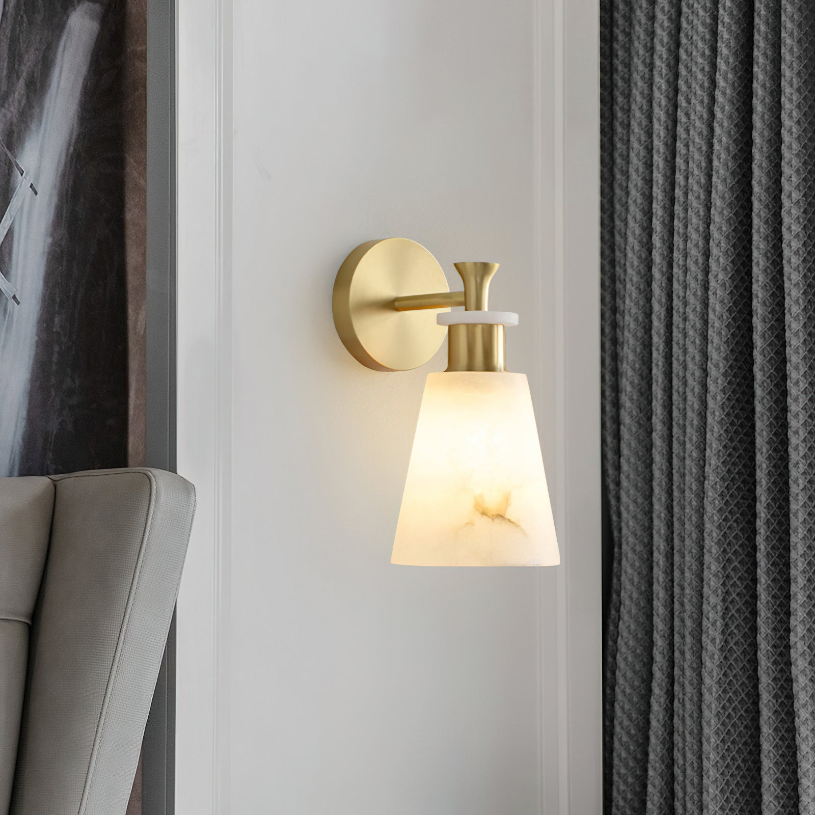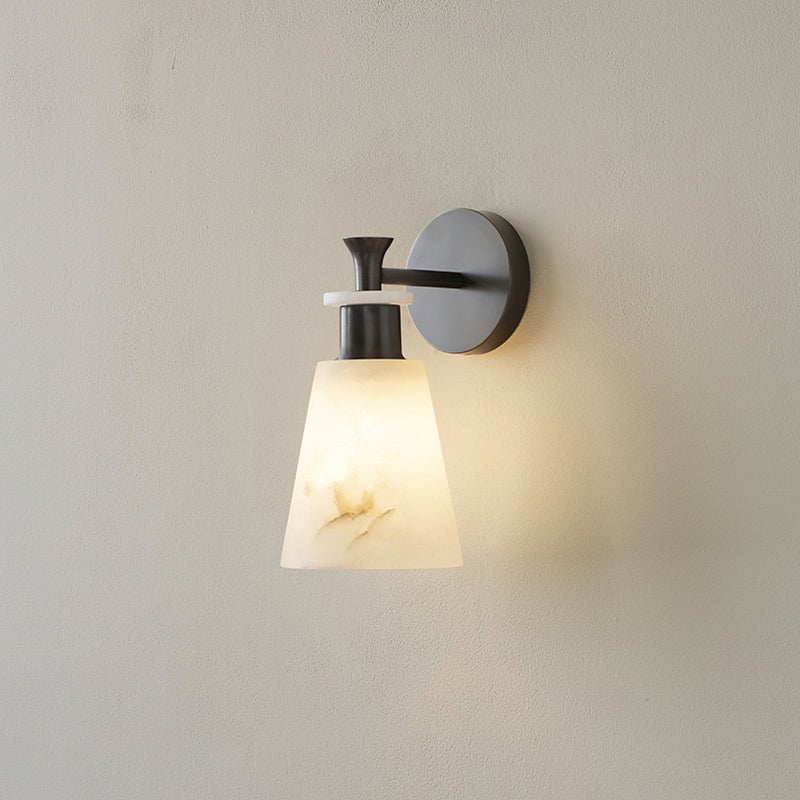 The Brimor Wall Light from Mooijane features a refined blend of snow alabaster and brass for an elegant, timeless aesthetic. Its tapered alabaster shade softly diffuses light, creating a warm, inviting ambiance. Ideal for living rooms, bedrooms, or hallways, this sophisticated sconce adds a touch of modern luxury to any interior.