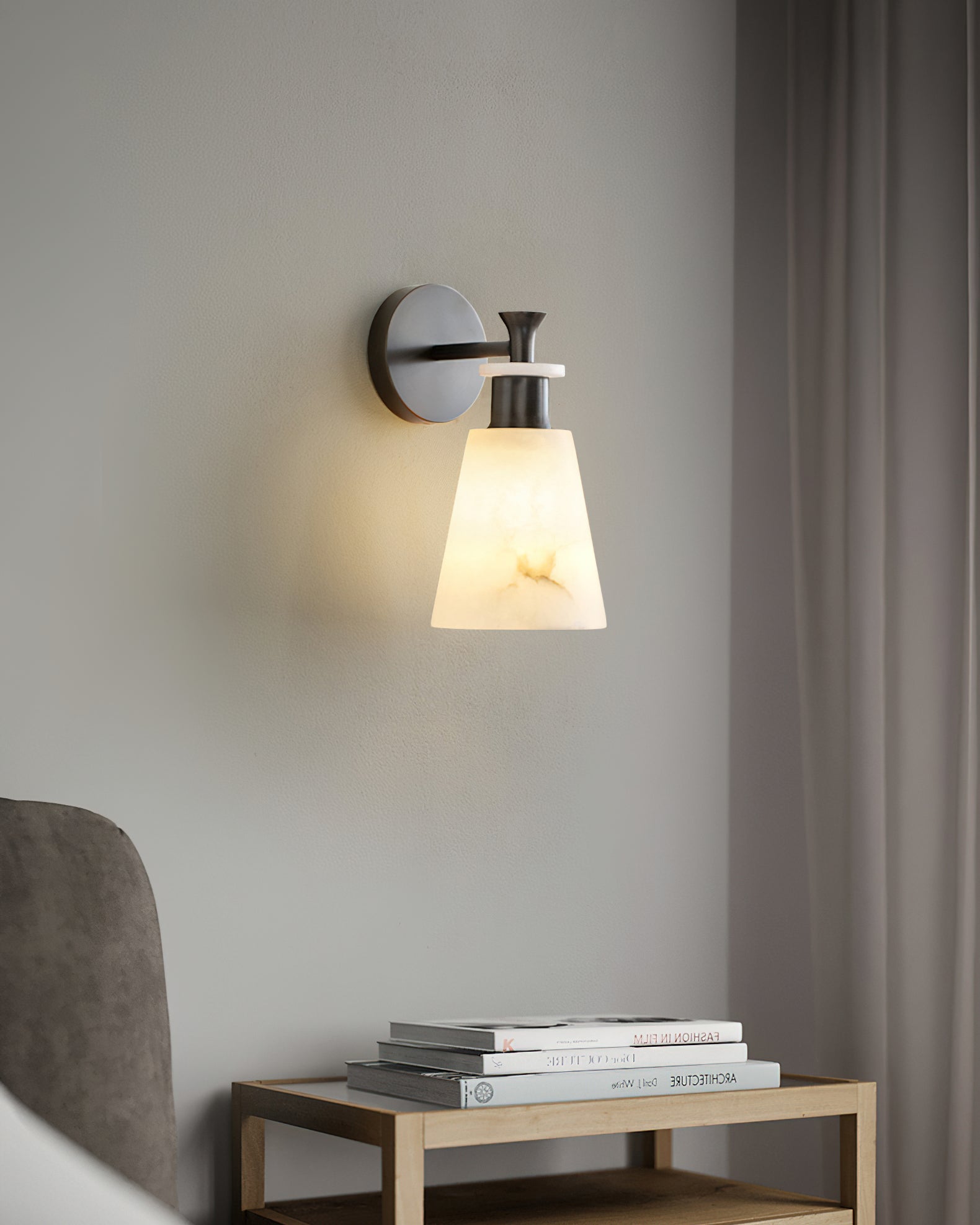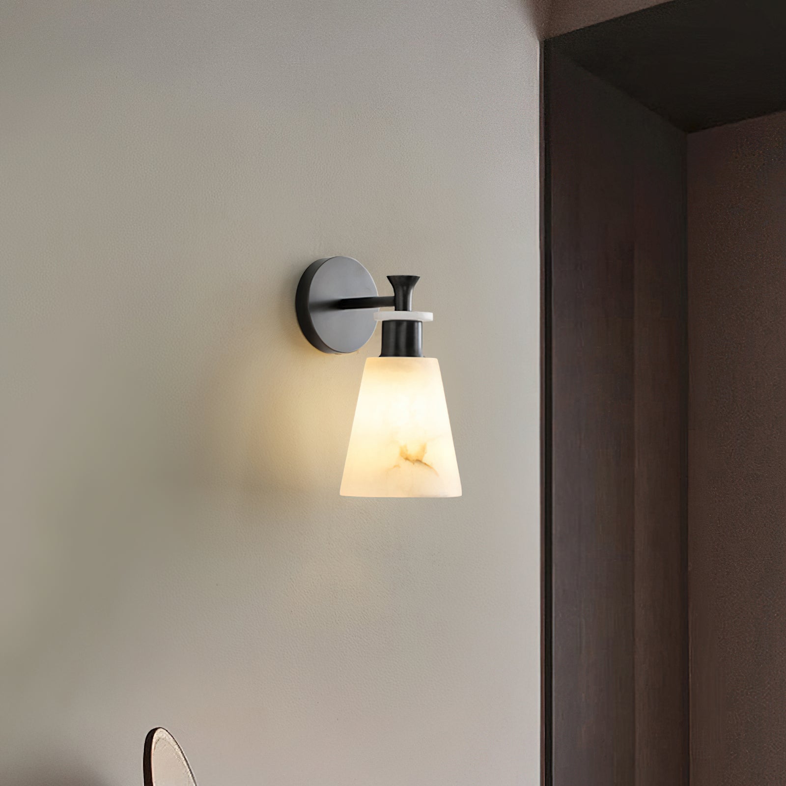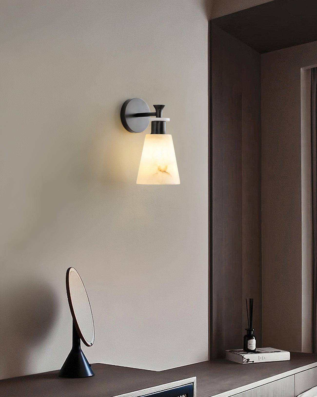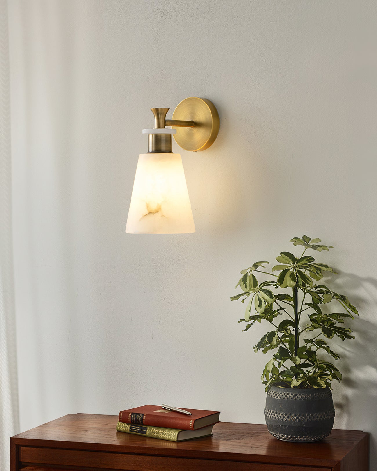 The Brimor Wall Light from Mooijane features a refined blend of snow alabaster and brass for an elegant, timeless aesthetic. Its tapered alabaster shade softly diffuses light, creating a warm, inviting ambiance. Ideal for living rooms, bedrooms, or hallways, this sophisticated sconce adds a touch of modern luxury to any interior.