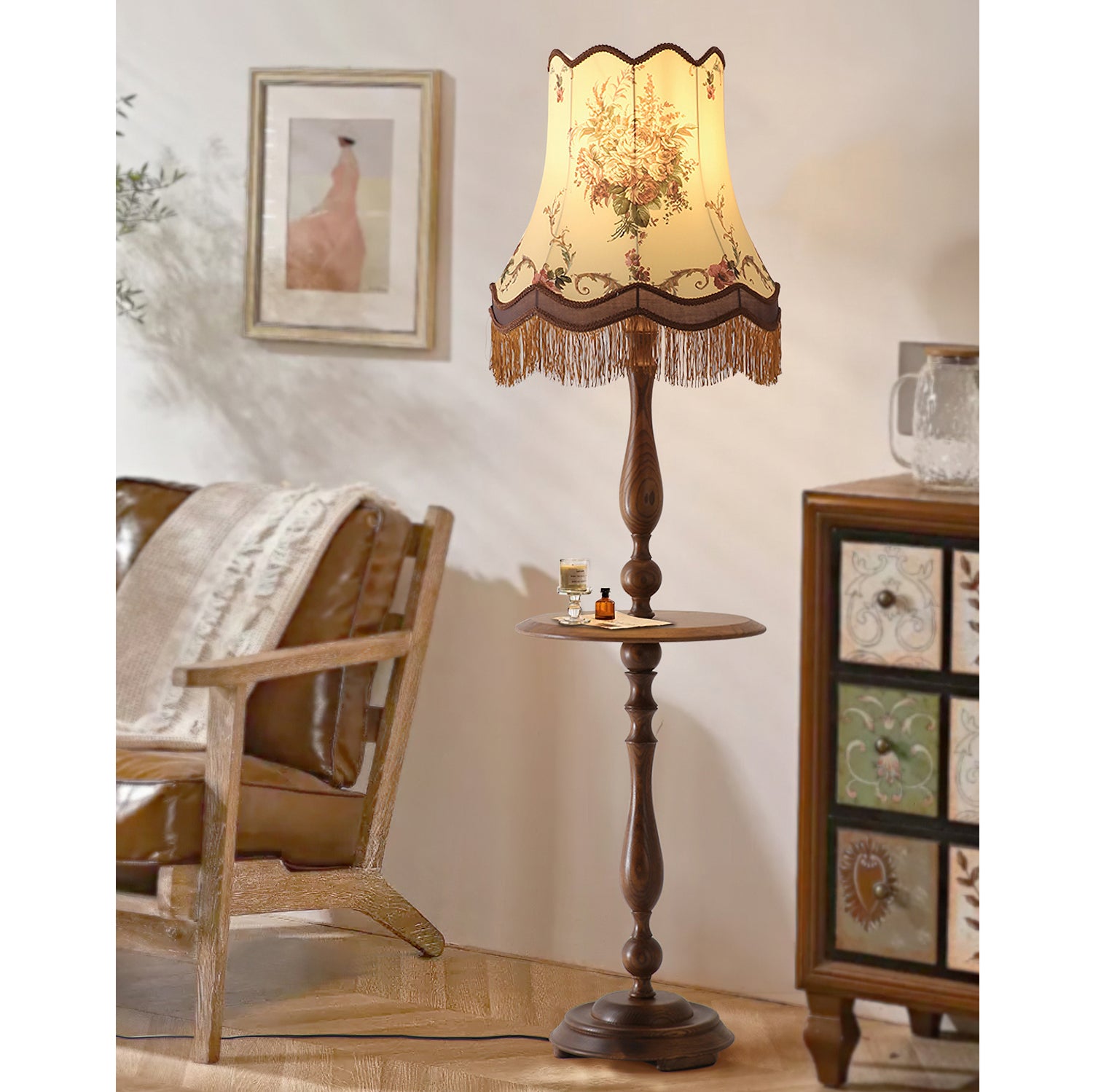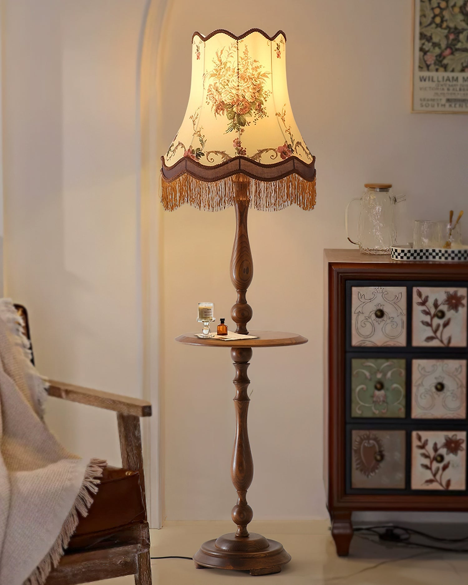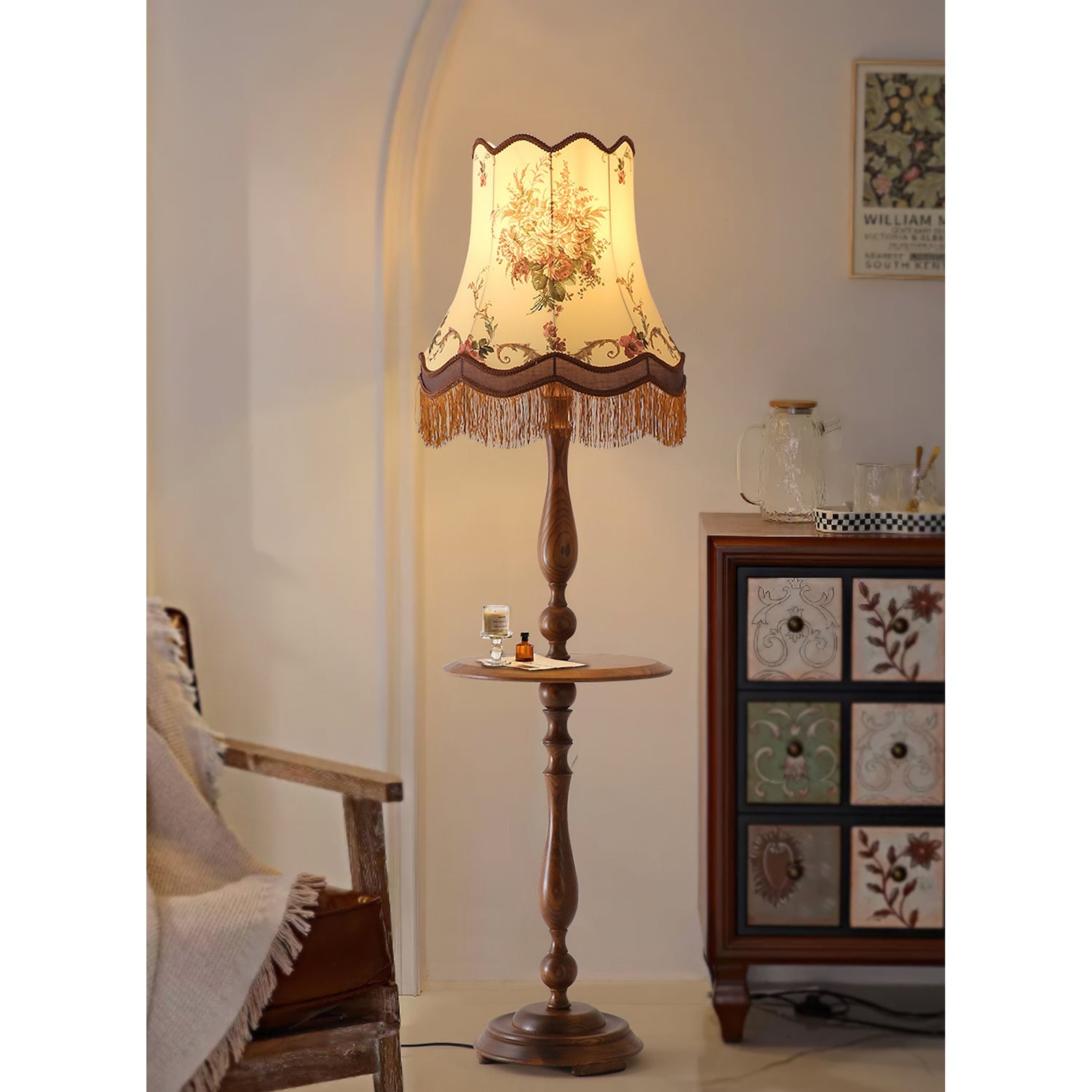 Mooijane’s Briony Tassel Floor Lamp blends vintage elegance with practical charm. Featuring a sculptural solid wood base that doubles as a compact coffee table, it offers both stability and function. The embroidered fabric shade, finished with delicate tassels, evokes classic European allure. Ideal for living rooms, studies, or vintage-inspired spaces, Briony brings warmth, character, and timeless sophistication to any interior.