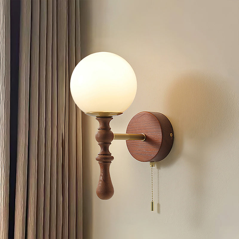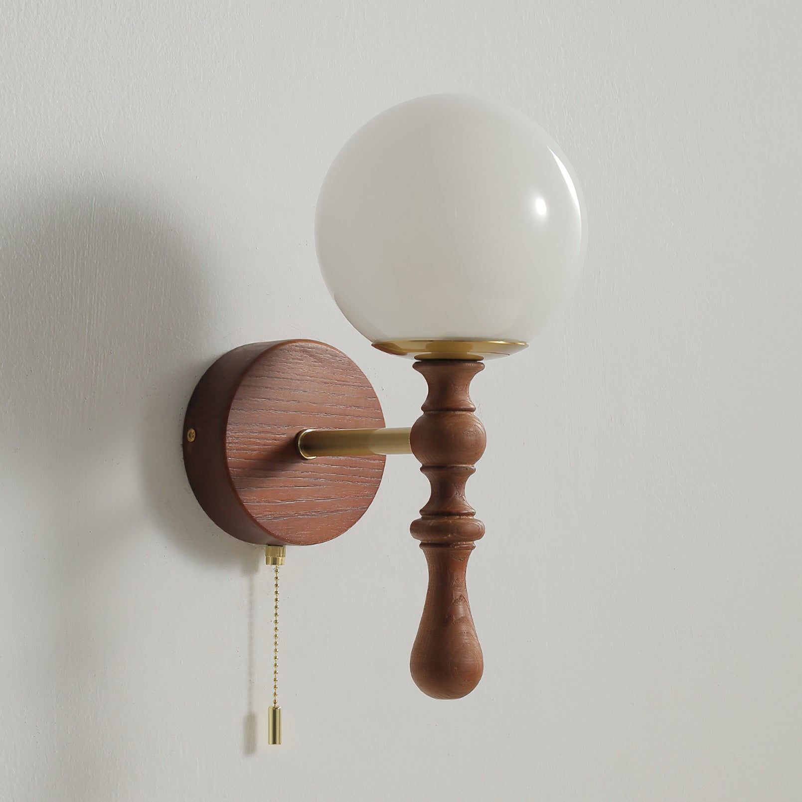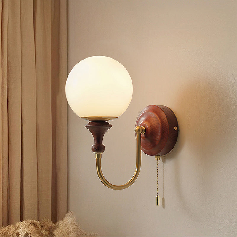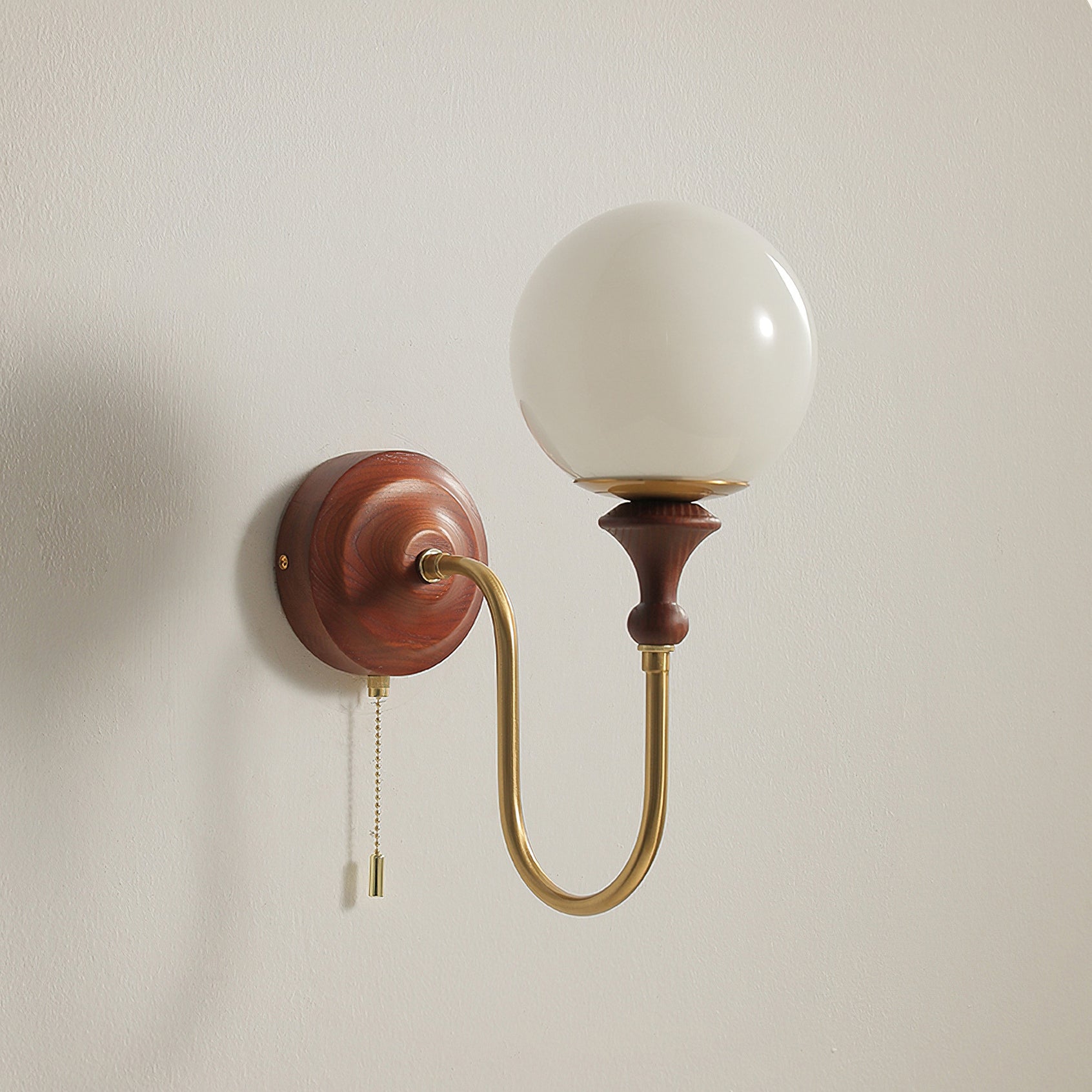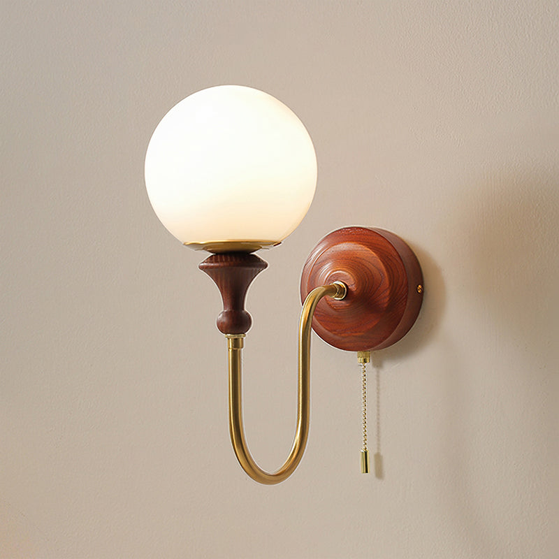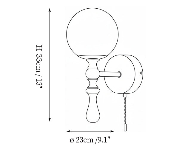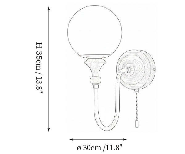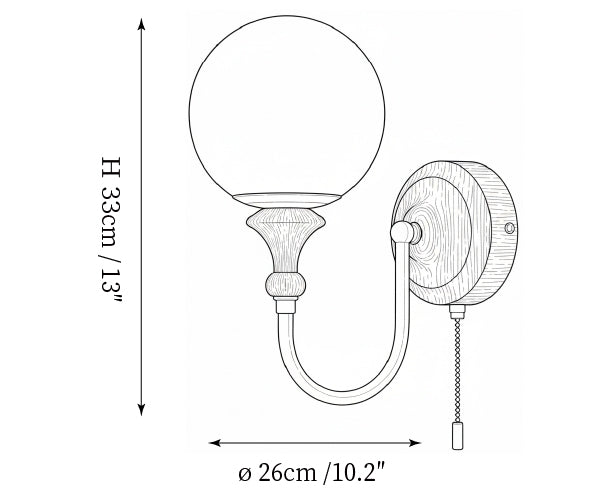 The Brunel Wall Lamp from Mooijane combines a rounded glass shade with the timeless elegance of wood and metal. Suspended from a sleek, curved metal arm, the spherical glass diffuses light softly, creating a warm and inviting ambiance. A wooden base adds natural charm, while the pull-chain switch provides functional, classic style. Perfect for bedrooms, living rooms, or hallways, it blends modern simplicity with enduring craftsmanship.