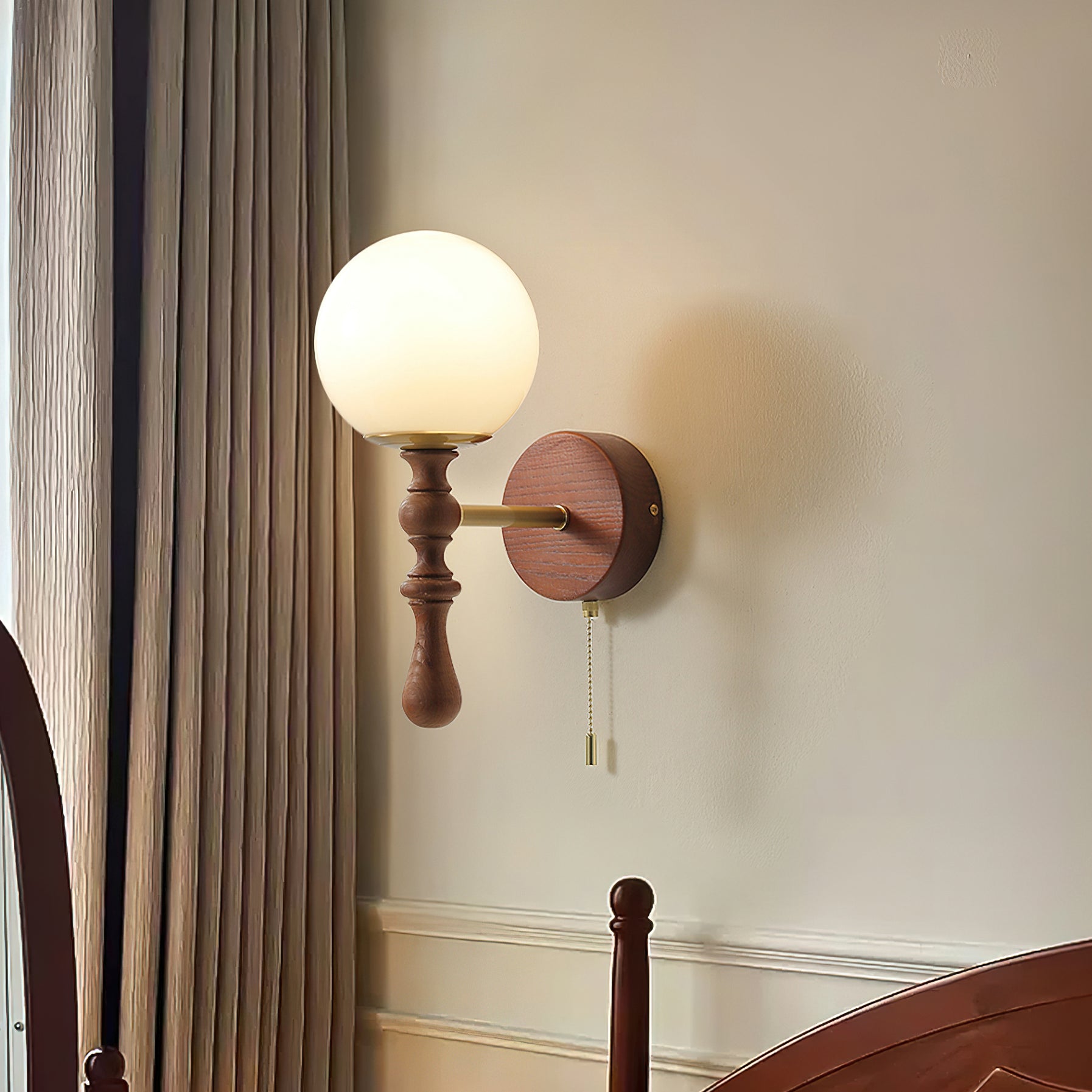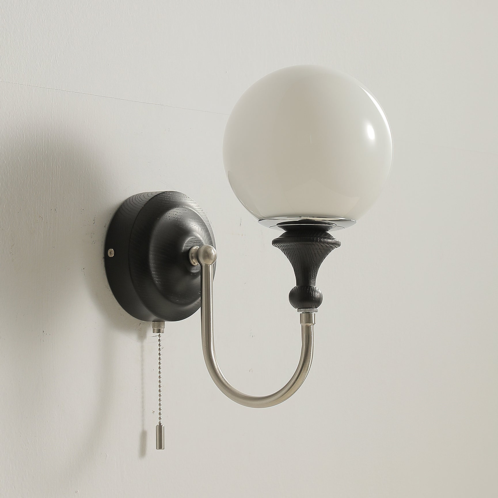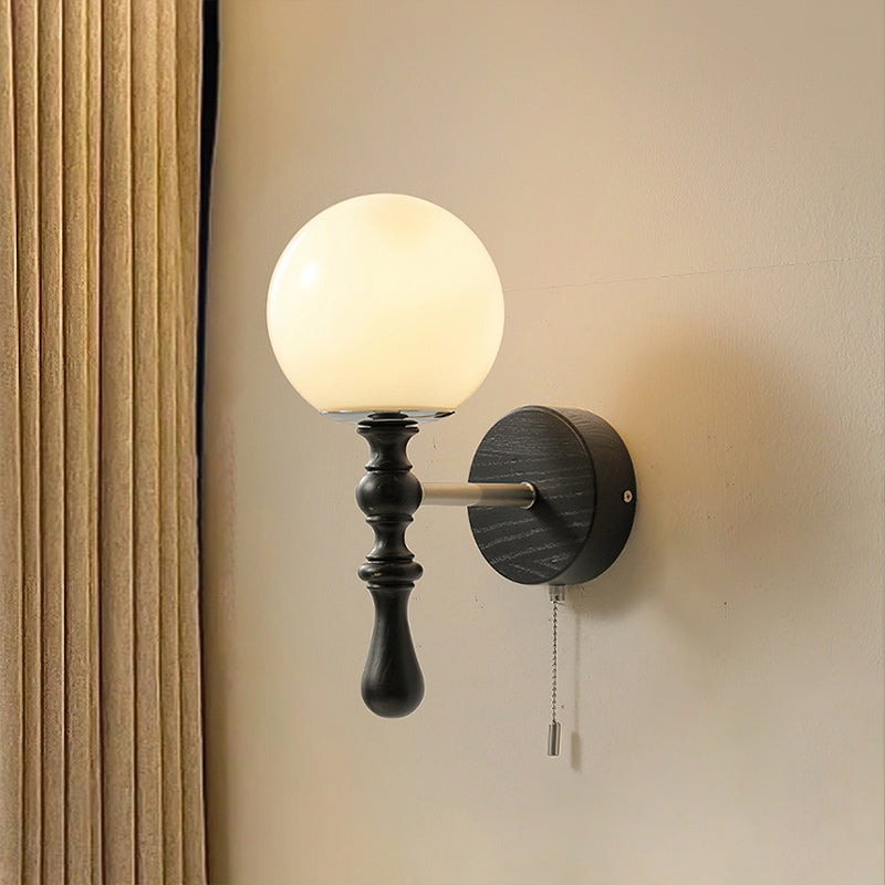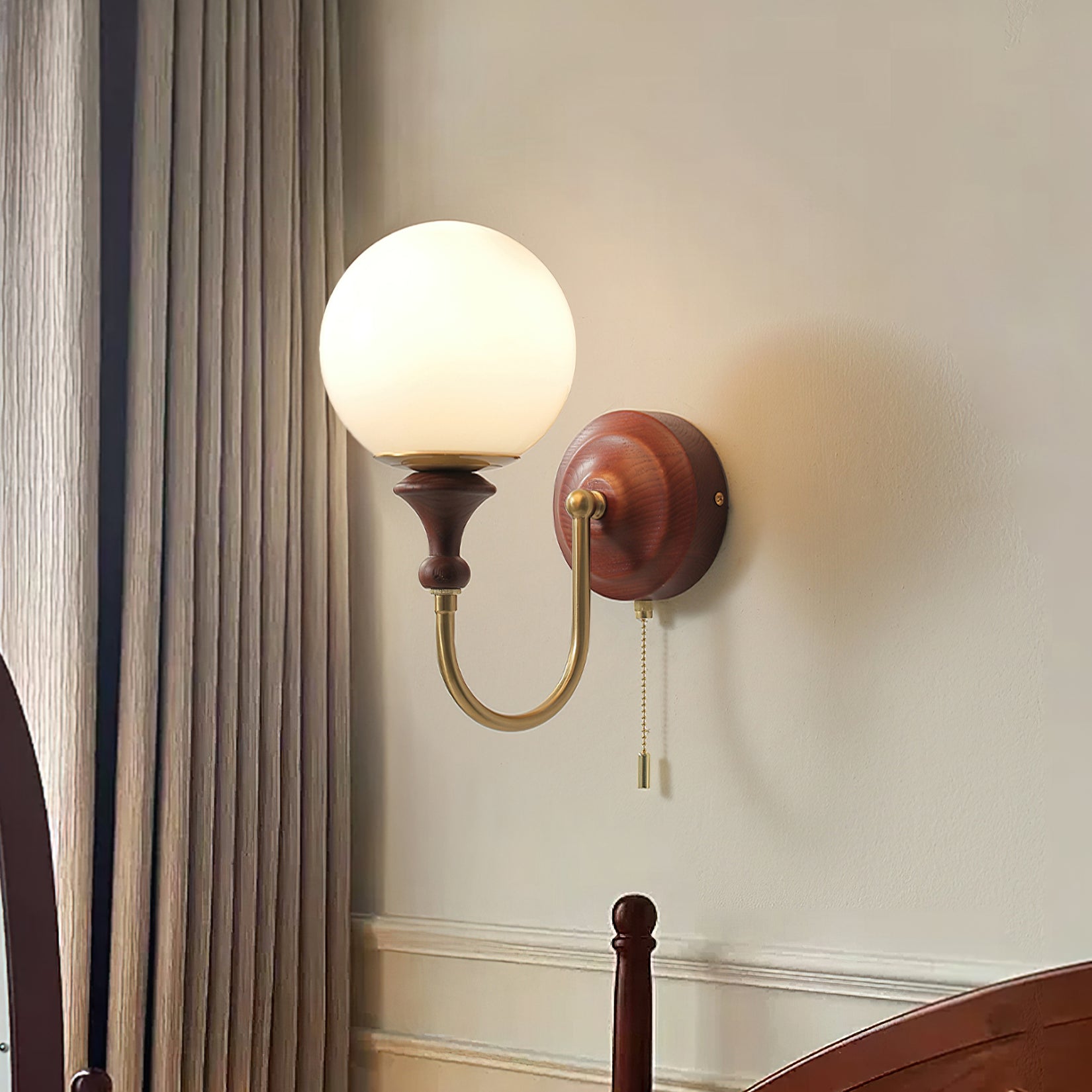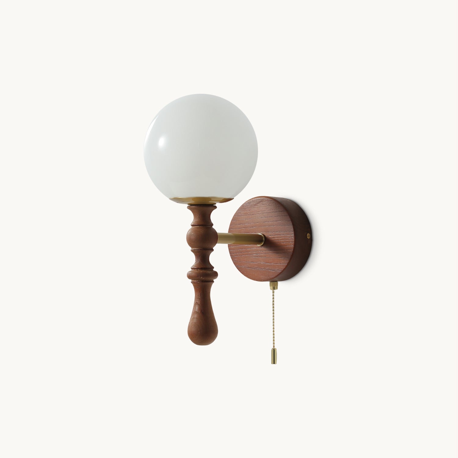 The Brunel Wall Lamp from Mooijane combines a rounded glass shade with the timeless elegance of wood and metal. Suspended from a sleek, curved metal arm, the spherical glass diffuses light softly, creating a warm and inviting ambiance. A wooden base adds natural charm, while the pull-chain switch provides functional, classic style. Perfect for bedrooms, living rooms, or hallways, it blends modern simplicity with enduring craftsmanship.
