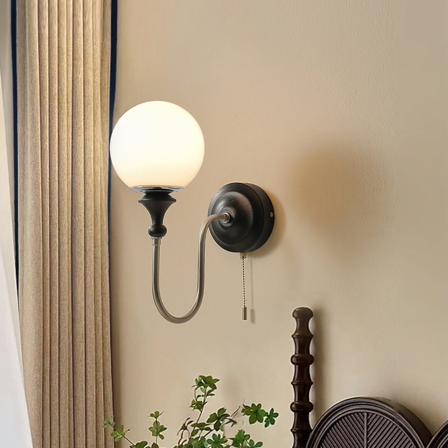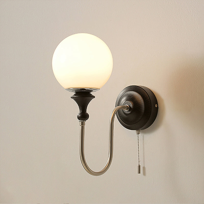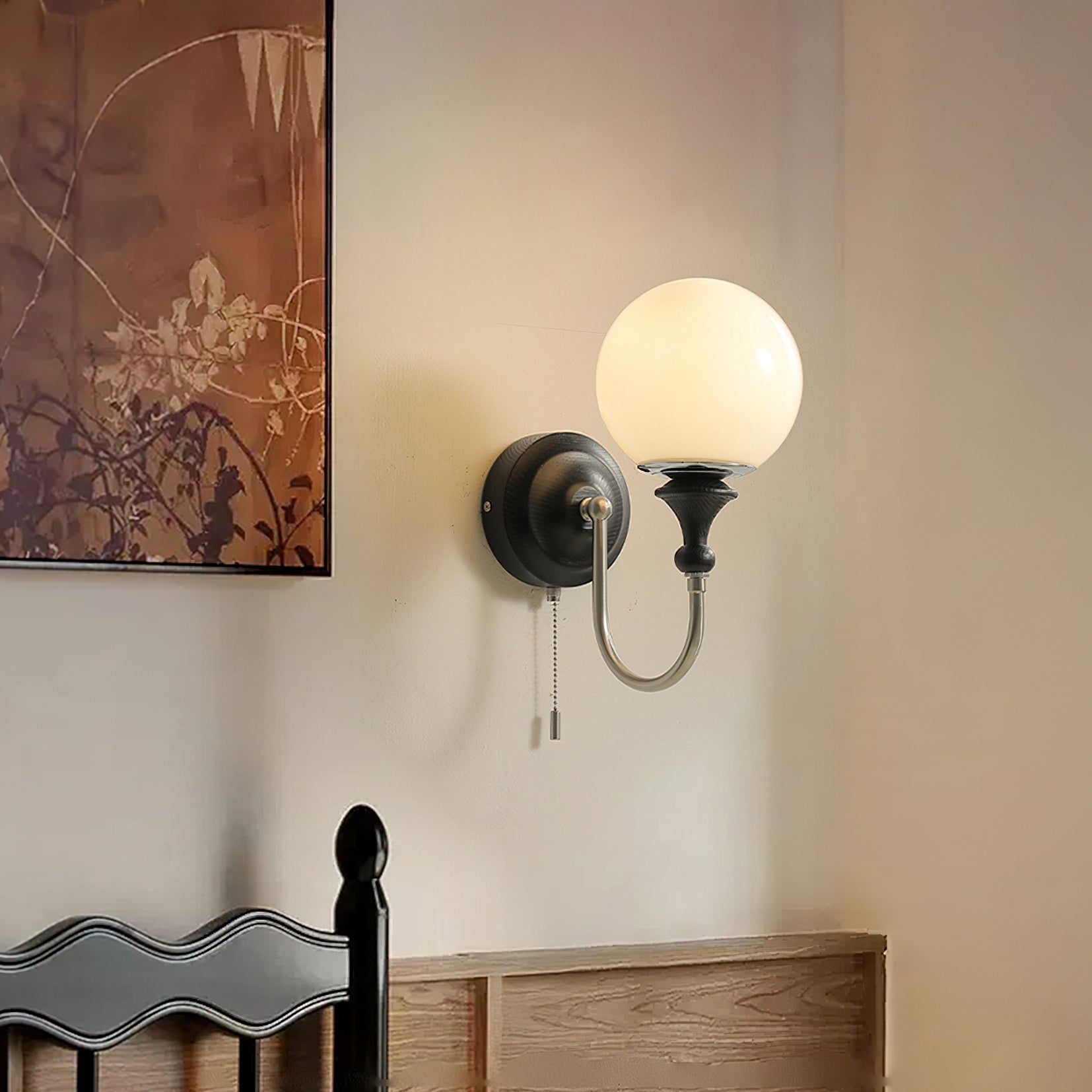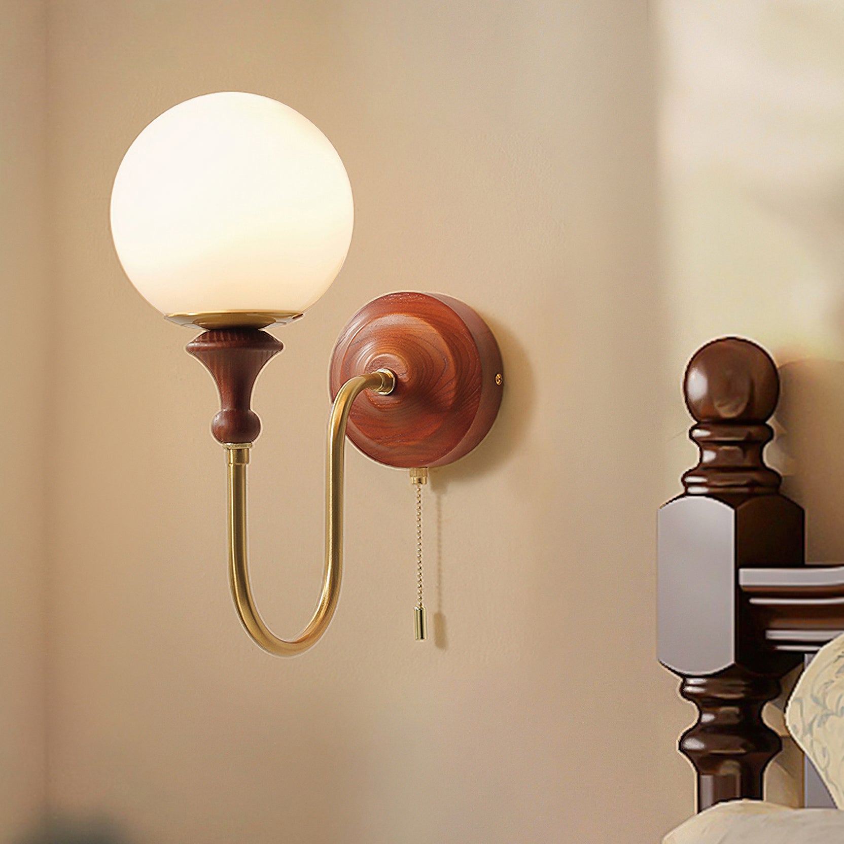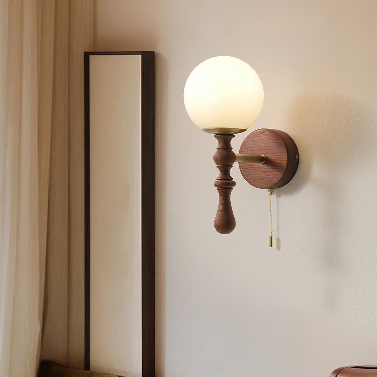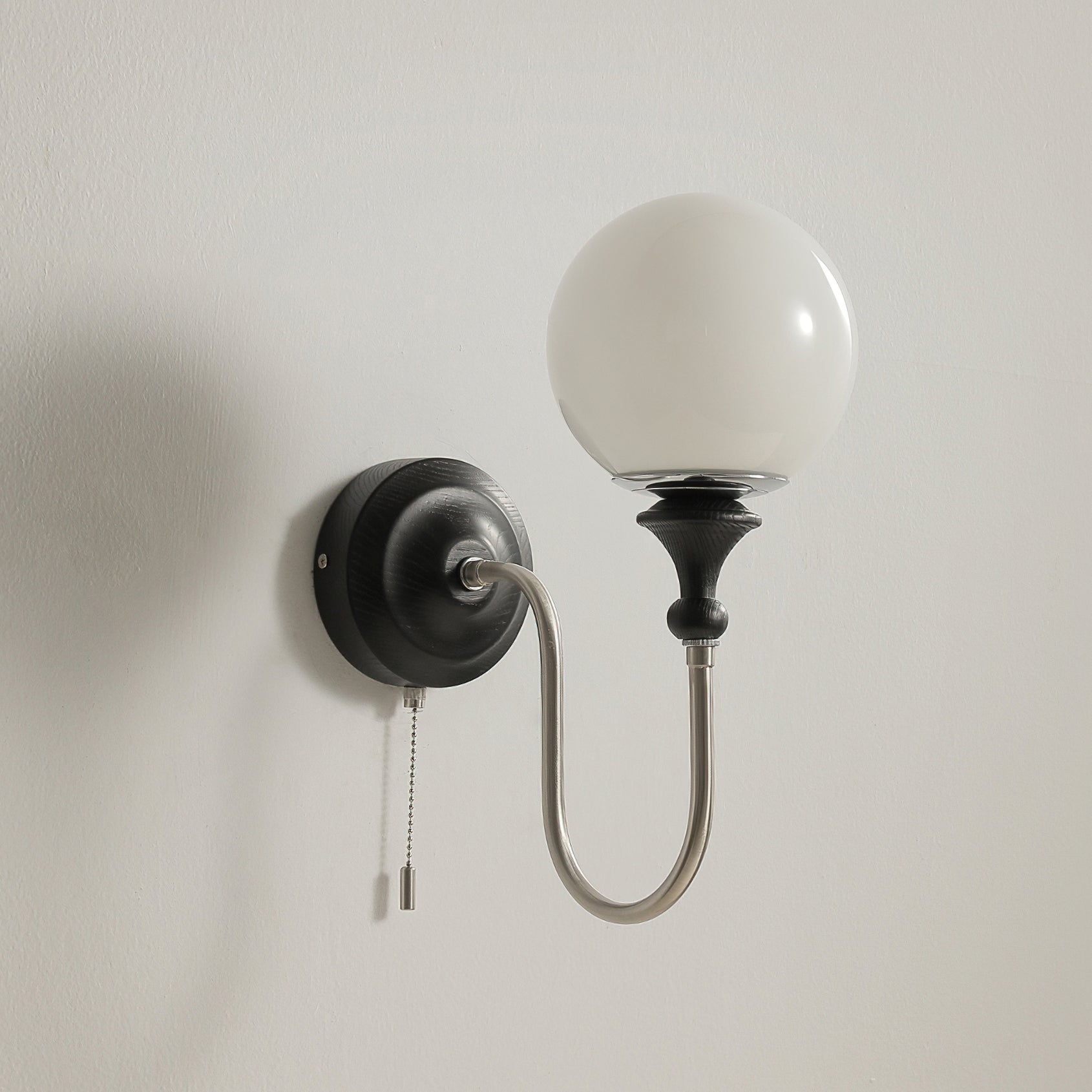 The Brunel Wall Lamp from Mooijane combines a rounded glass shade with the timeless elegance of wood and metal. Suspended from a sleek, curved metal arm, the spherical glass diffuses light softly, creating a warm and inviting ambiance. A wooden base adds natural charm, while the pull-chain switch provides functional, classic style. Perfect for bedrooms, living rooms, or hallways, it blends modern simplicity with enduring craftsmanship.