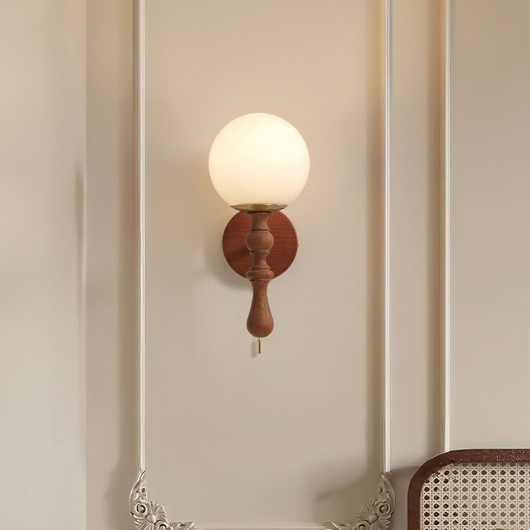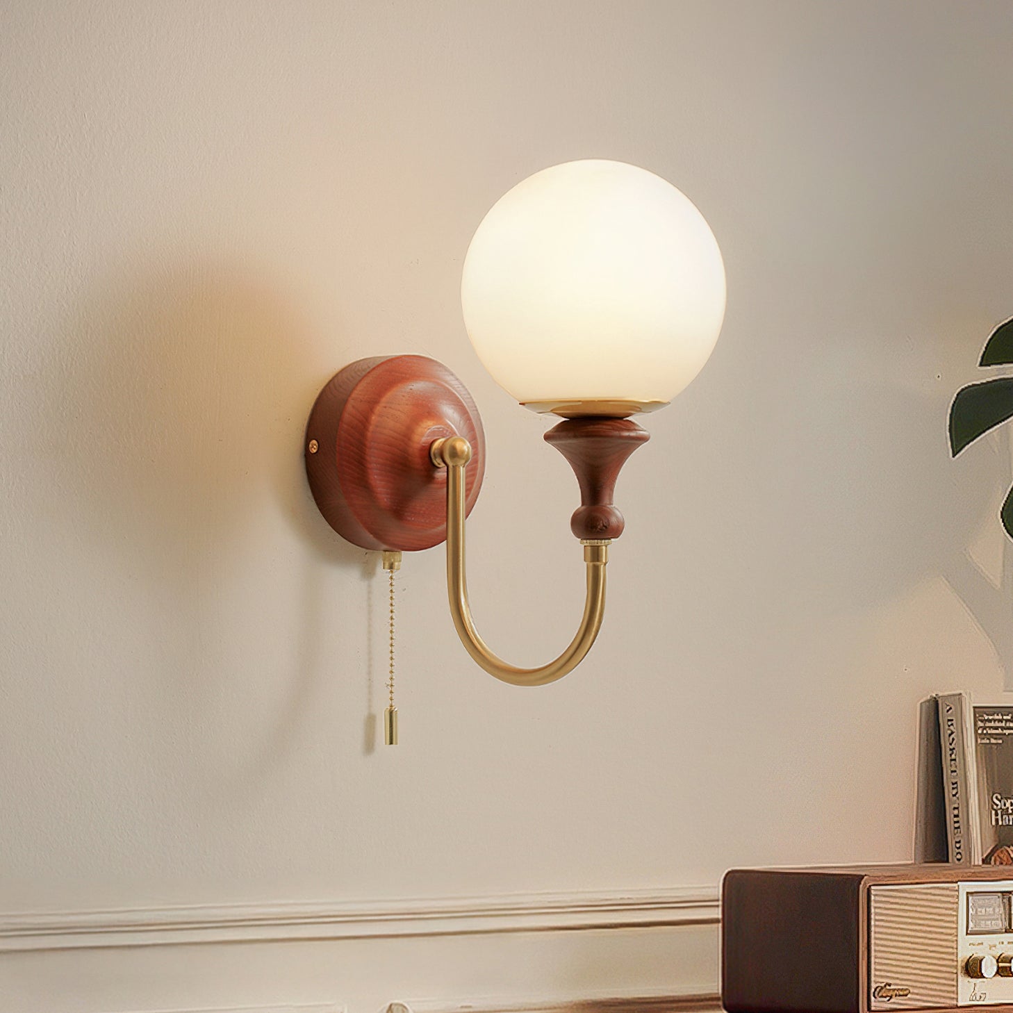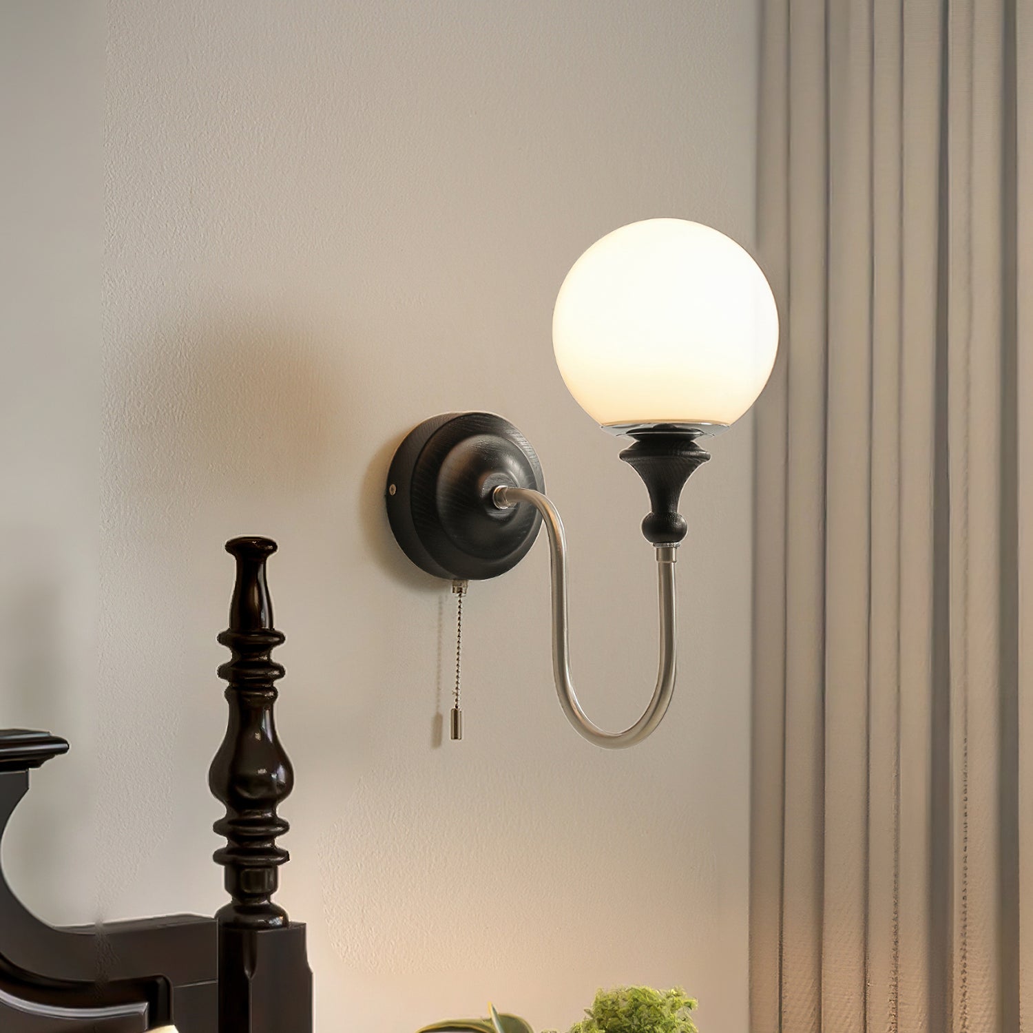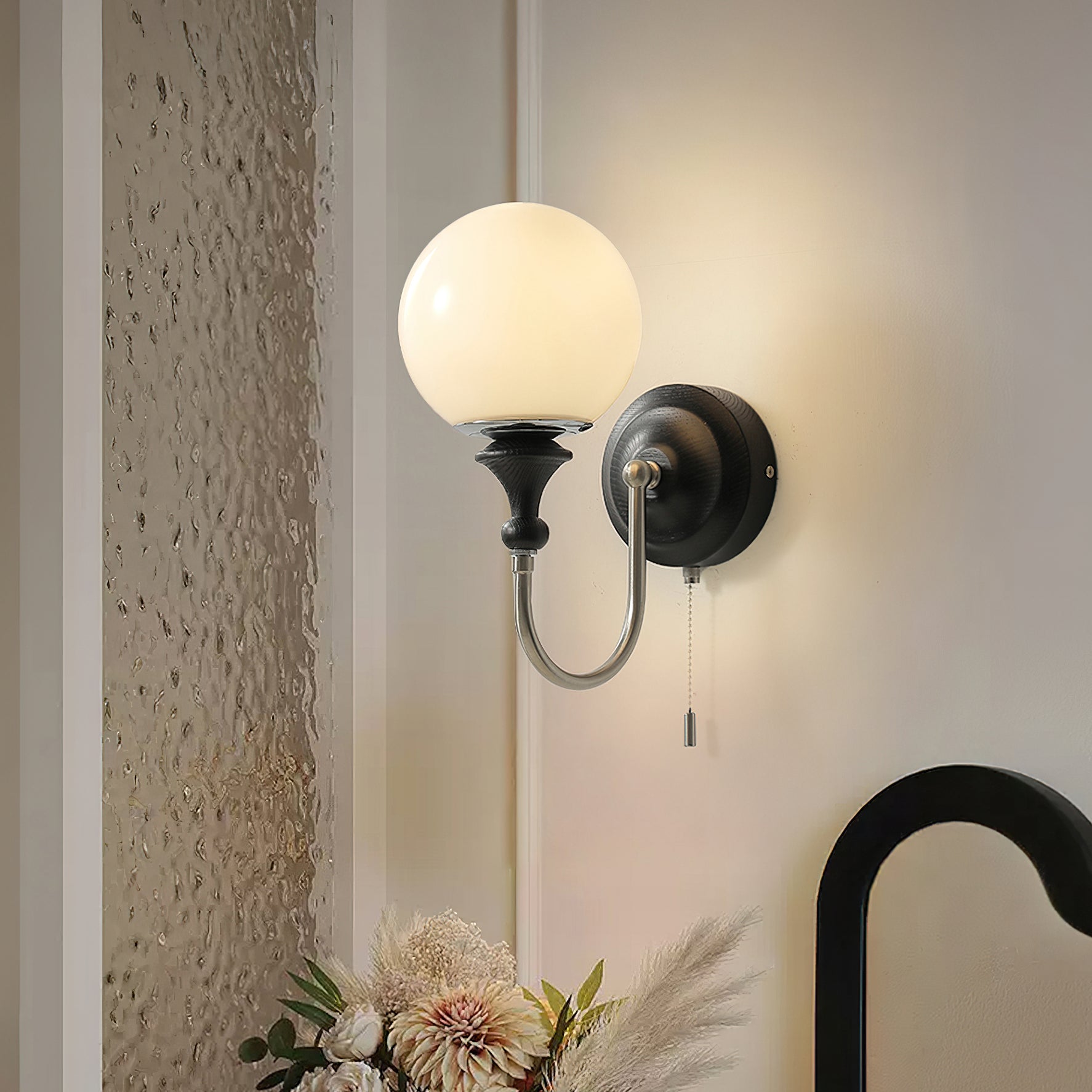 The Brunel Wall Lamp from Mooijane combines a rounded glass shade with the timeless elegance of wood and metal. Suspended from a sleek, curved metal arm, the spherical glass diffuses light softly, creating a warm and inviting ambiance. A wooden base adds natural charm, while the pull-chain switch provides functional, classic style. Perfect for bedrooms, living rooms, or hallways, it blends modern simplicity with enduring craftsmanship.