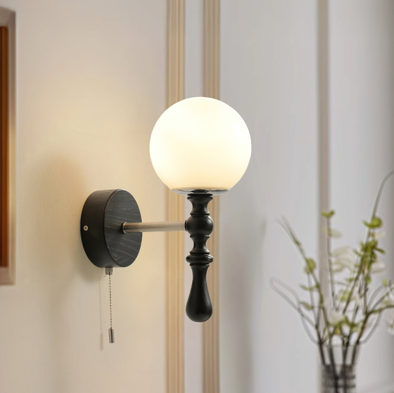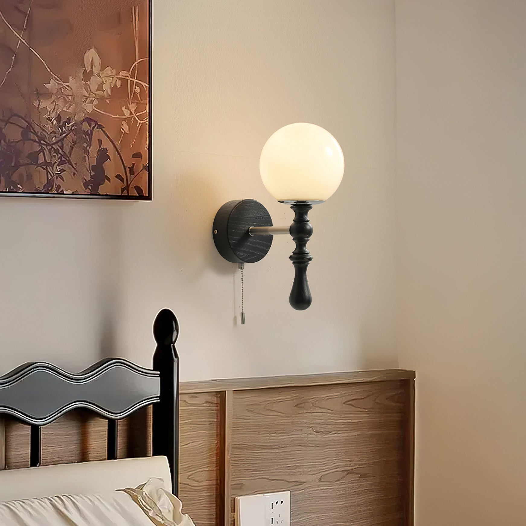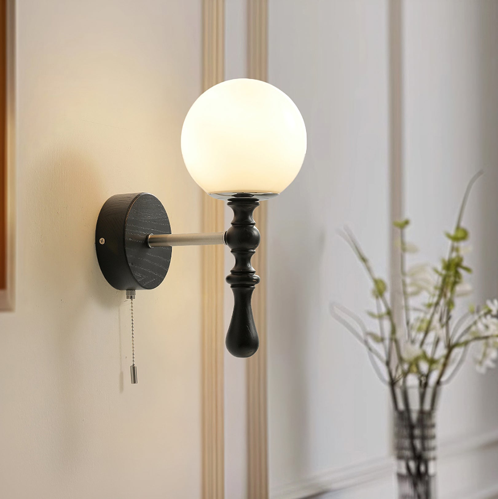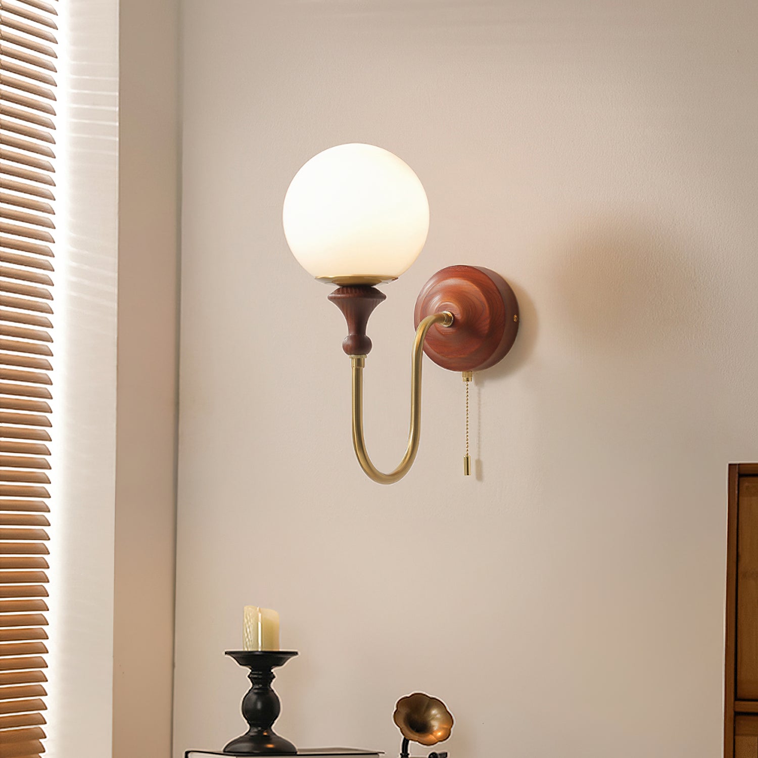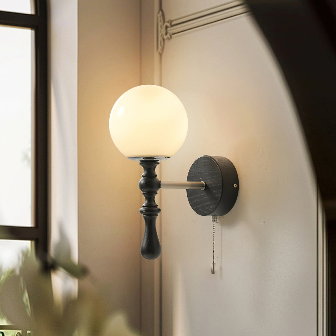 The Brunel Wall Lamp from Mooijane combines a rounded glass shade with the timeless elegance of wood and metal. Suspended from a sleek, curved metal arm, the spherical glass diffuses light softly, creating a warm and inviting ambiance. A wooden base adds natural charm, while the pull-chain switch provides functional, classic style. Perfect for bedrooms, living rooms, or hallways, it blends modern simplicity with enduring craftsmanship.