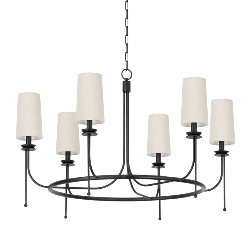 Striking yet streamlined in design, the Calder Chandelier is a classic addition to your dining room or living room. The elegant ring structure and extended tails are made from forged iron and feature natural linen shades.