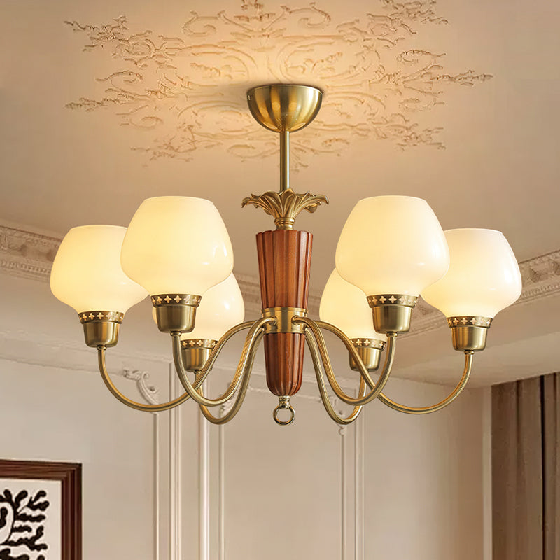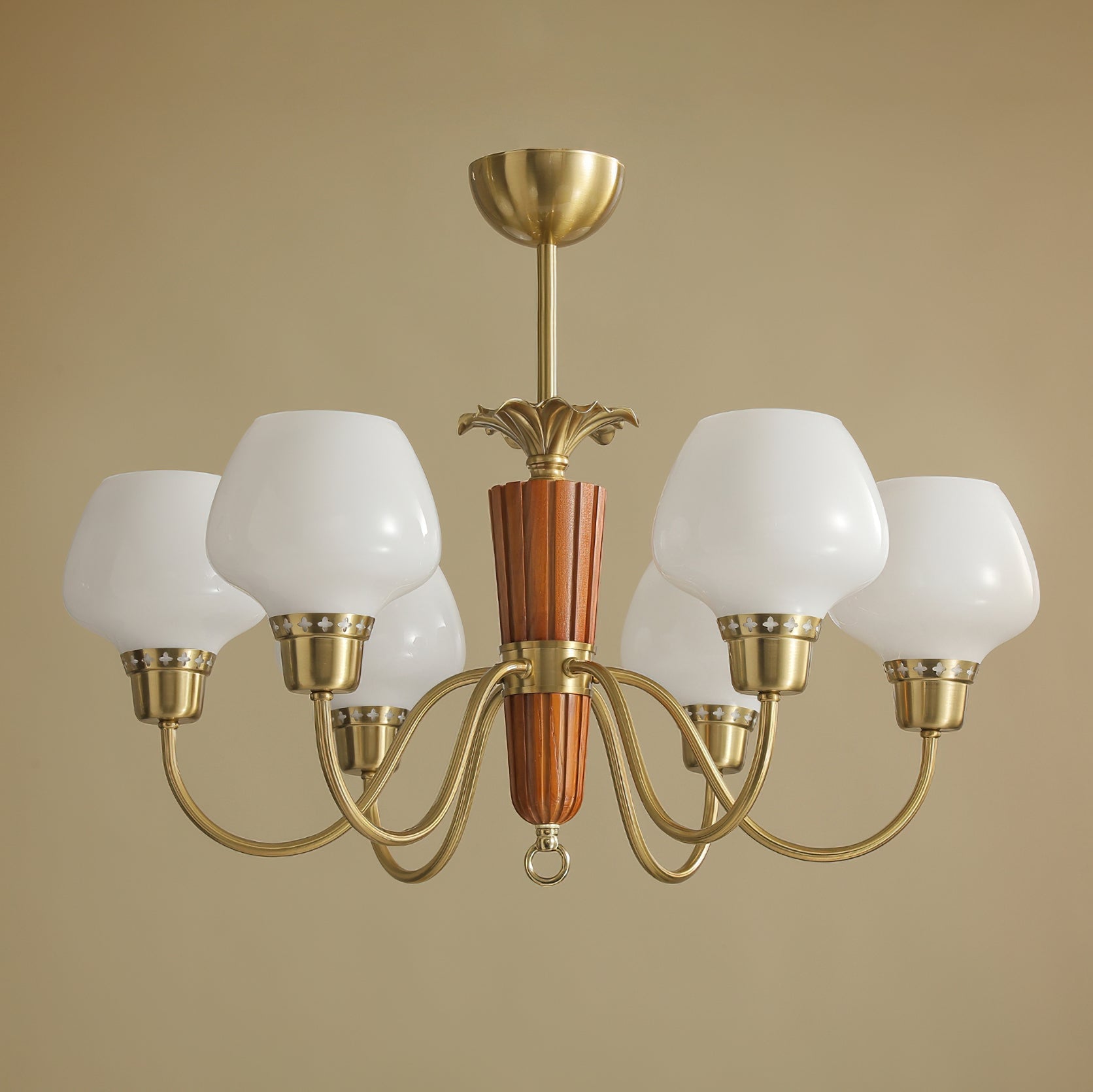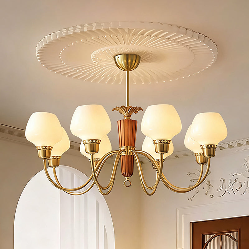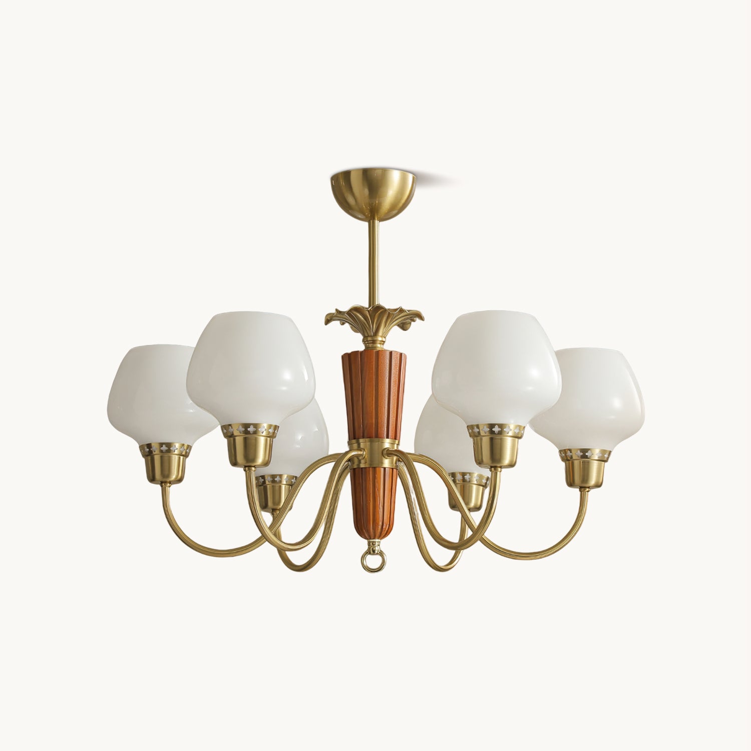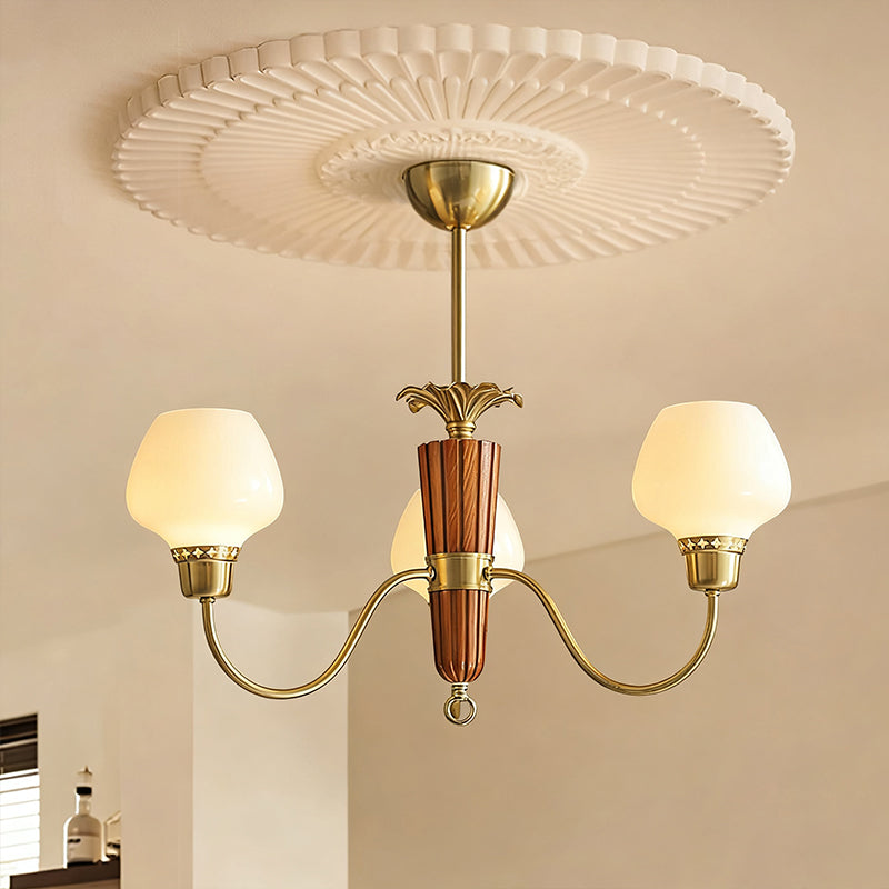 The Calvani Chandelier from Mooijane combines wood, metal, and glass to create a timeless and elegant design. A central wooden column adds warmth, while golden metal arms extend outward, each holding a frosted glass shade that softly diffuses light. Floral-shaped metal accents enhance its vintage charm. Perfect for dining rooms, living areas, or foyers, this chandelier delivers both functional lighting and refined sophistication.