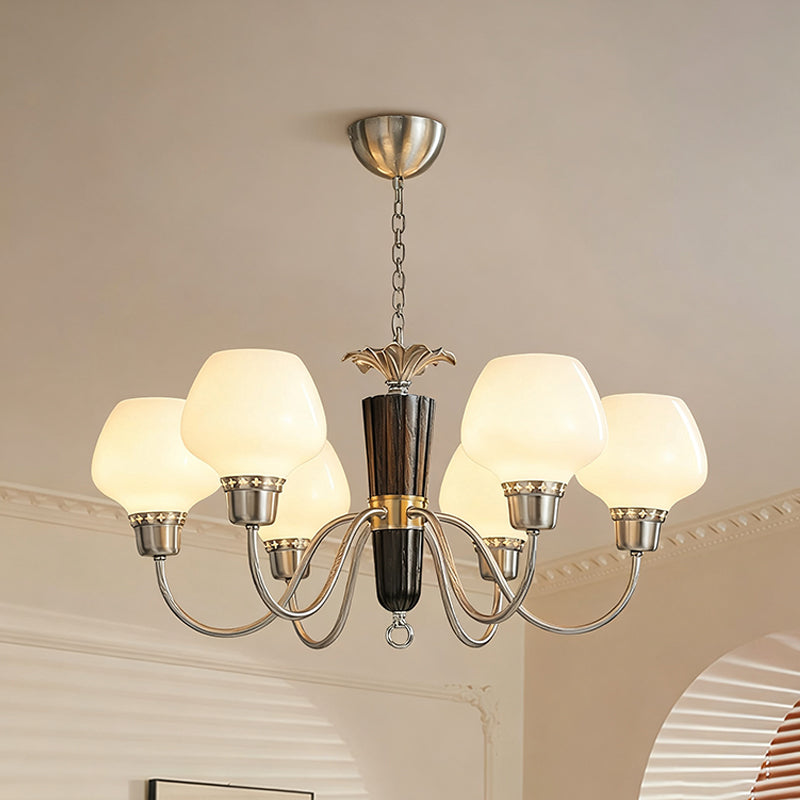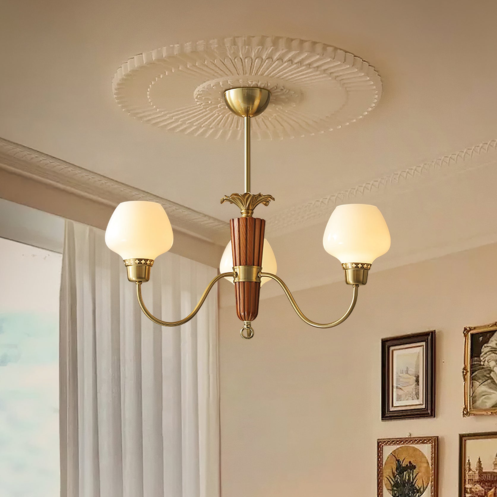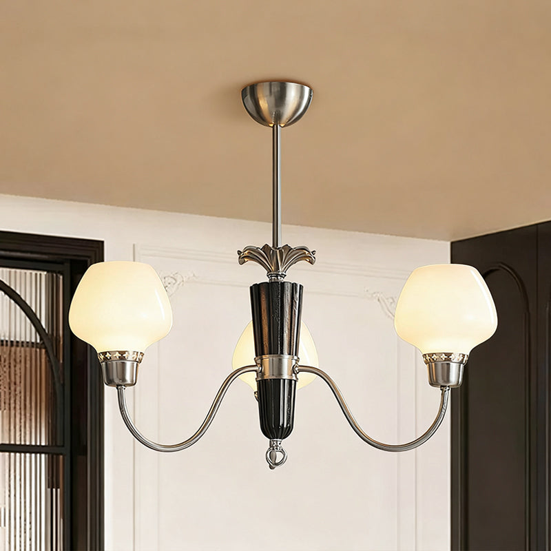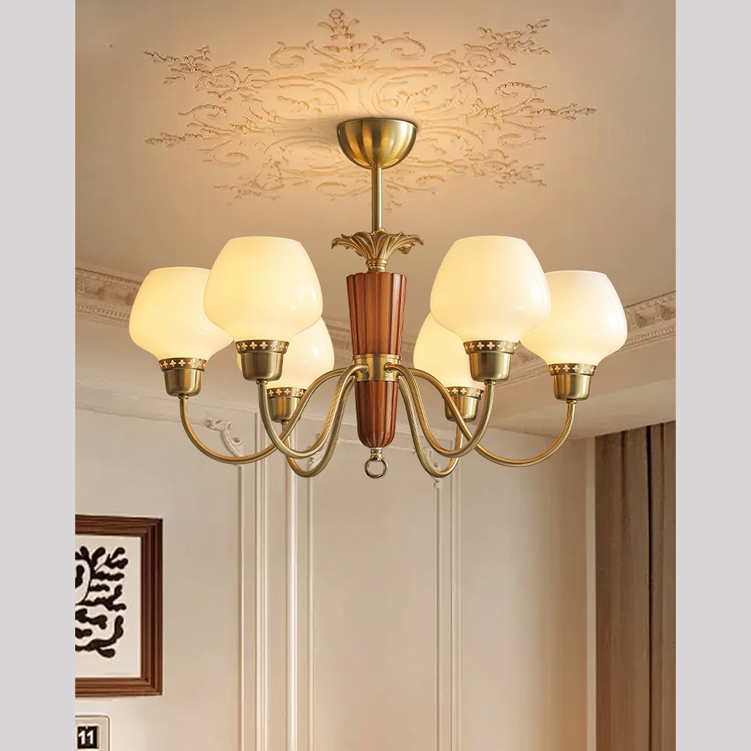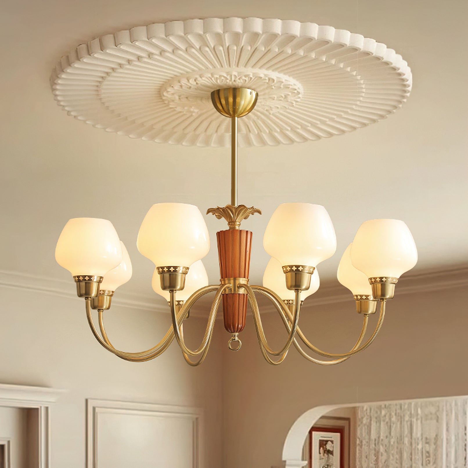 The Calvani Chandelier from Mooijane combines wood, metal, and glass to create a timeless and elegant design. A central wooden column adds warmth, while golden metal arms extend outward, each holding a frosted glass shade that softly diffuses light. Floral-shaped metal accents enhance its vintage charm. Perfect for dining rooms, living areas, or foyers, this chandelier delivers both functional lighting and refined sophistication.