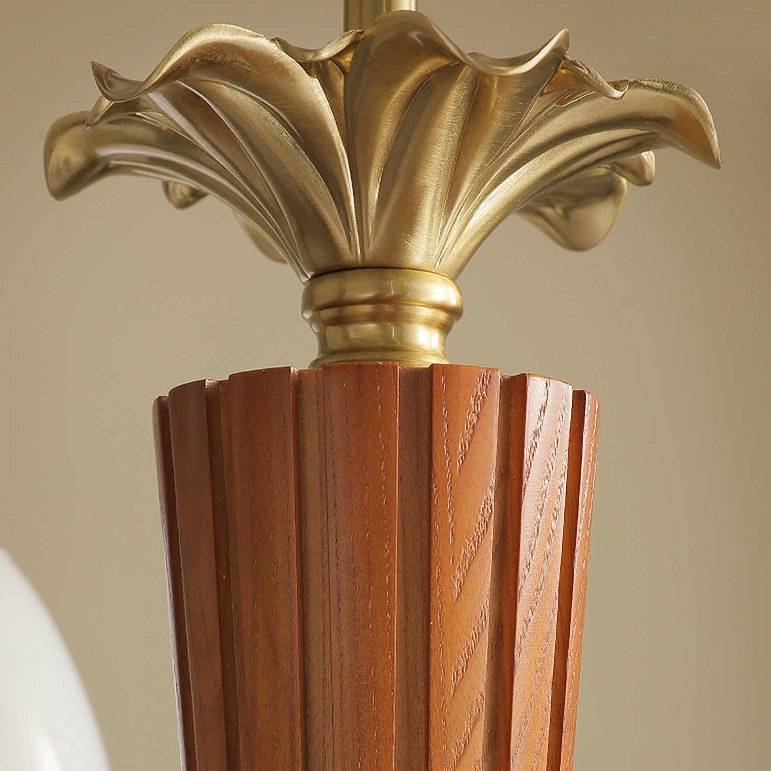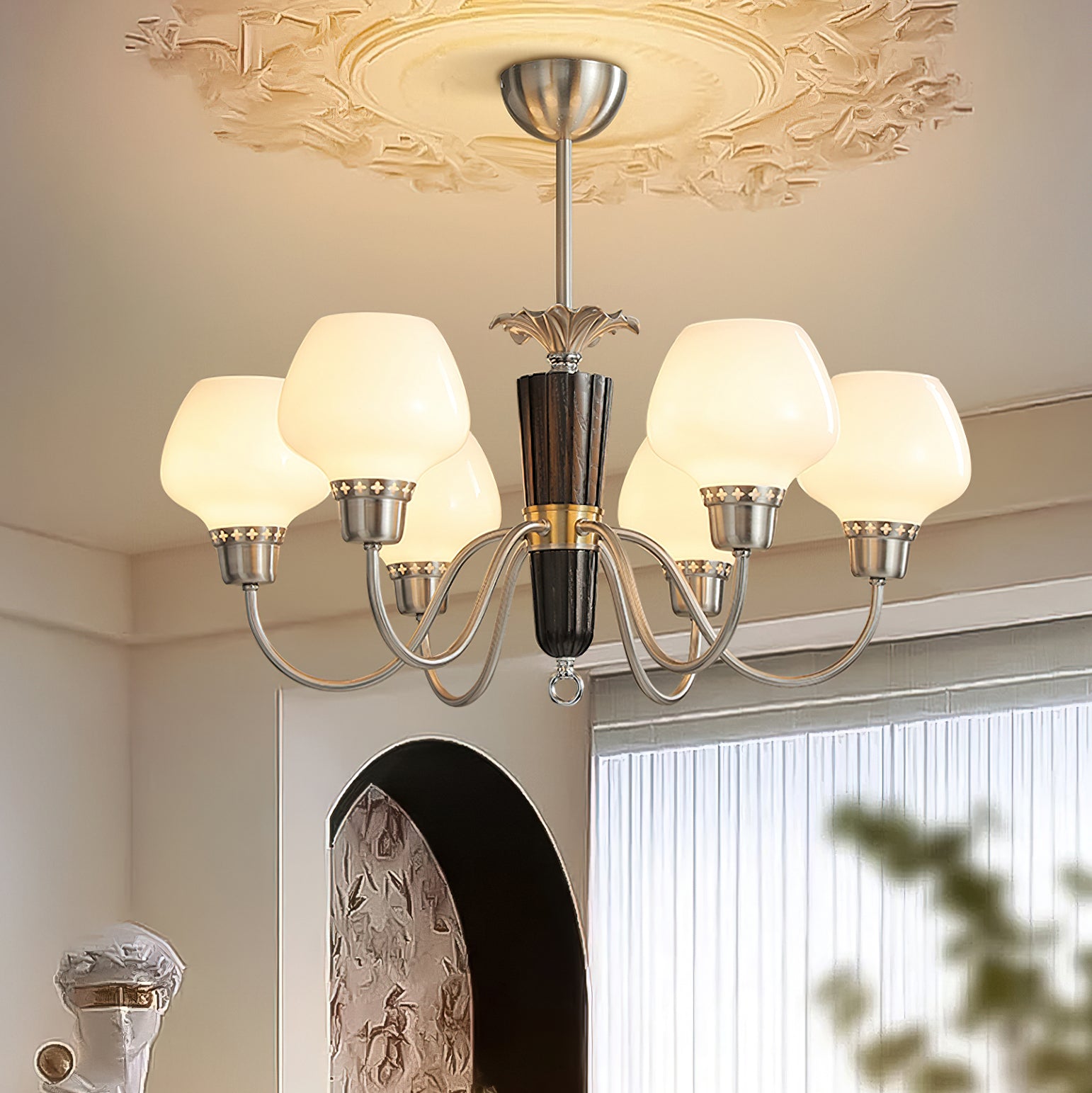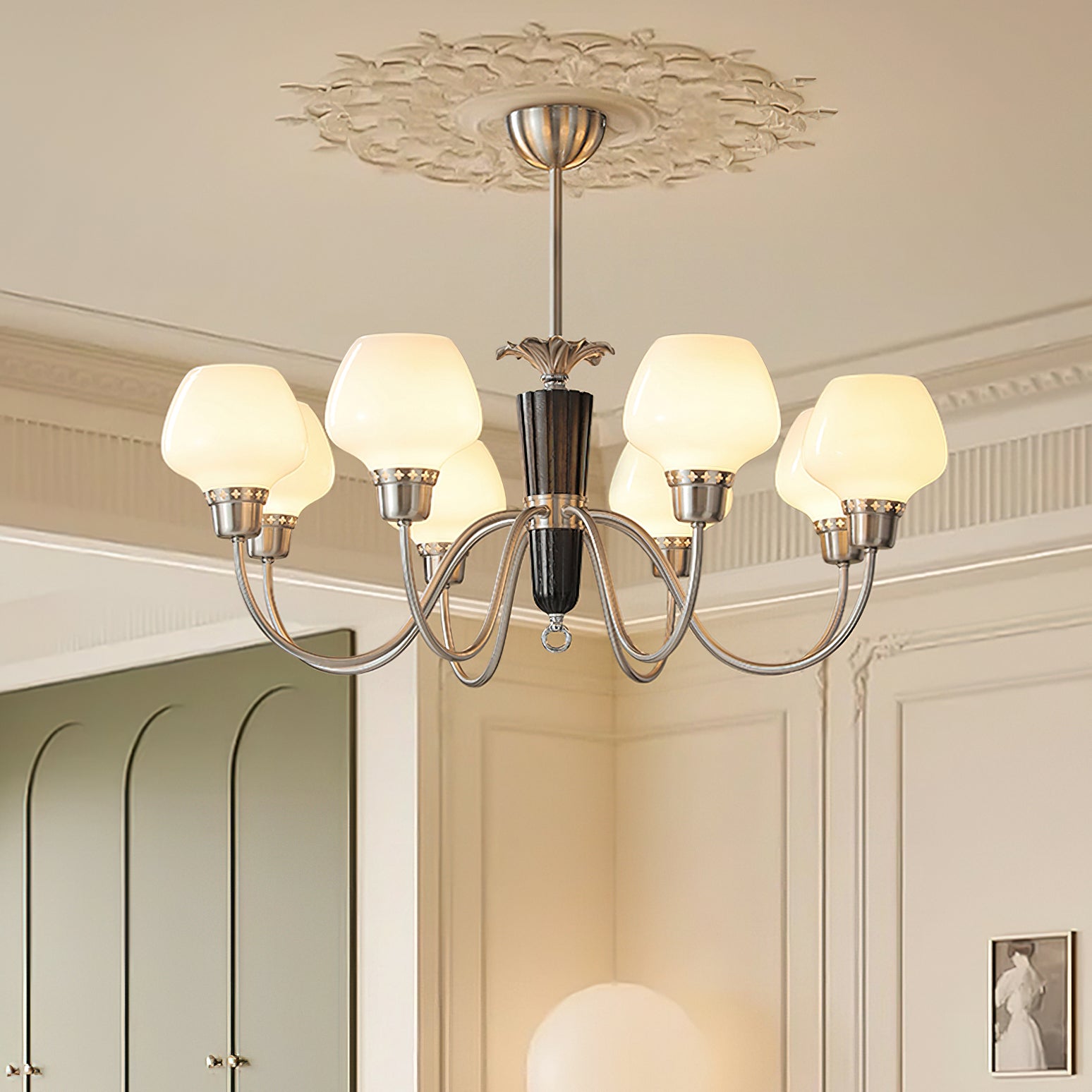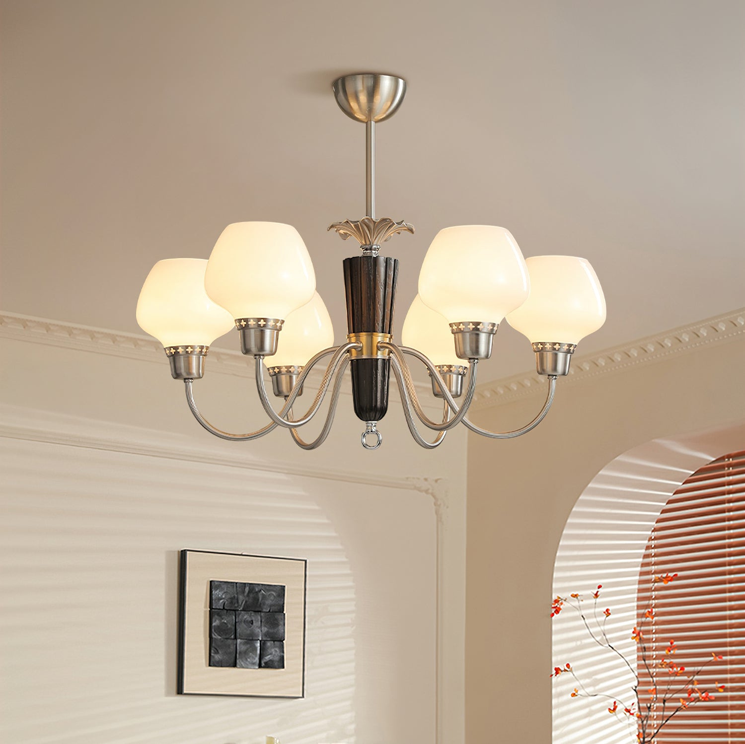 The Calvani Chandelier from Mooijane combines wood, metal, and glass to create a timeless and elegant design. A central wooden column adds warmth, while golden metal arms extend outward, each holding a frosted glass shade that softly diffuses light. Floral-shaped metal accents enhance its vintage charm. Perfect for dining rooms, living areas, or foyers, this chandelier delivers both functional lighting and refined sophistication.
