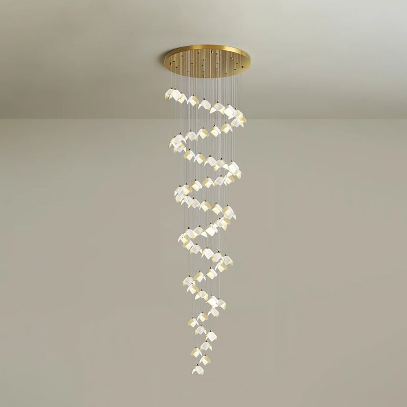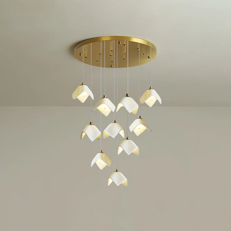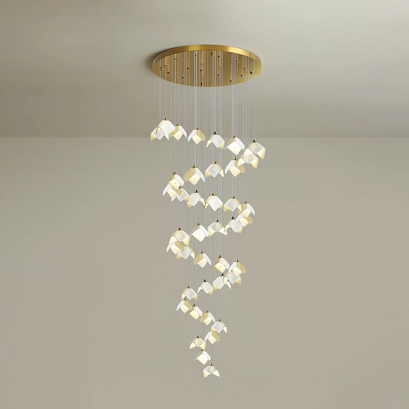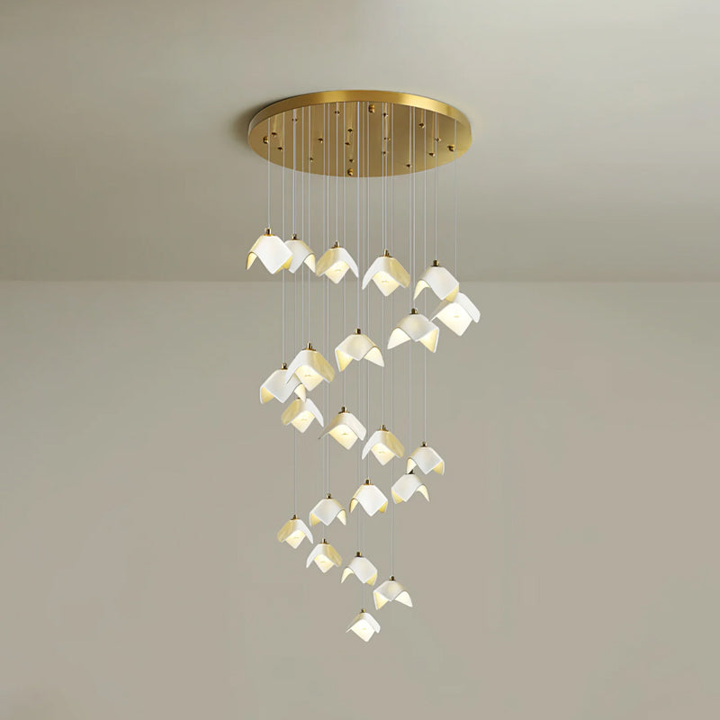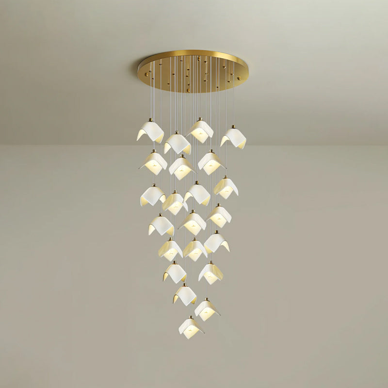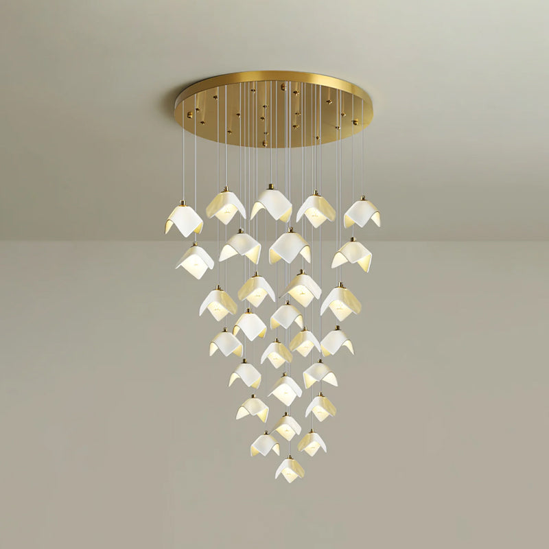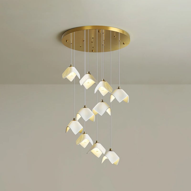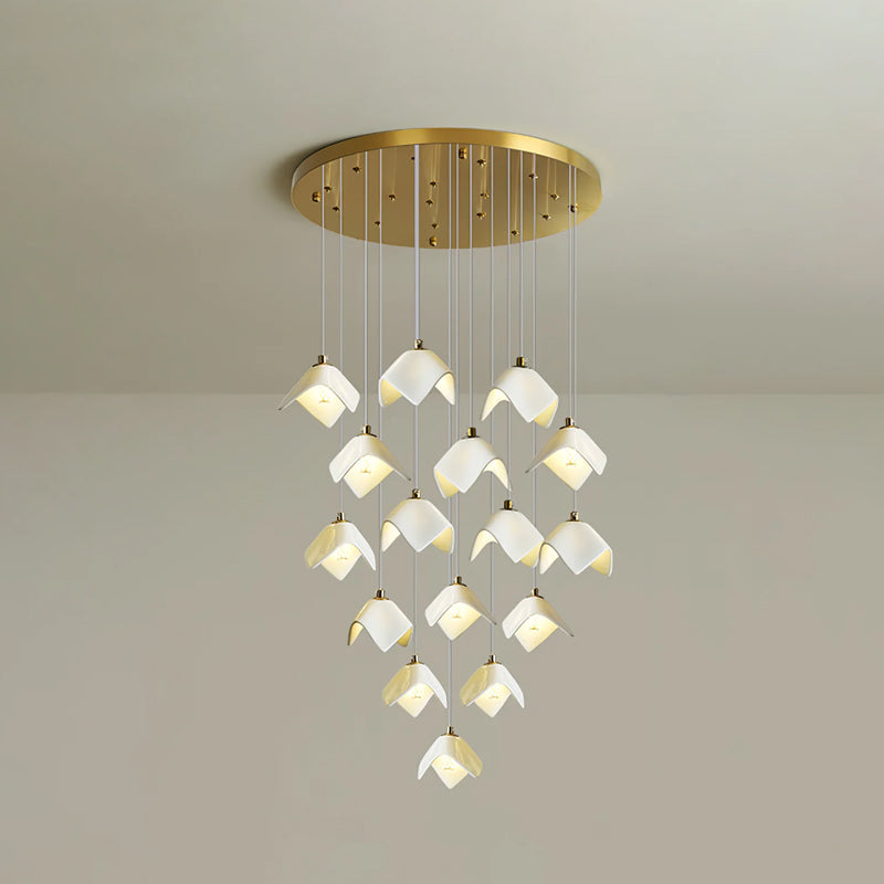 The Calvella Chandelier by Mooijane showcases a refined blend of electroplated iron and ceramic, forming a cascading silhouette inspired by delicate flower petals. Each ceramic element is artfully suspended to create a soft, organic glow that brings both warmth and elegance to the space. With its sculptural presence and graceful detail, the Calvella is a statement piece ideal for dining areas, entryways, or living rooms seeking a touch of sophisticated, nature-inspired charm.