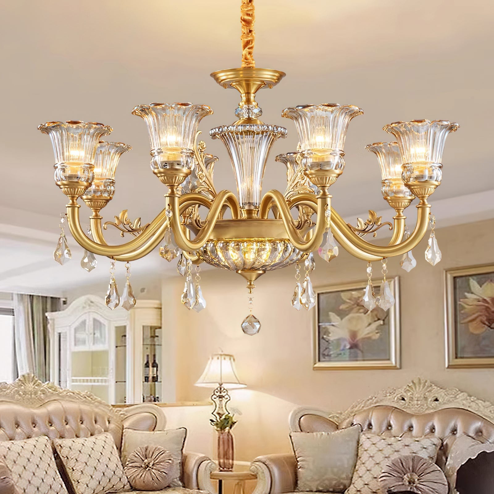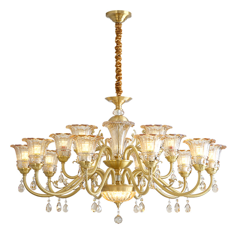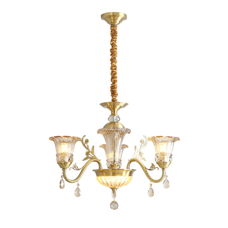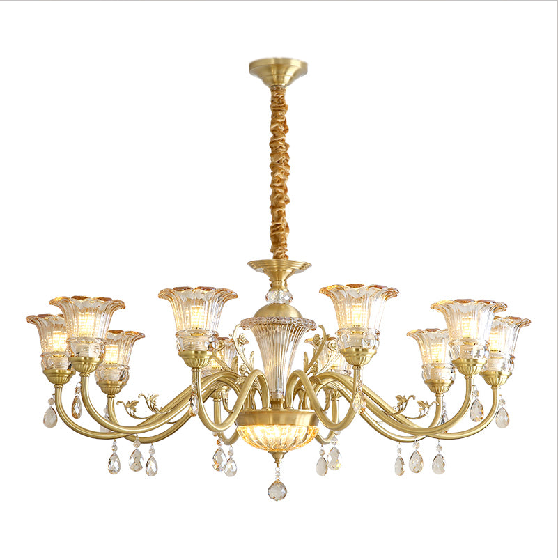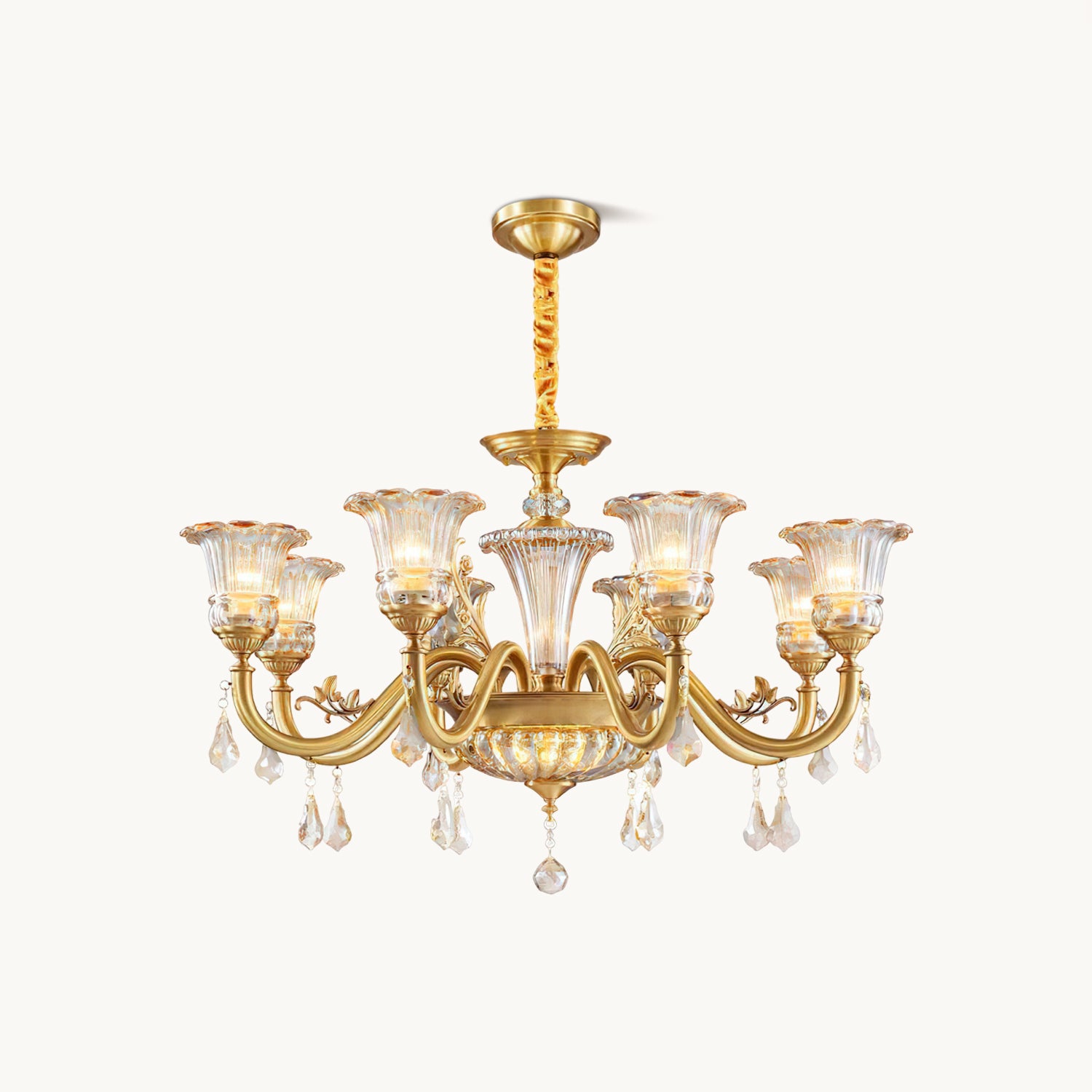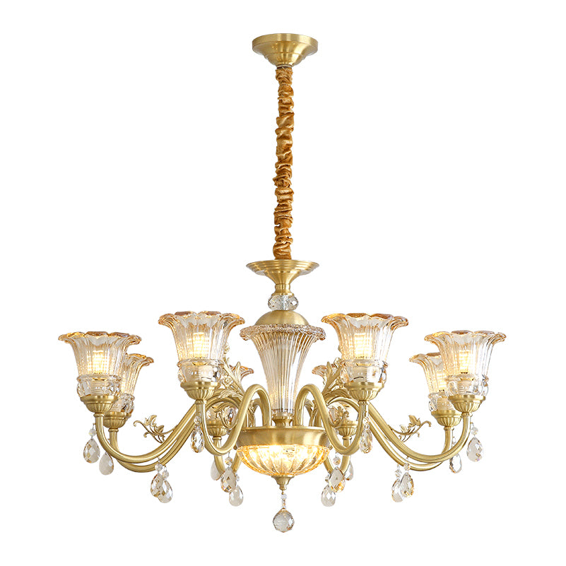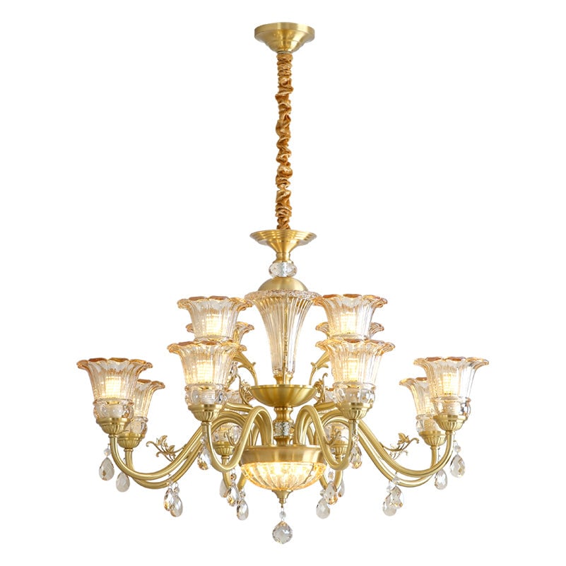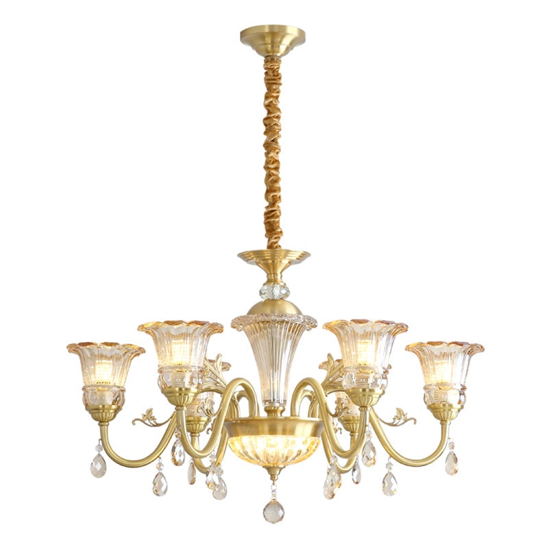 The Camelot Chandelier by Mooijane embodies timeless European elegance with its graceful silhouette and radiant brass finish. A fluted glass shade, shaped like a blooming flower, gently refracts light to create a soft, romantic glow. Crystal droplets add a touch of sparkle, while sculpted brass details and flowing curves enhance its luxurious charm. Perfect for dining rooms, living spaces, or grand entryways, this chandelier infuses any interior with warmth, opulence, and refined beauty.