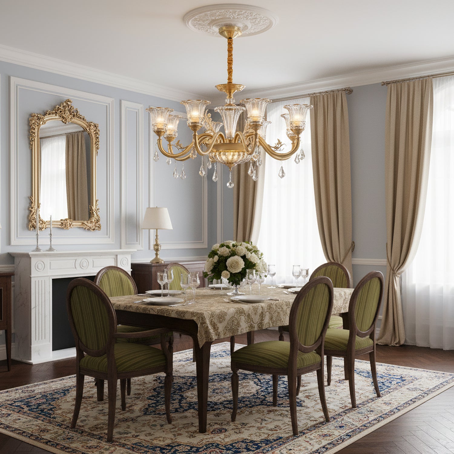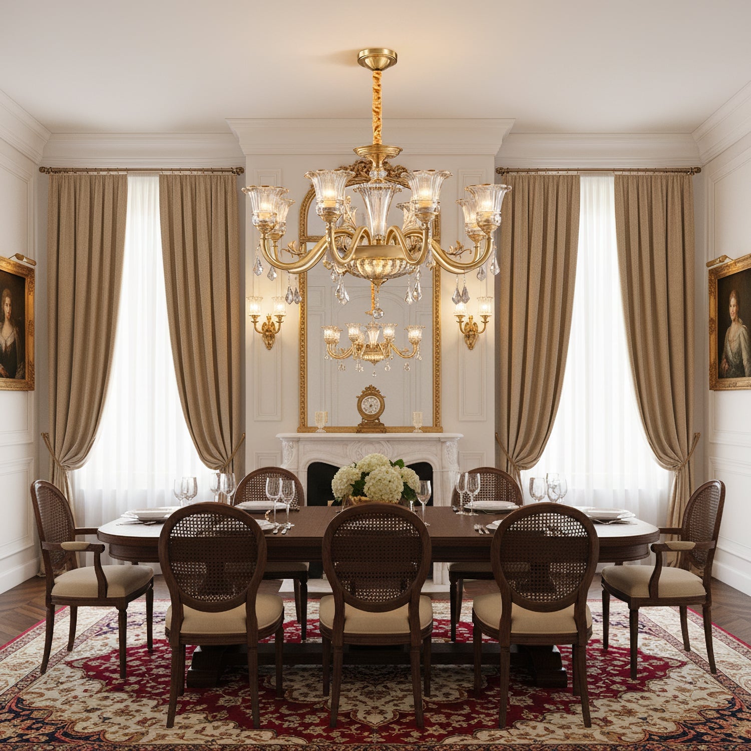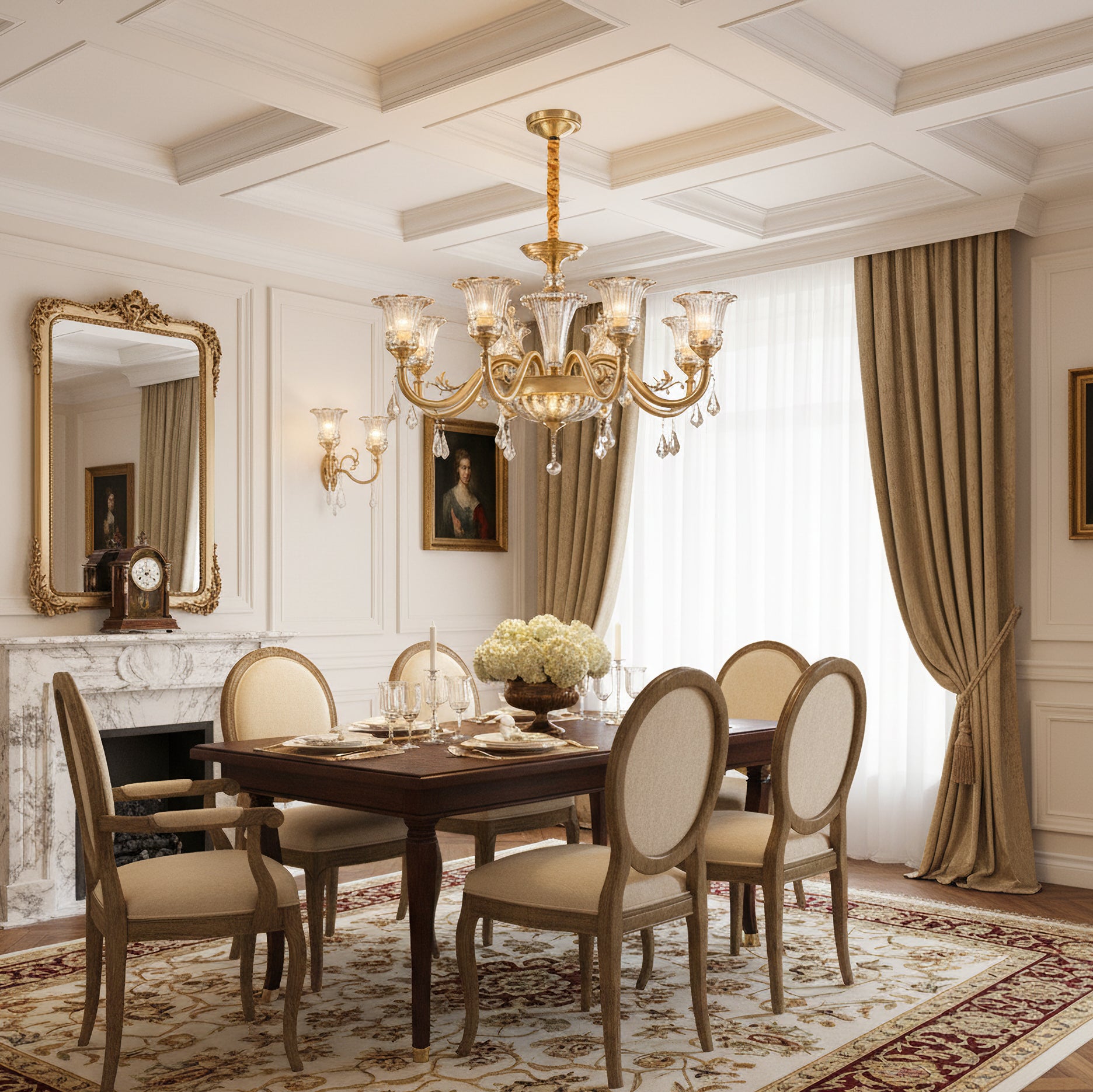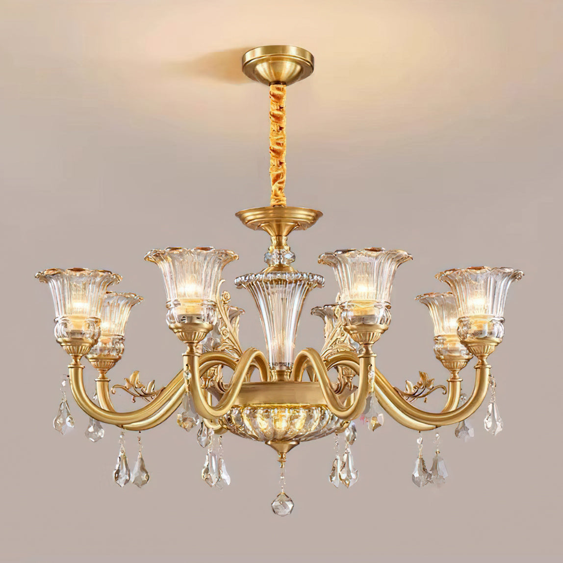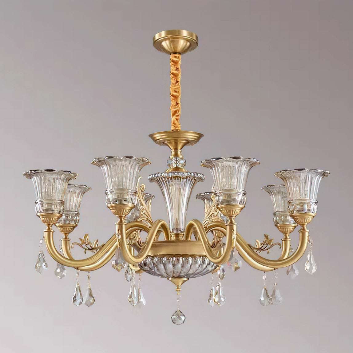 The Camelot Chandelier by Mooijane embodies timeless European elegance with its graceful silhouette and radiant brass finish. A fluted glass shade, shaped like a blooming flower, gently refracts light to create a soft, romantic glow. Crystal droplets add a touch of sparkle, while sculpted brass details and flowing curves enhance its luxurious charm. Perfect for dining rooms, living spaces, or grand entryways, this chandelier infuses any interior with warmth, opulence, and refined beauty.